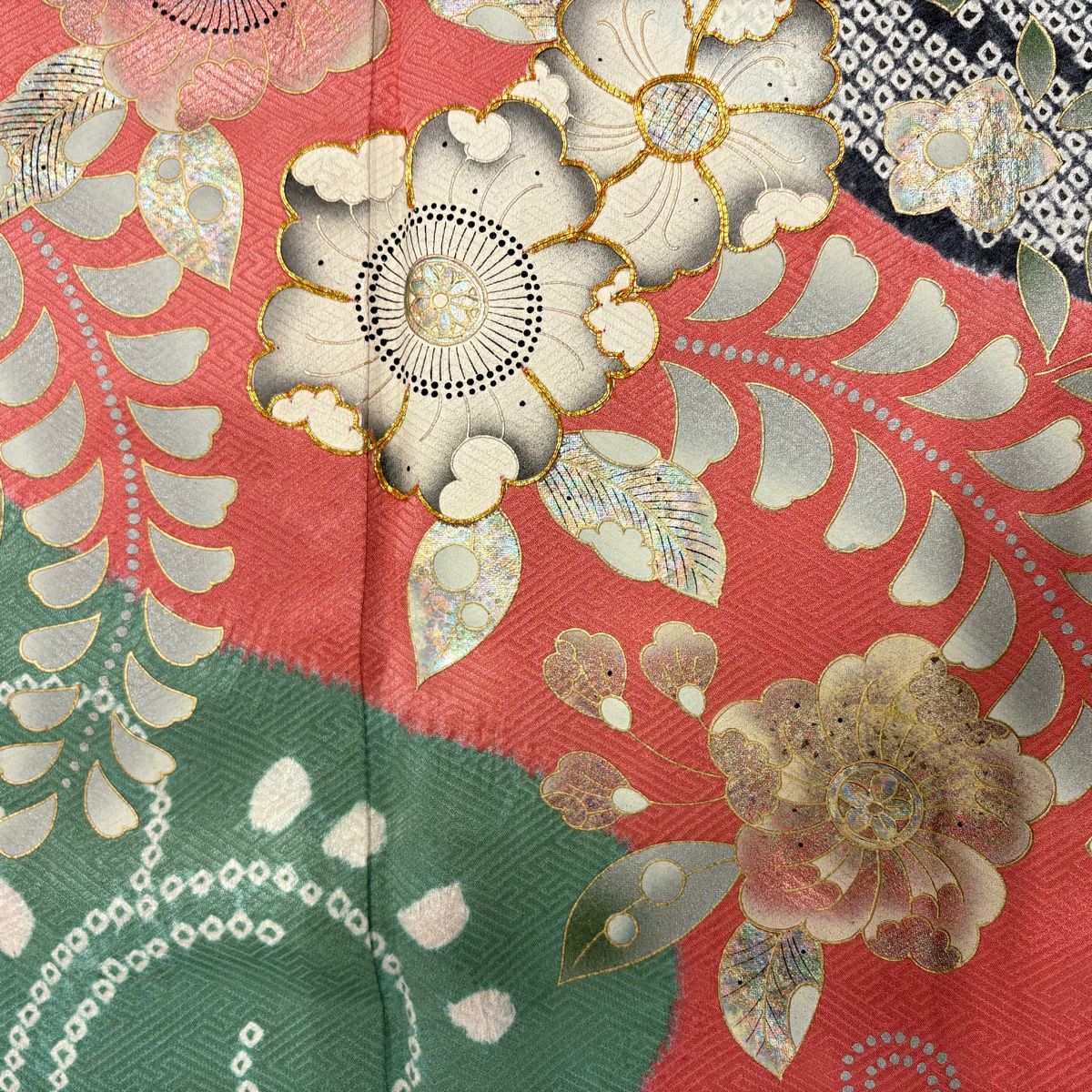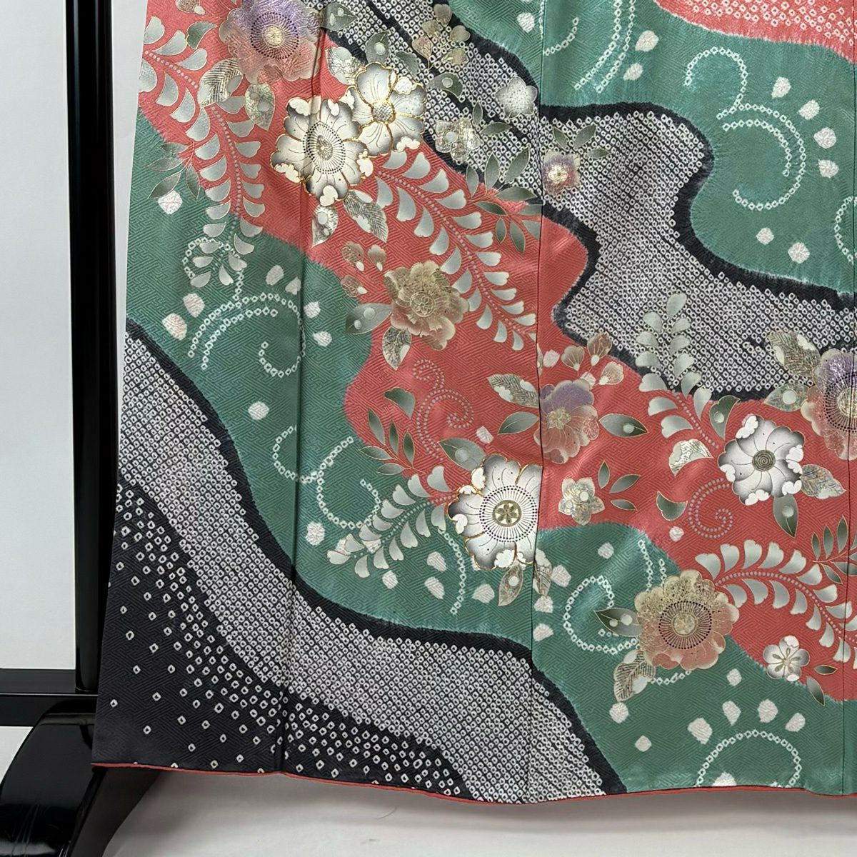 【美品】 振袖 身丈171cm 裄丈65cm M 袷 袋帯フルセット 鈴 草花 箔 金糸 青緑 正絹 秀品