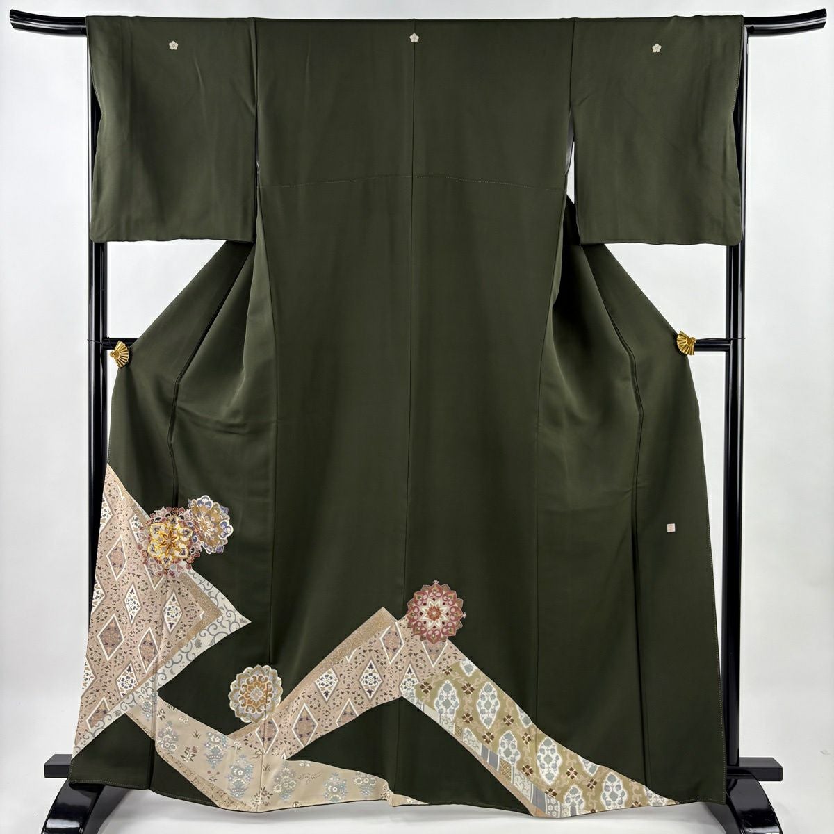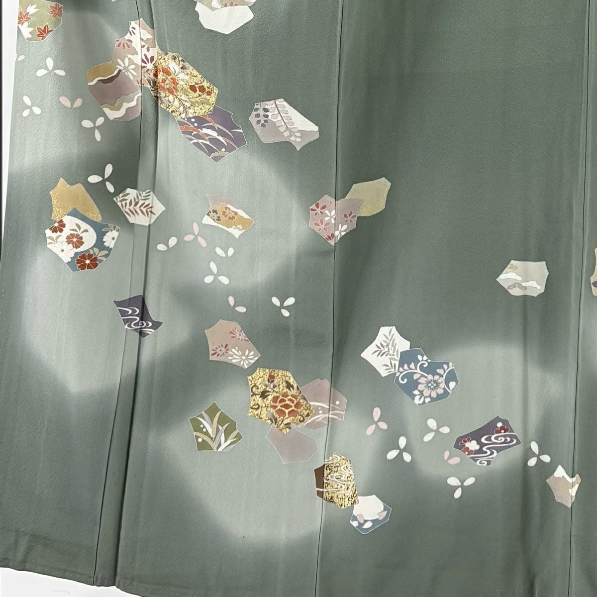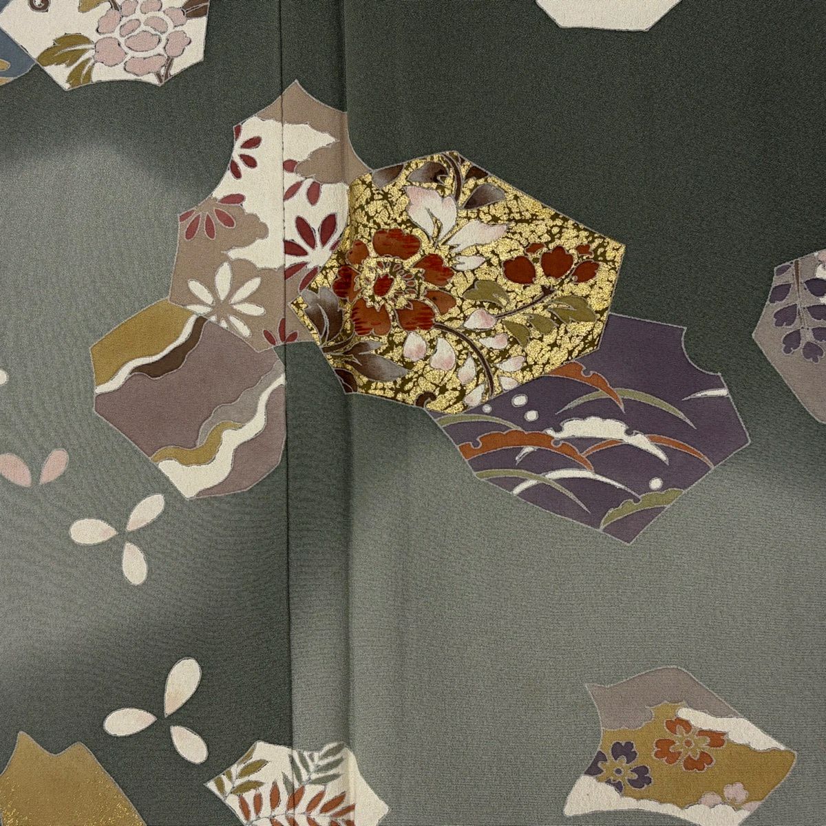 30%OFF 訪問着 身丈156cm 裄丈66cm M 袷 貝合わせ 草花 金銀彩 灰緑 正絹 秀品 K30