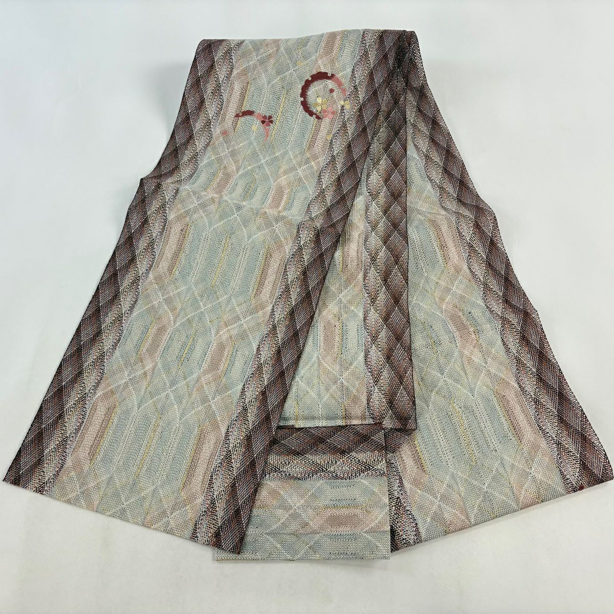 【美品】 紬 身丈170.5cm 裄丈67.5cm L 袷 名古屋帯セット 縞 幾何学模様 焦茶色 正絹 秀品
