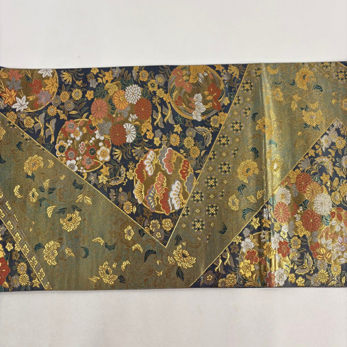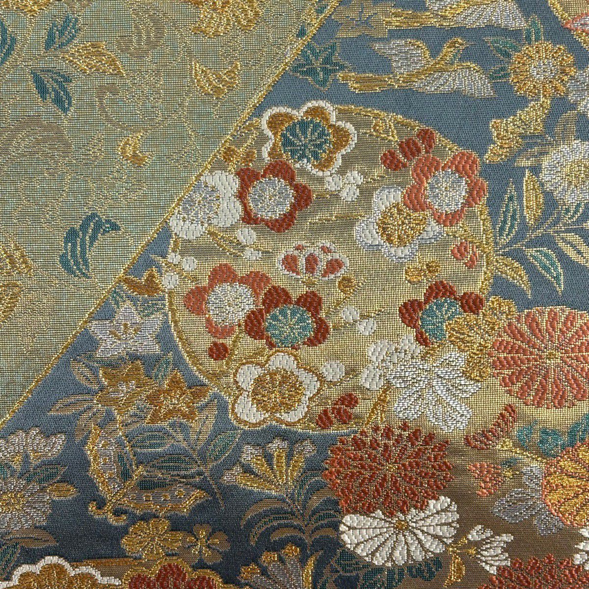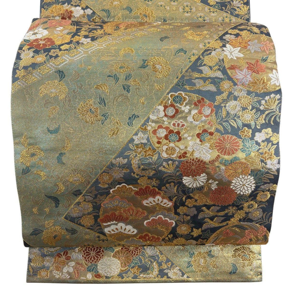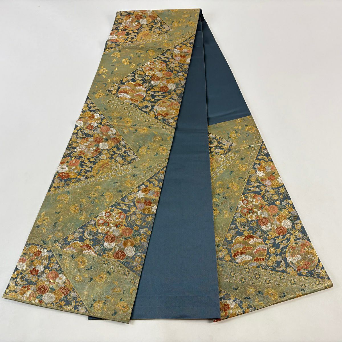 30%OFF 【美品】 袋帯 秀品 彫金 関西仕立て 裂取花丸尽し 金糸 箔 青灰色 六通 正絹 K30