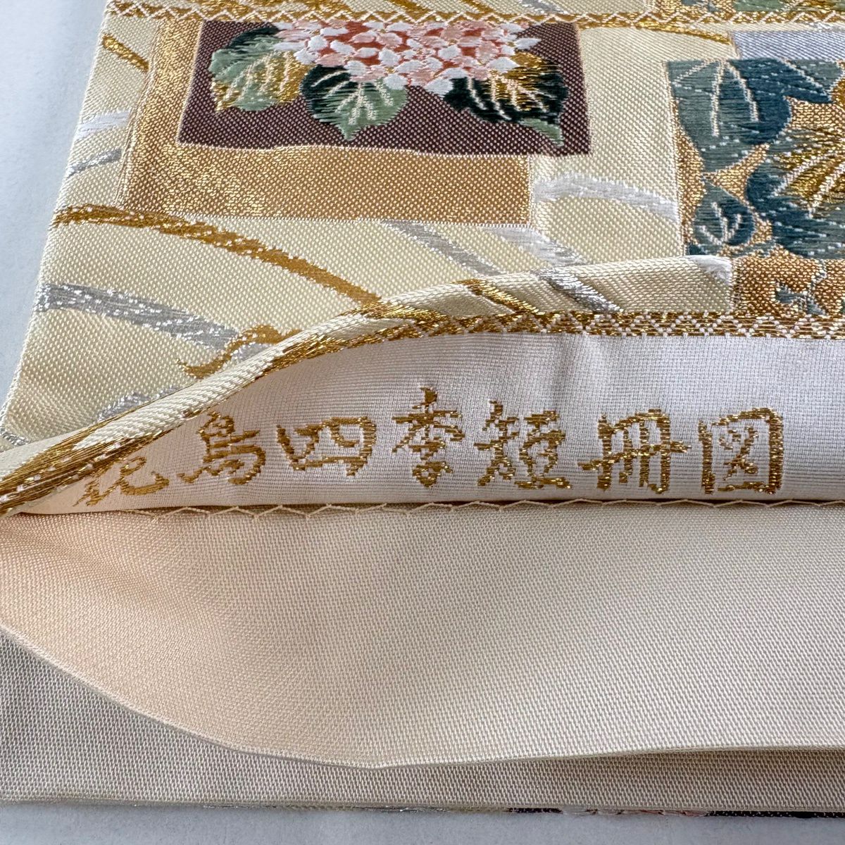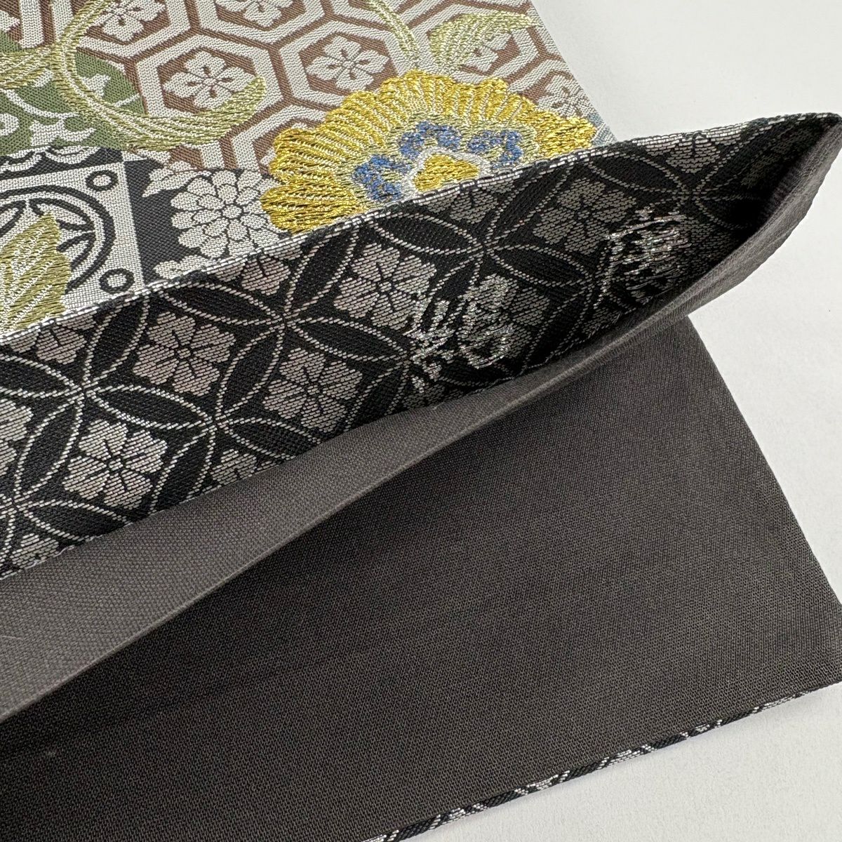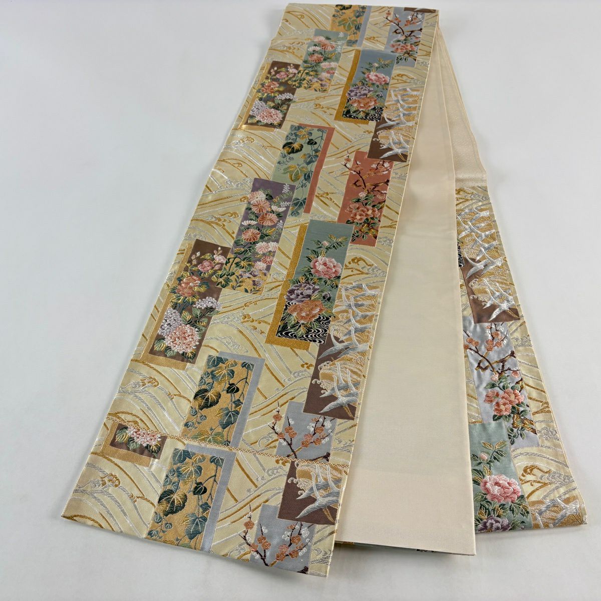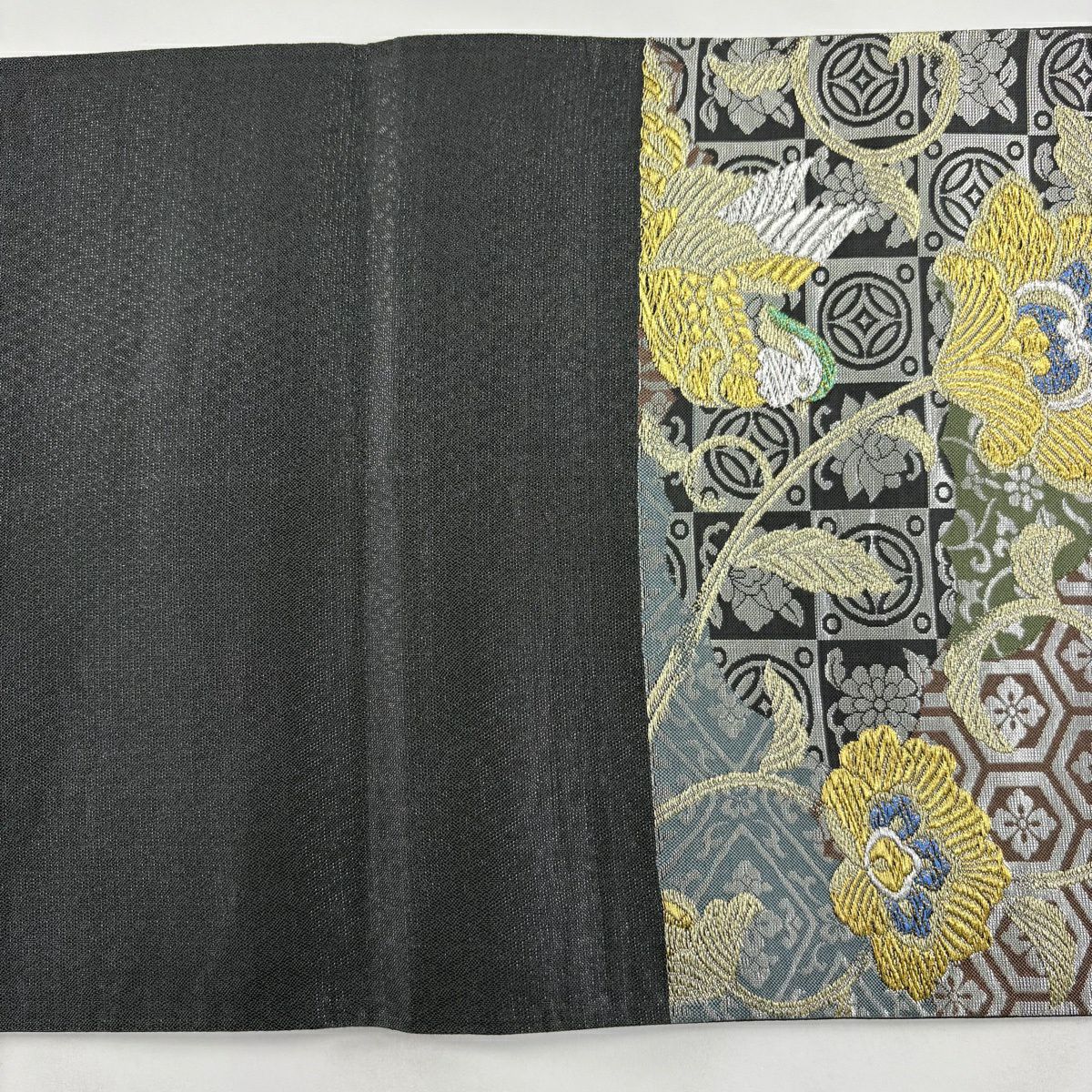 30%OFF 【美品】 袋帯 秀品 彫金 関西仕立て 裂取花丸尽し 金糸 箔 青灰色 六通 正絹 K30