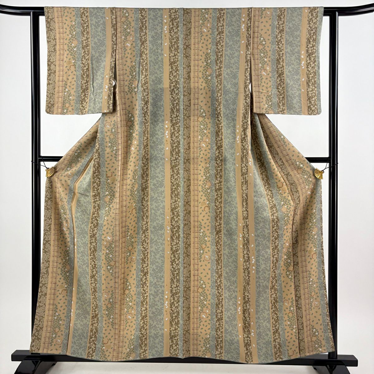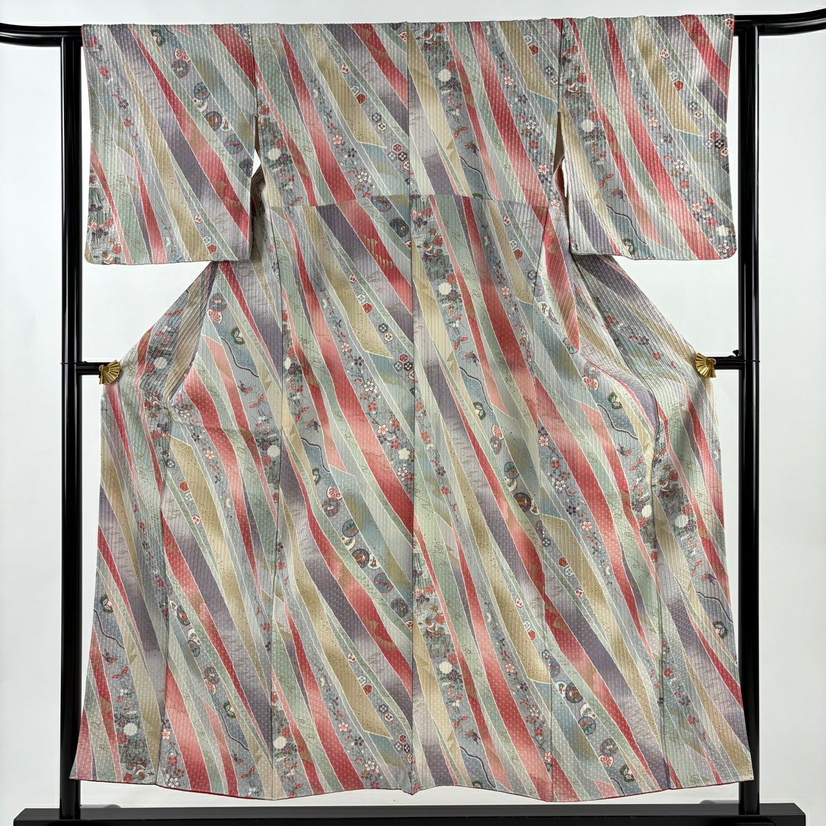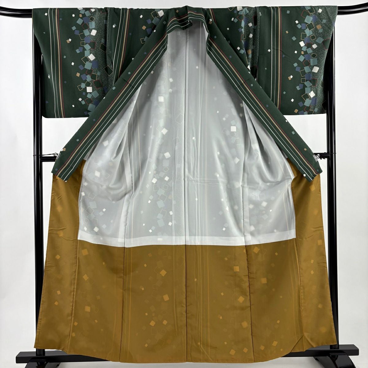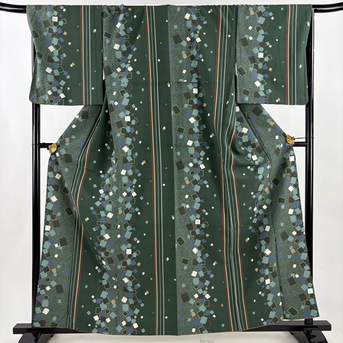 30%OFF 【美品】 小紋 身丈160cm 裄丈69cm L 袷 縦縞 幾何学 灰緑 化繊 秀品 K30