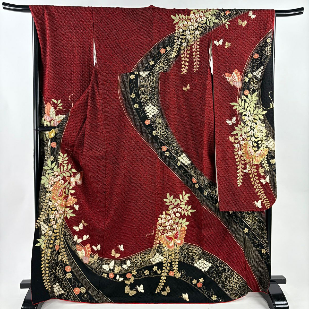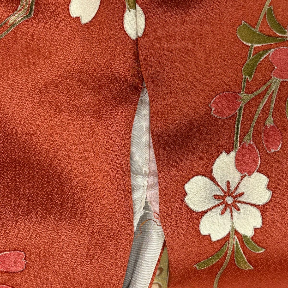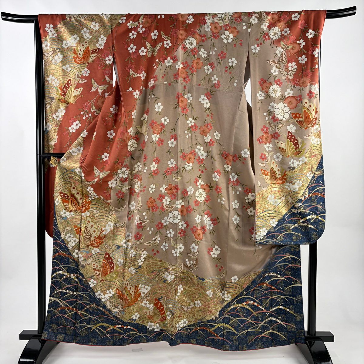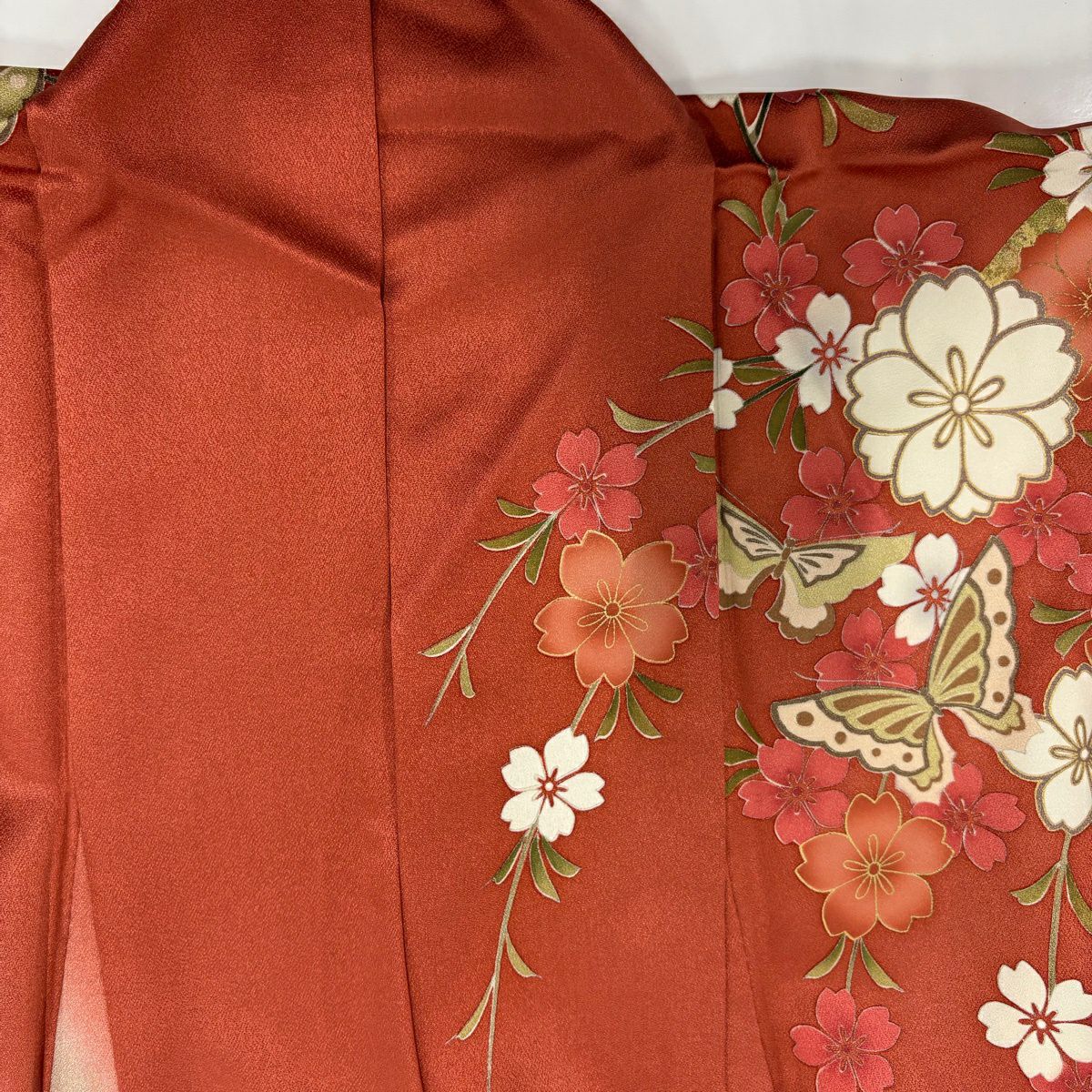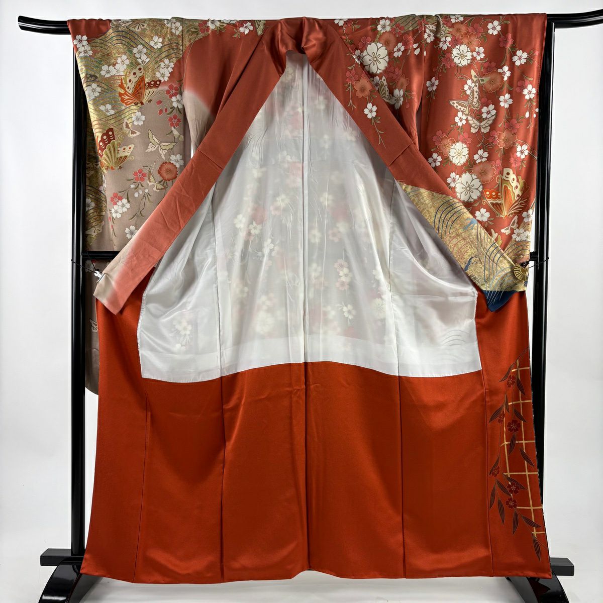 30%OFF 振袖 身丈162cm 裄丈69cm L 袷 枝垂れ桜 蝶 金糸 金彩 朱色 正絹 秀品 K30