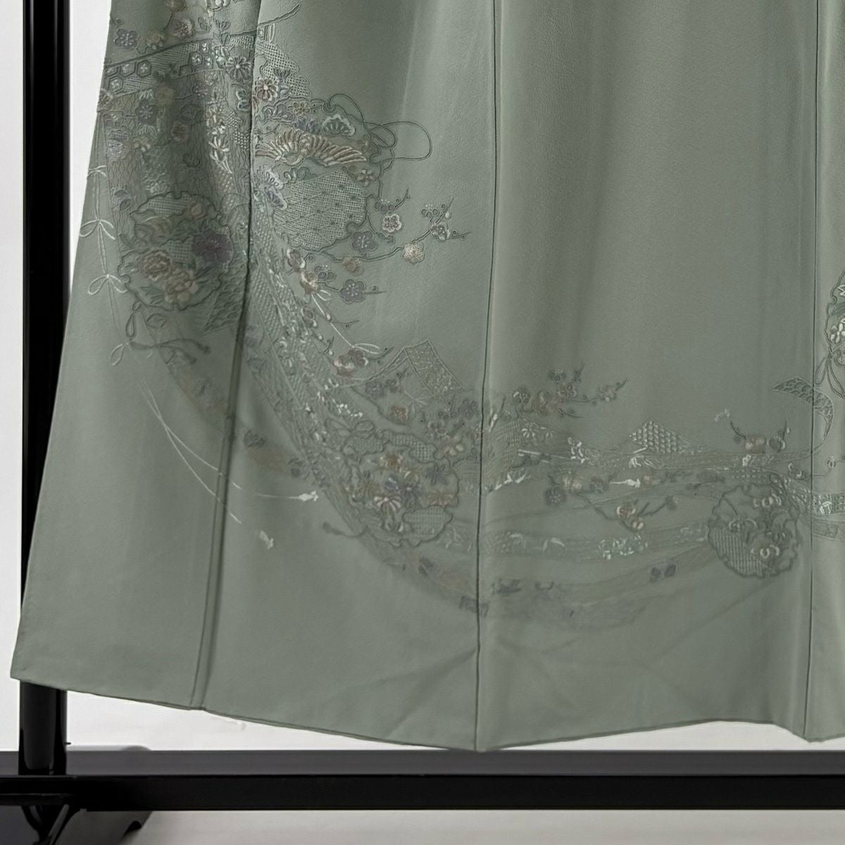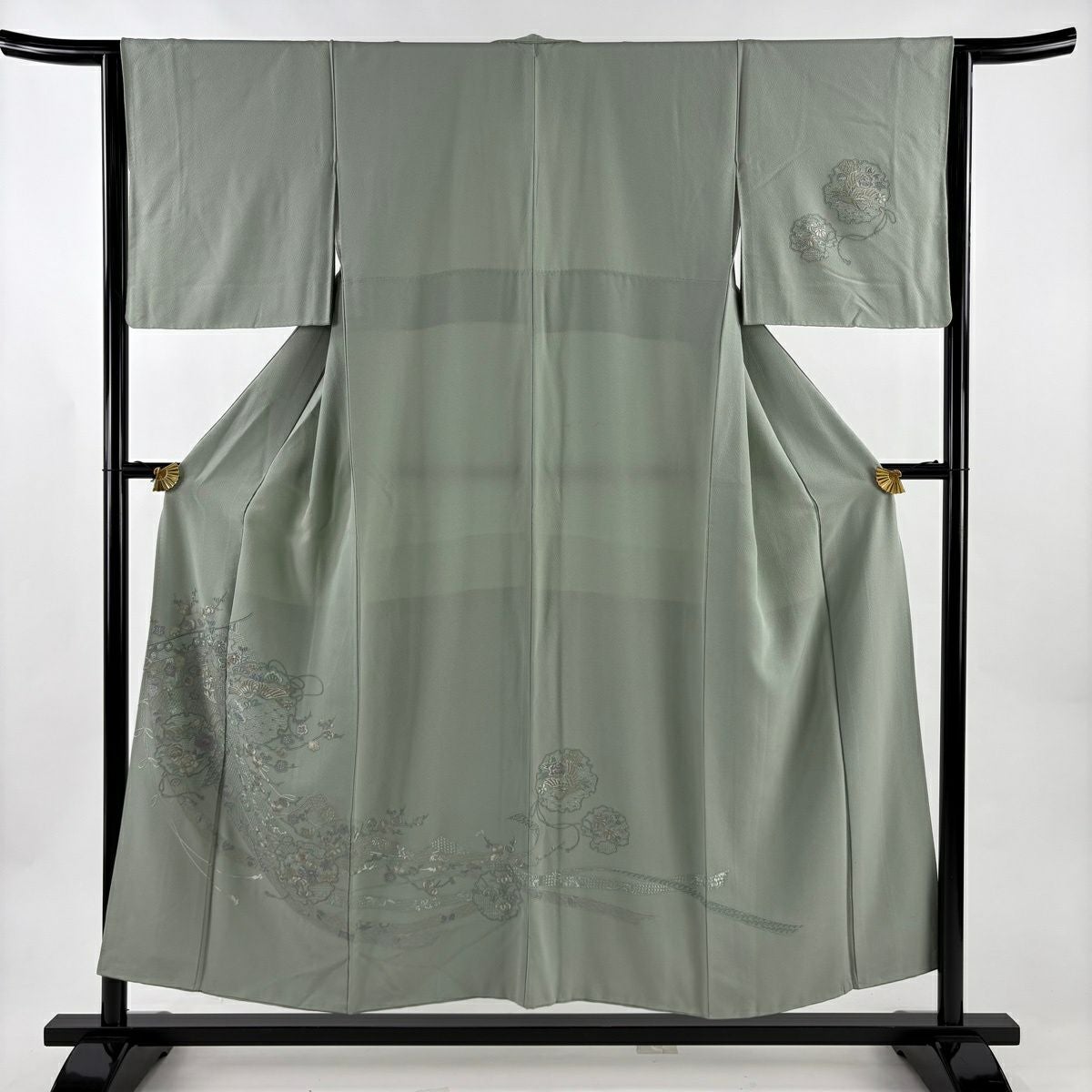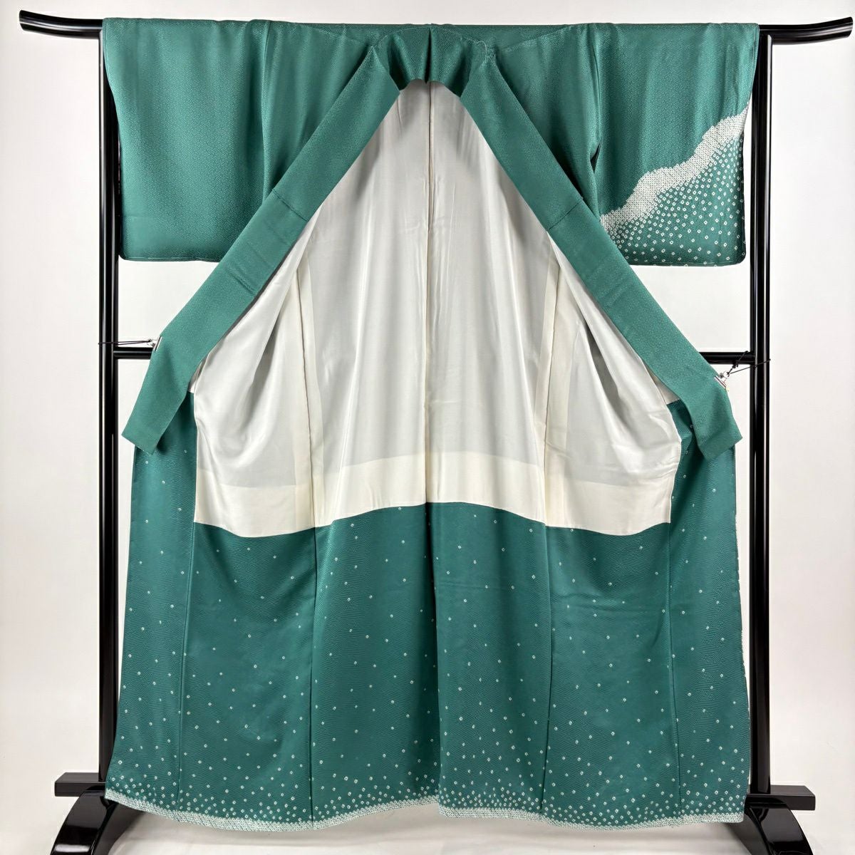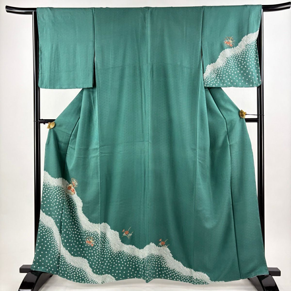30%OFF 付下げ 身丈164cm 裄丈66cm M 袷 雪輪 草花 刺繍 絞り 緑 正絹 秀品 K30