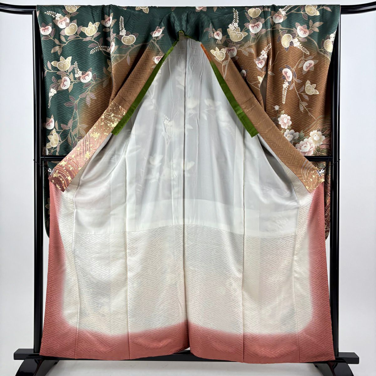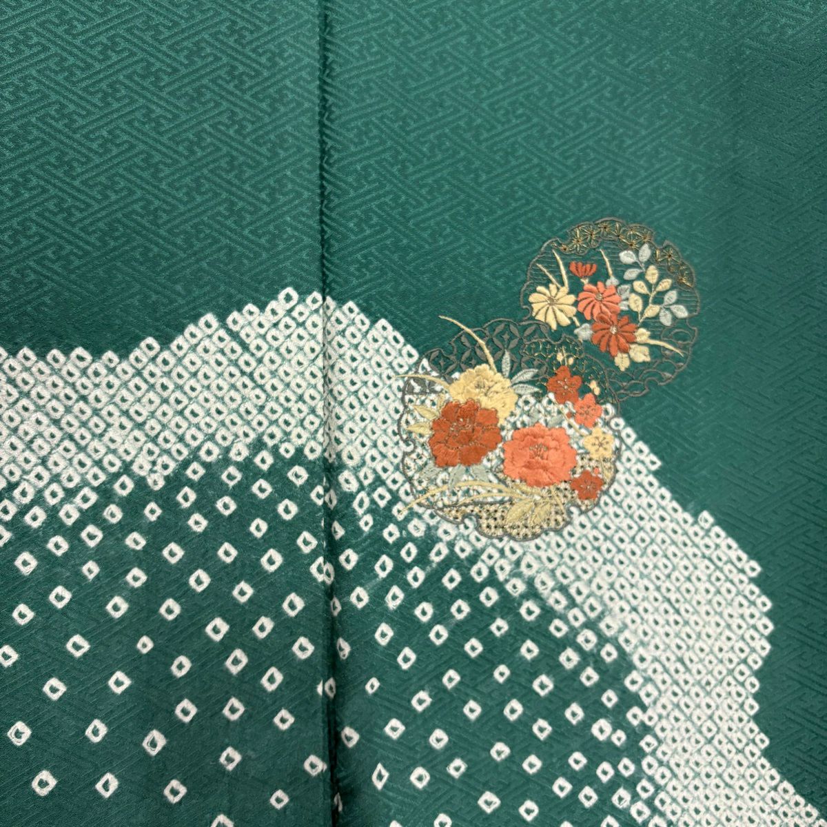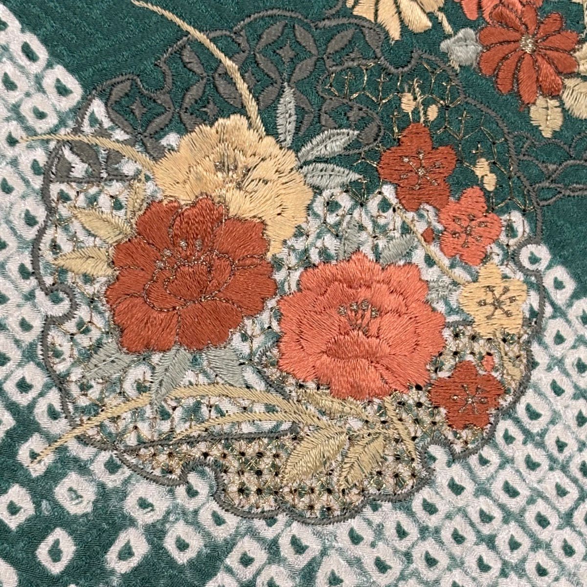 30%OFF 付下げ 身丈164cm 裄丈66cm M 袷 雪輪 草花 刺繍 絞り 緑 正絹 秀品 K30