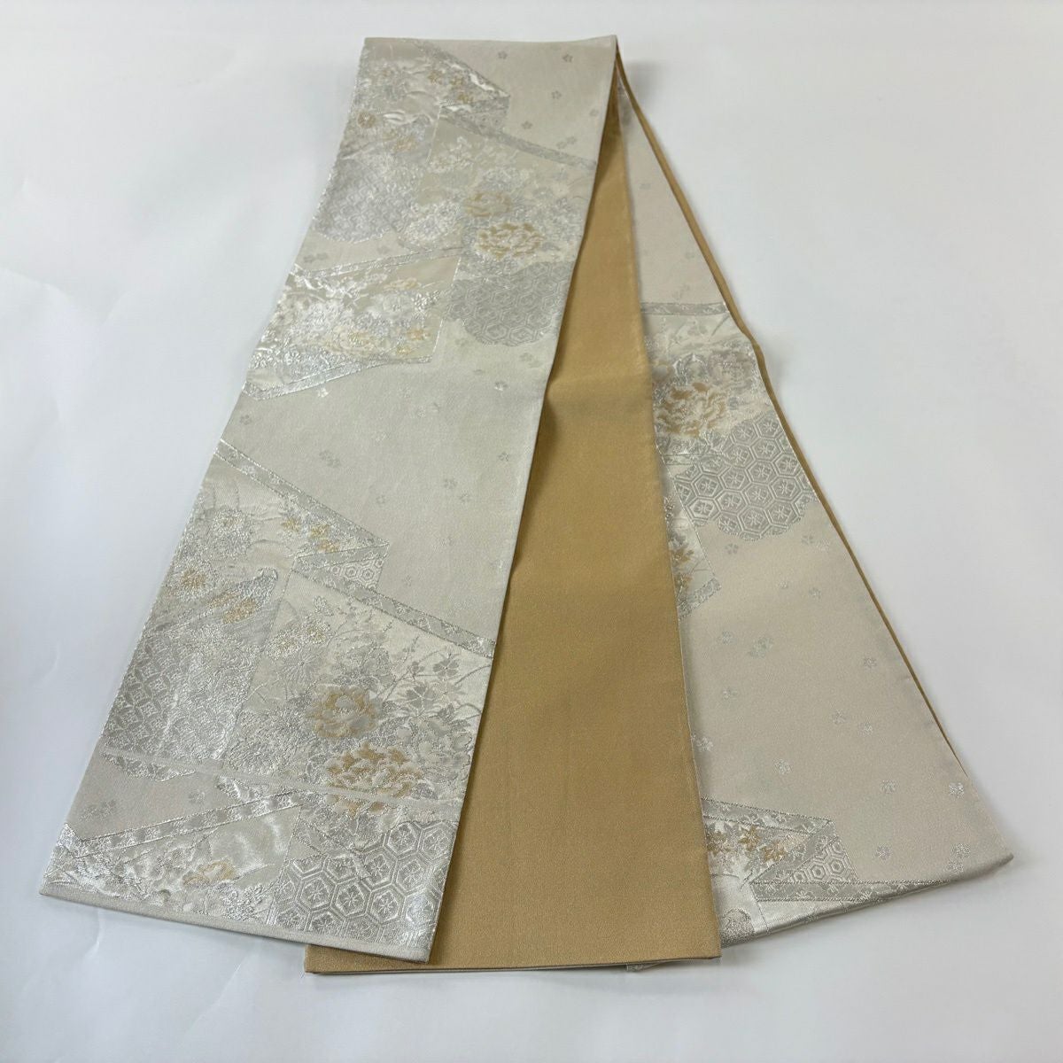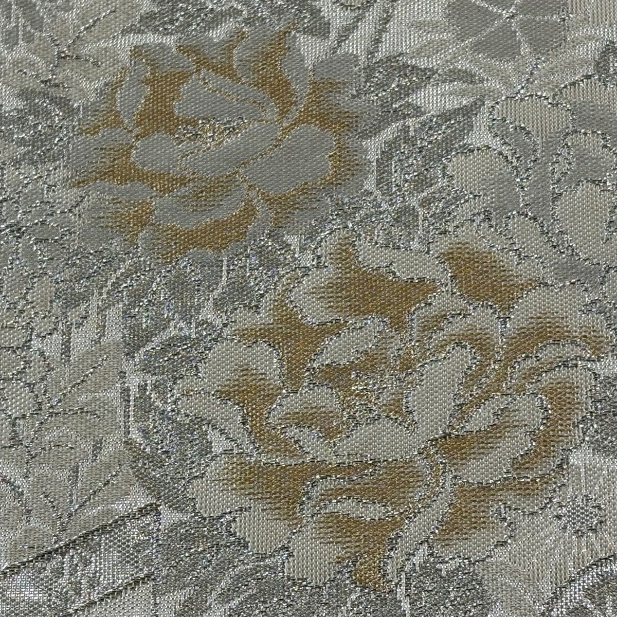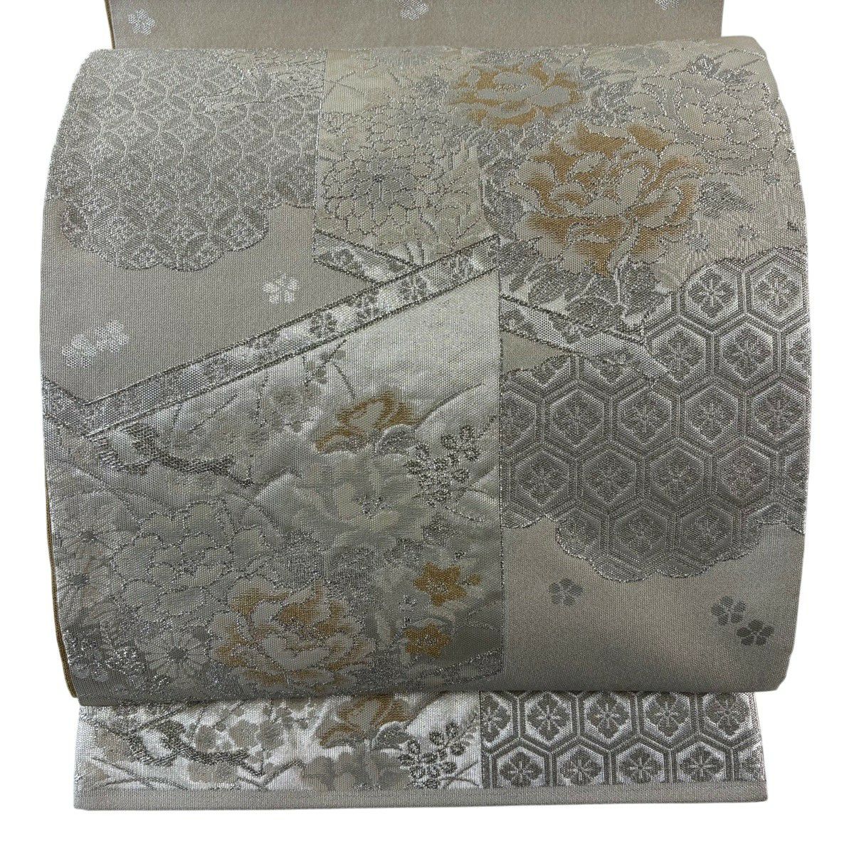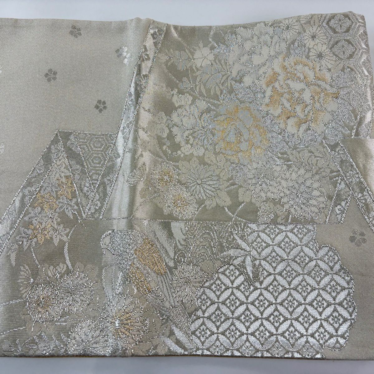50%OFF 【美品】 袋帯 秀品 落款あり 関西仕立て 草花 亀甲 金銀糸 箔 灰白 六通 正絹 K50