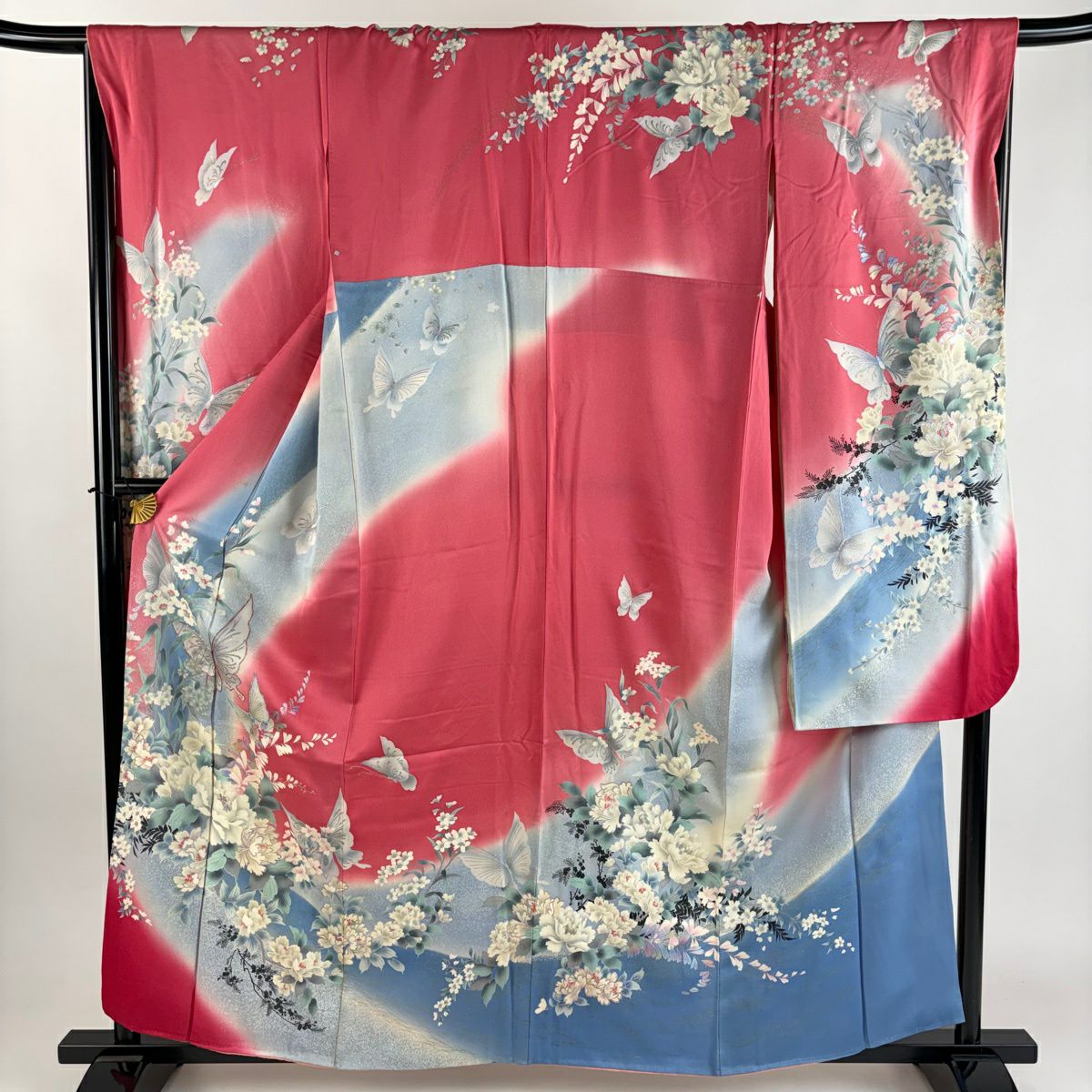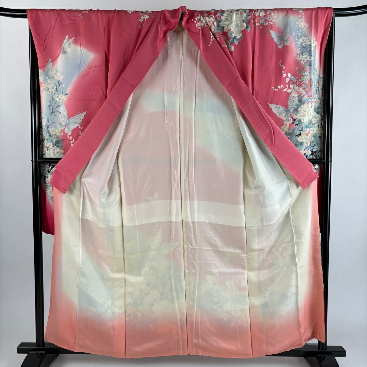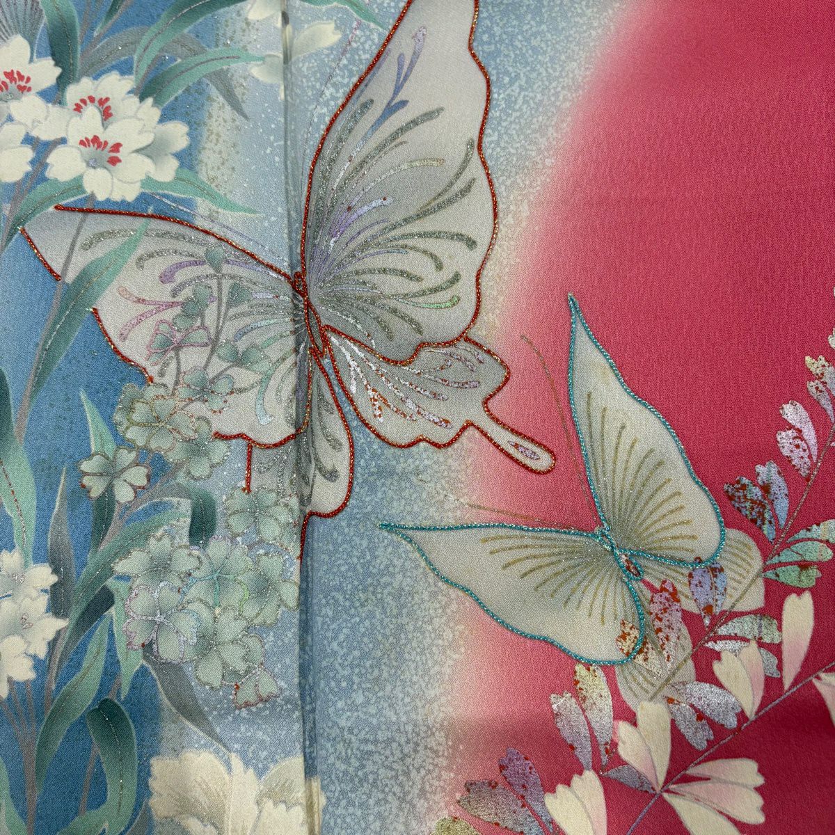 50%OFF 振袖 身丈158cm 裄丈67cm M 袷 蝶 草花 銀彩 ラメ ピンク 正絹 秀品 K50