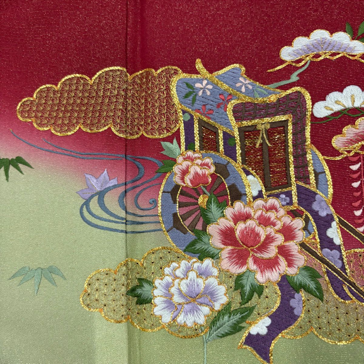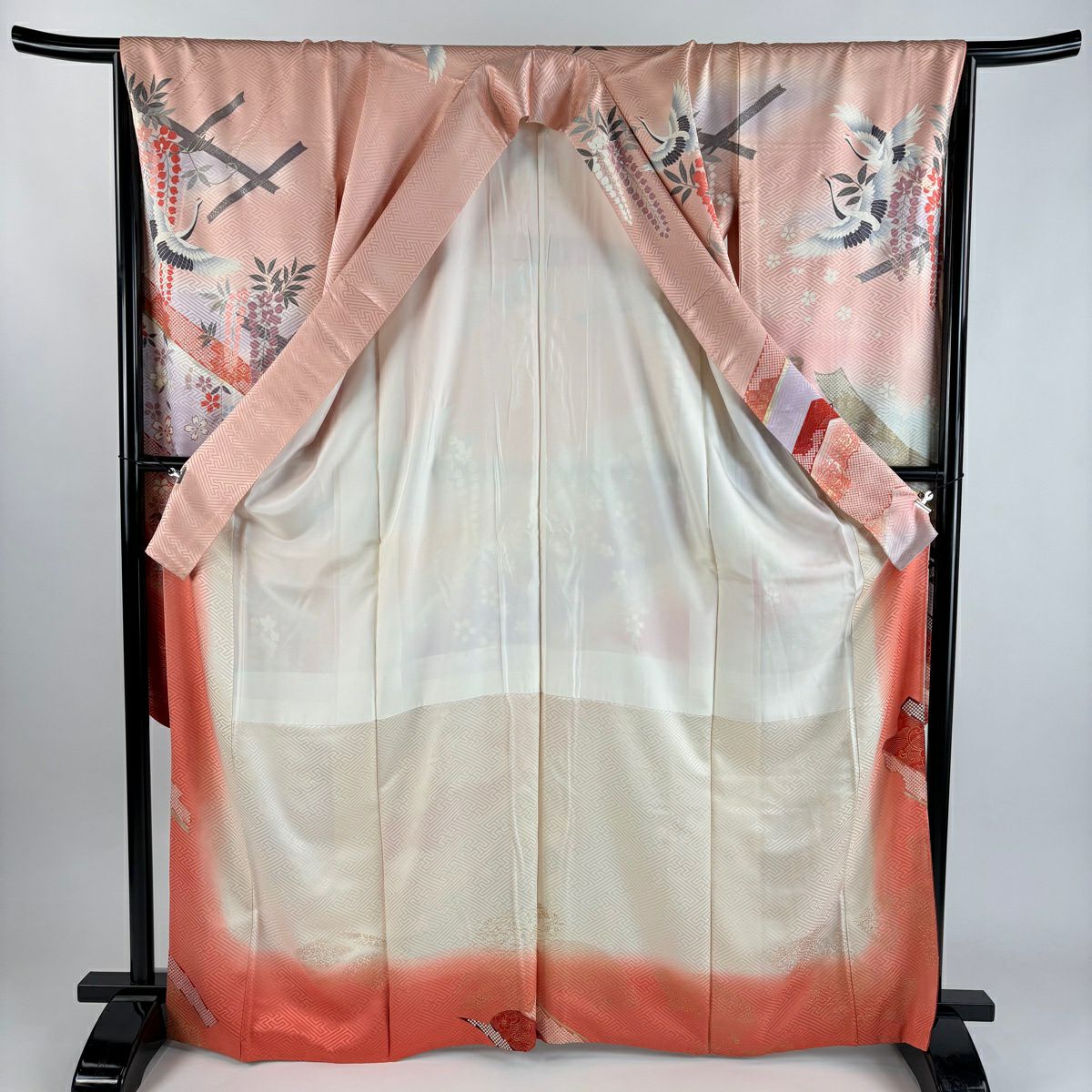 50%OFF 振袖 身丈167cm 裄丈67cm M 袷 短冊 御所車 金糸 金銀彩 ピンク 正絹 秀品 K50