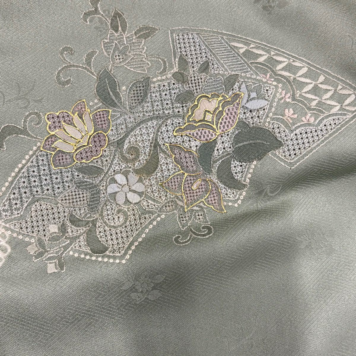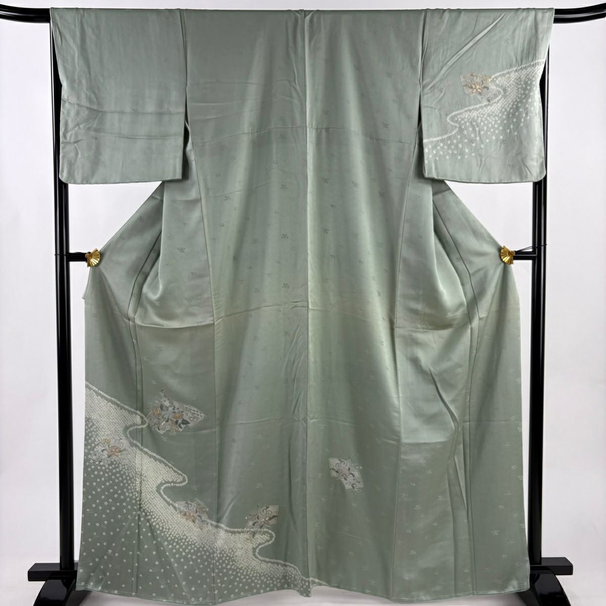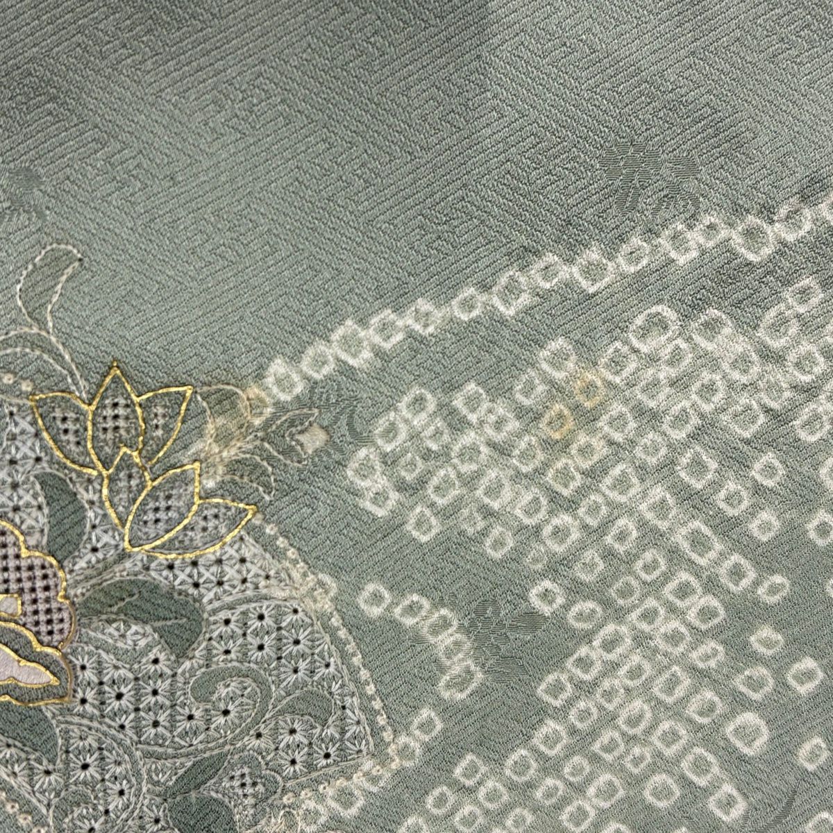 50%OFF 訪問着 身丈155cm 裄丈64cm M 袷 熨斗 菊唐草 金糸 金彩 灰緑 正絹 秀品 K50
