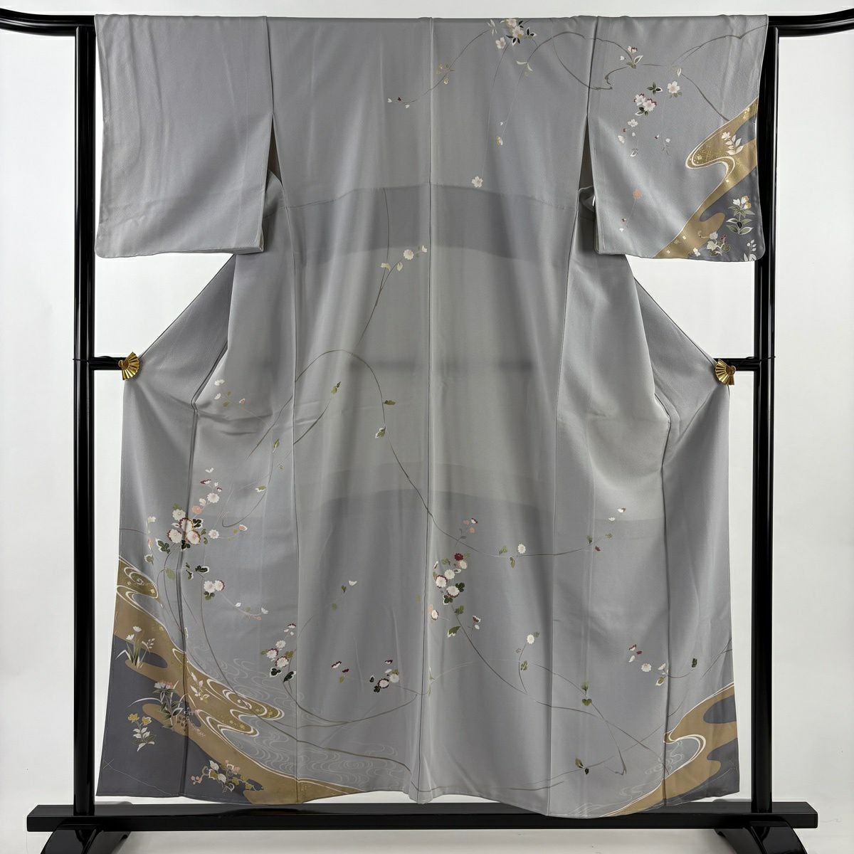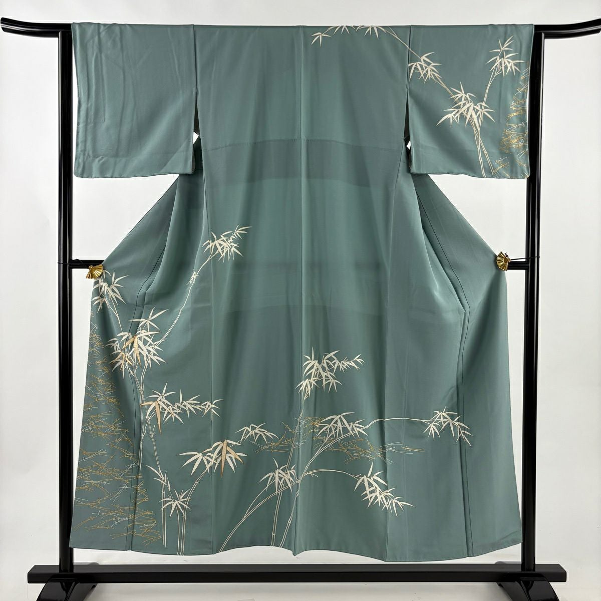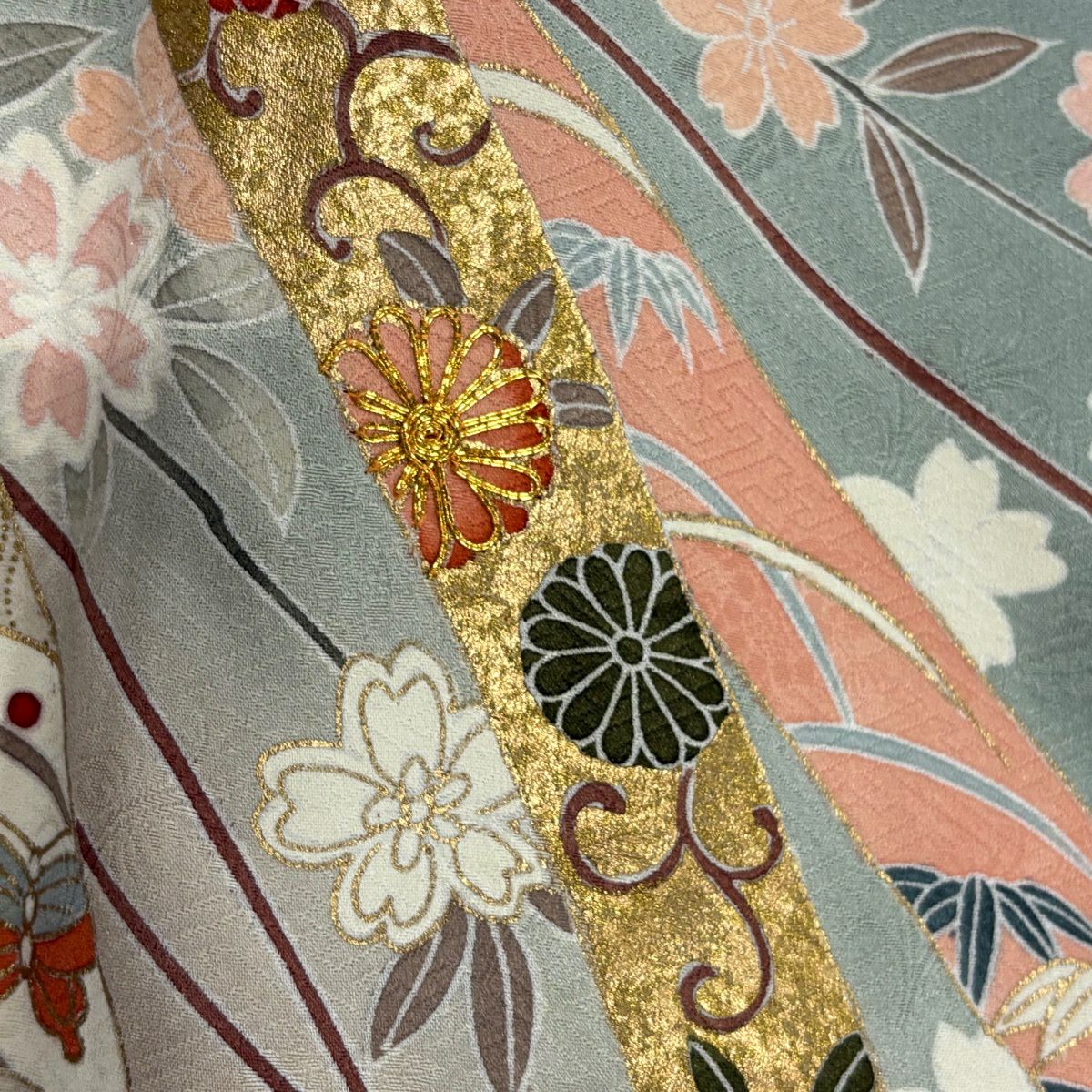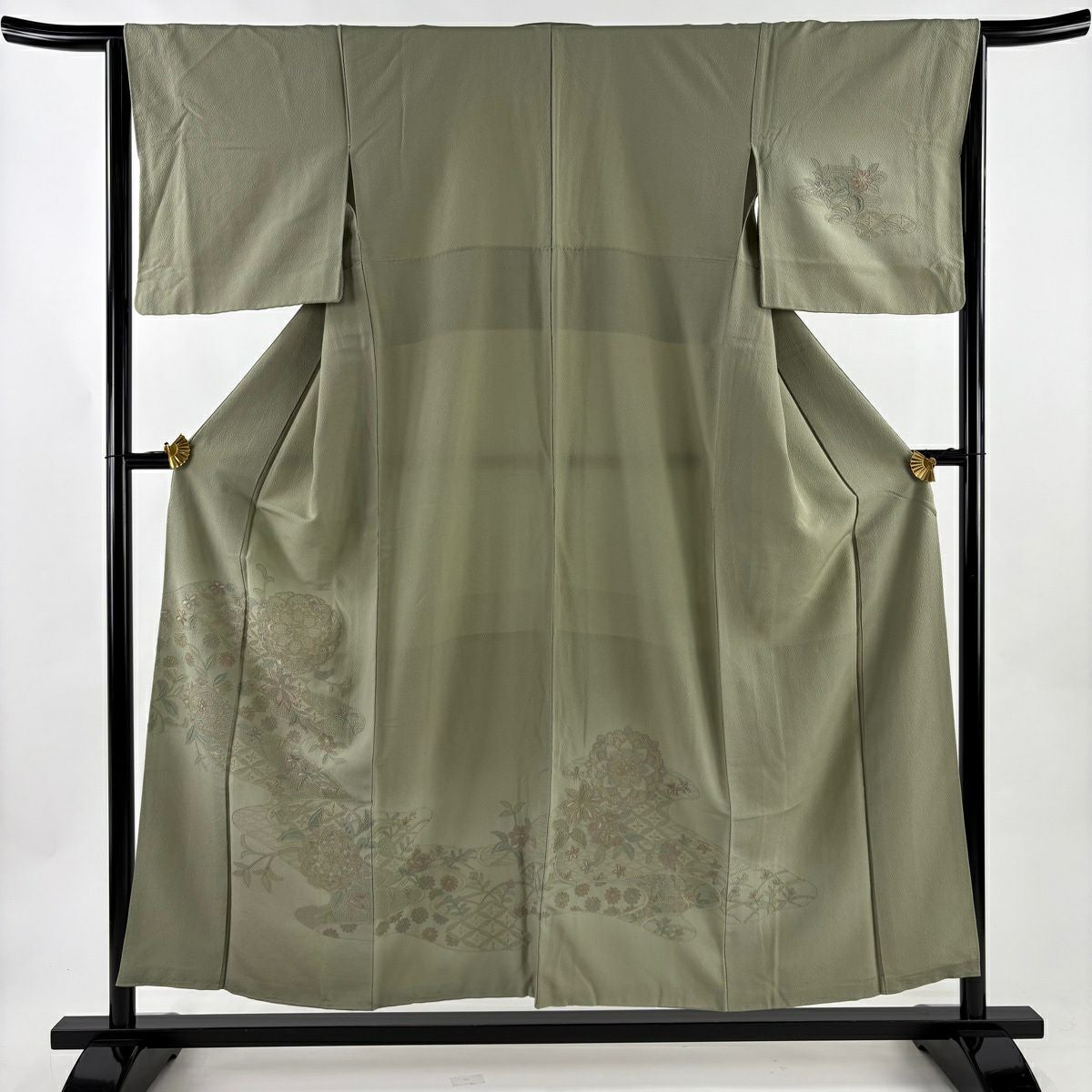 50%OFF 訪問着 身丈155cm 裄丈64cm M 袷 熨斗 菊唐草 金糸 金彩 灰緑 正絹 秀品 K50