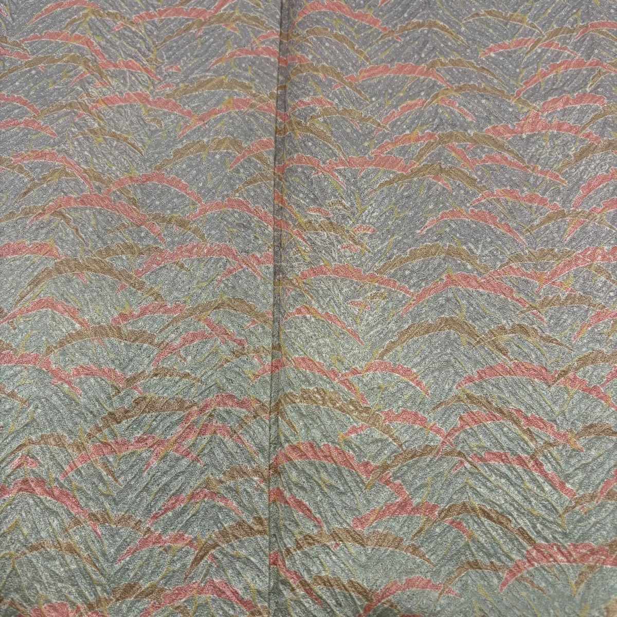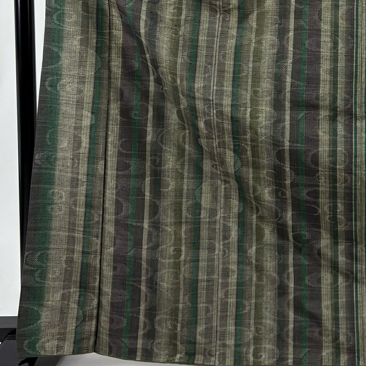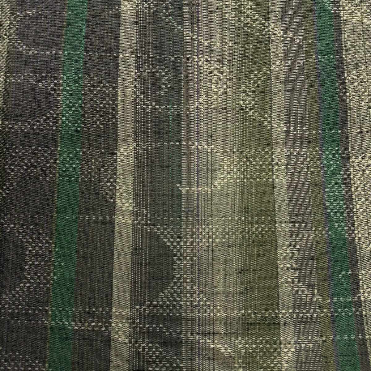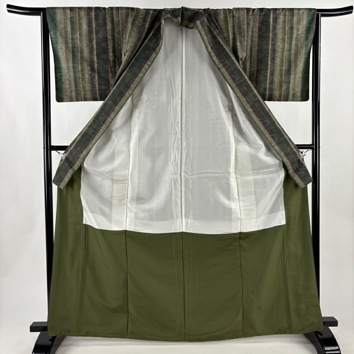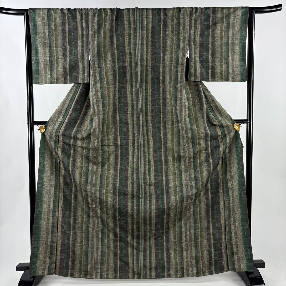 50%OFF 【美品】 紬 身丈166.5cm 裄丈66cm M 袷 観世水 縦縞 灰緑 正絹 秀品 K50