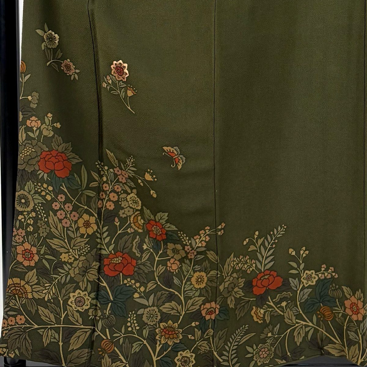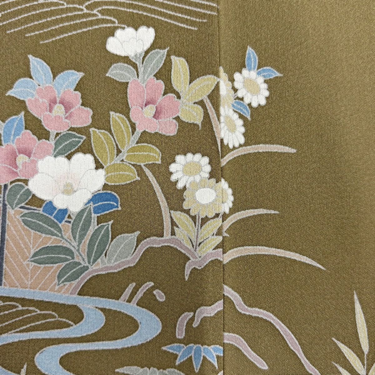 50%OFF 訪問着 身丈163cm 裄丈66cm M 袷 落款あり 家屋 草花 茶緑色 正絹 秀品 K50