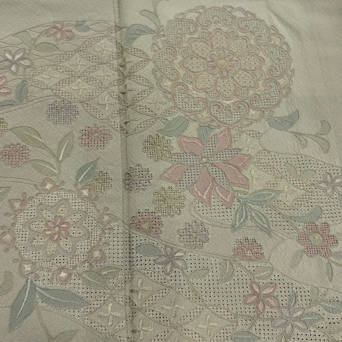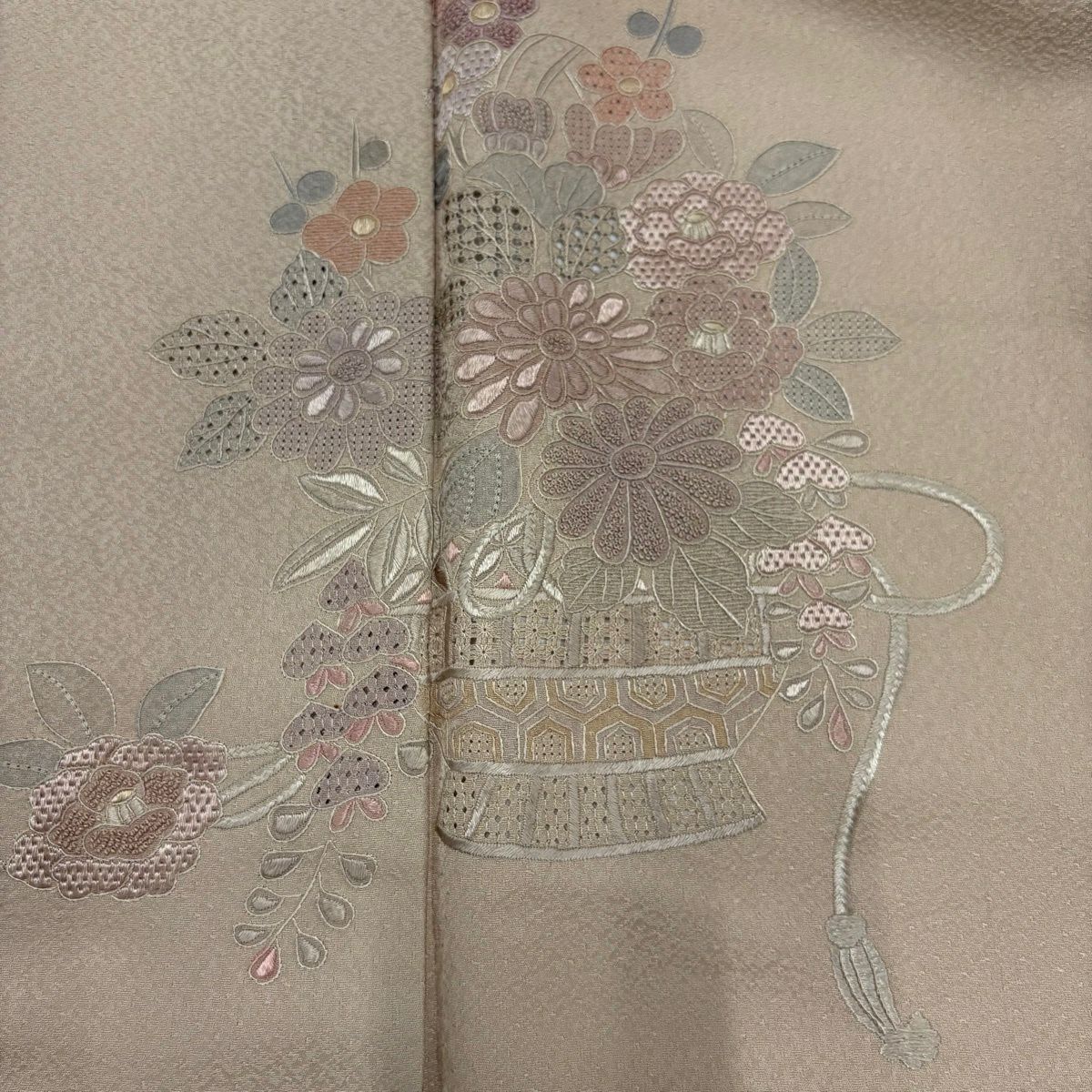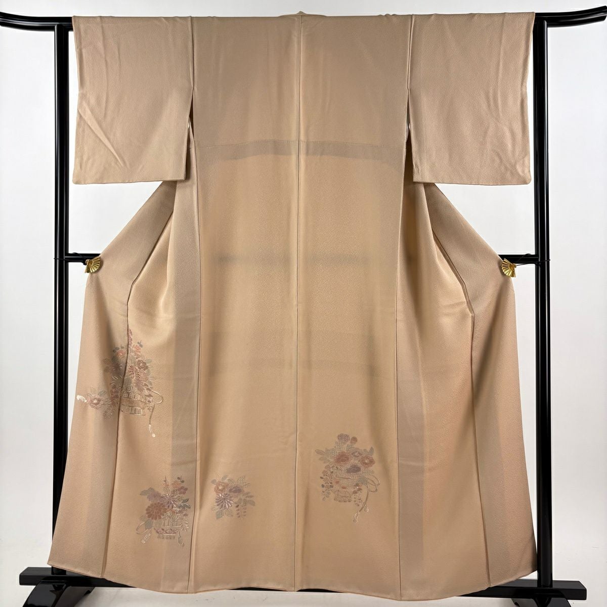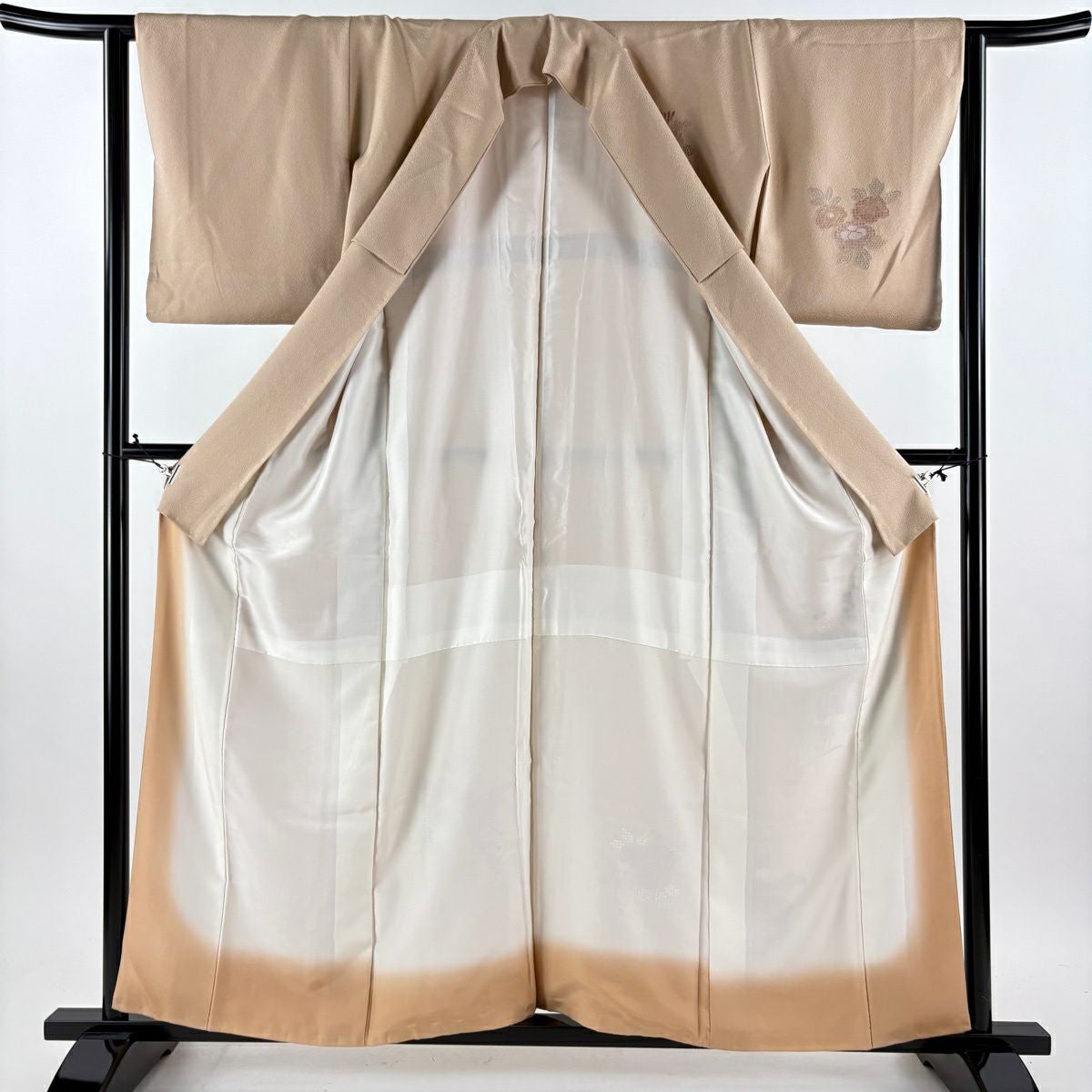 50%OFF 訪問着 身丈169cm 裄丈65cm M 袷 草花 霞 刺繍 金彩 薄茶色 正絹 秀品 K50