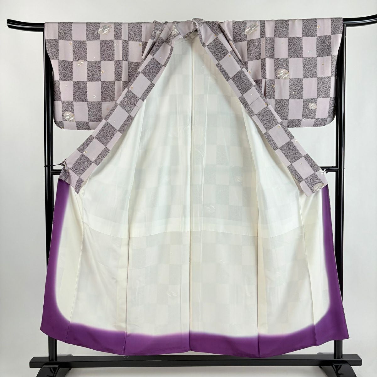 50%OFF 【美品】 道行 身丈90cm 裄丈65cm M 和装コート 角衿 格子 紫 正絹 秀品 K50
