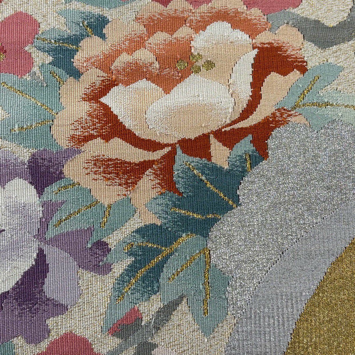 50%OFF 袋帯 秀品 草木染 四君子 花丸文 七宝 金糸 つづれ唐織 ベージュ 六通 正絹 K50
