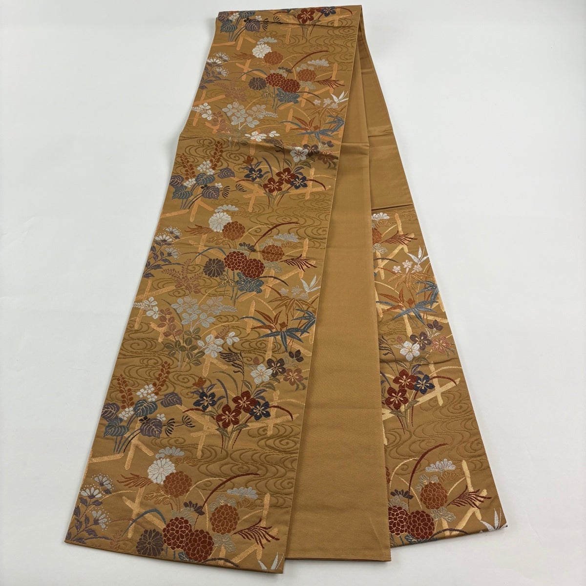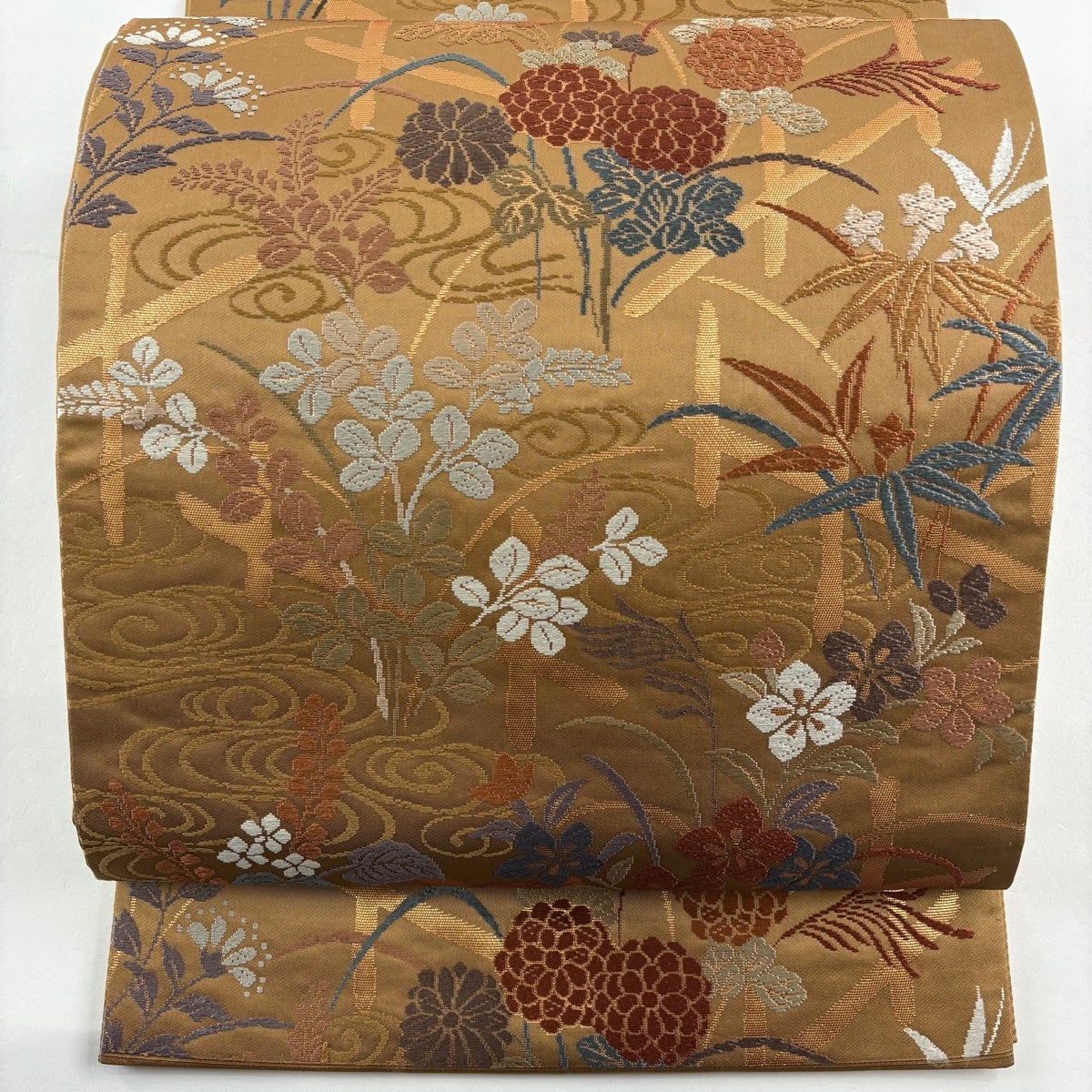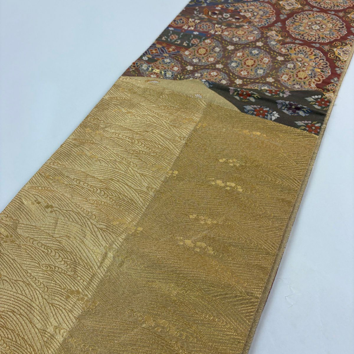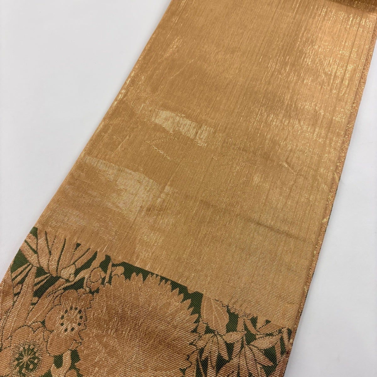 【美品】 袋帯 秀品 菊 草花 唐織 箔 茶色 六通 正絹