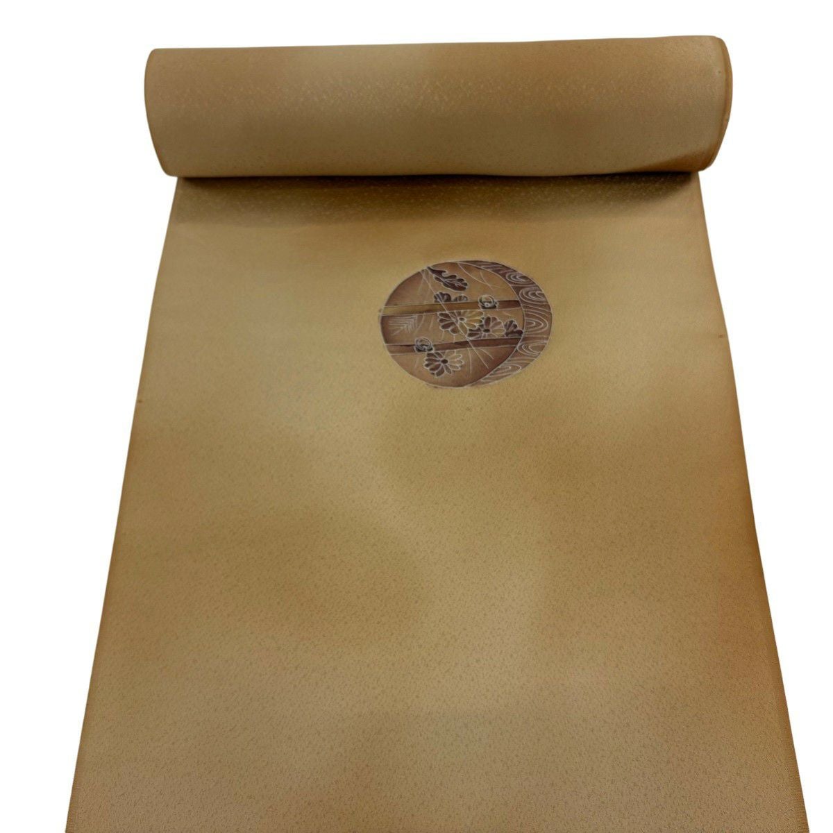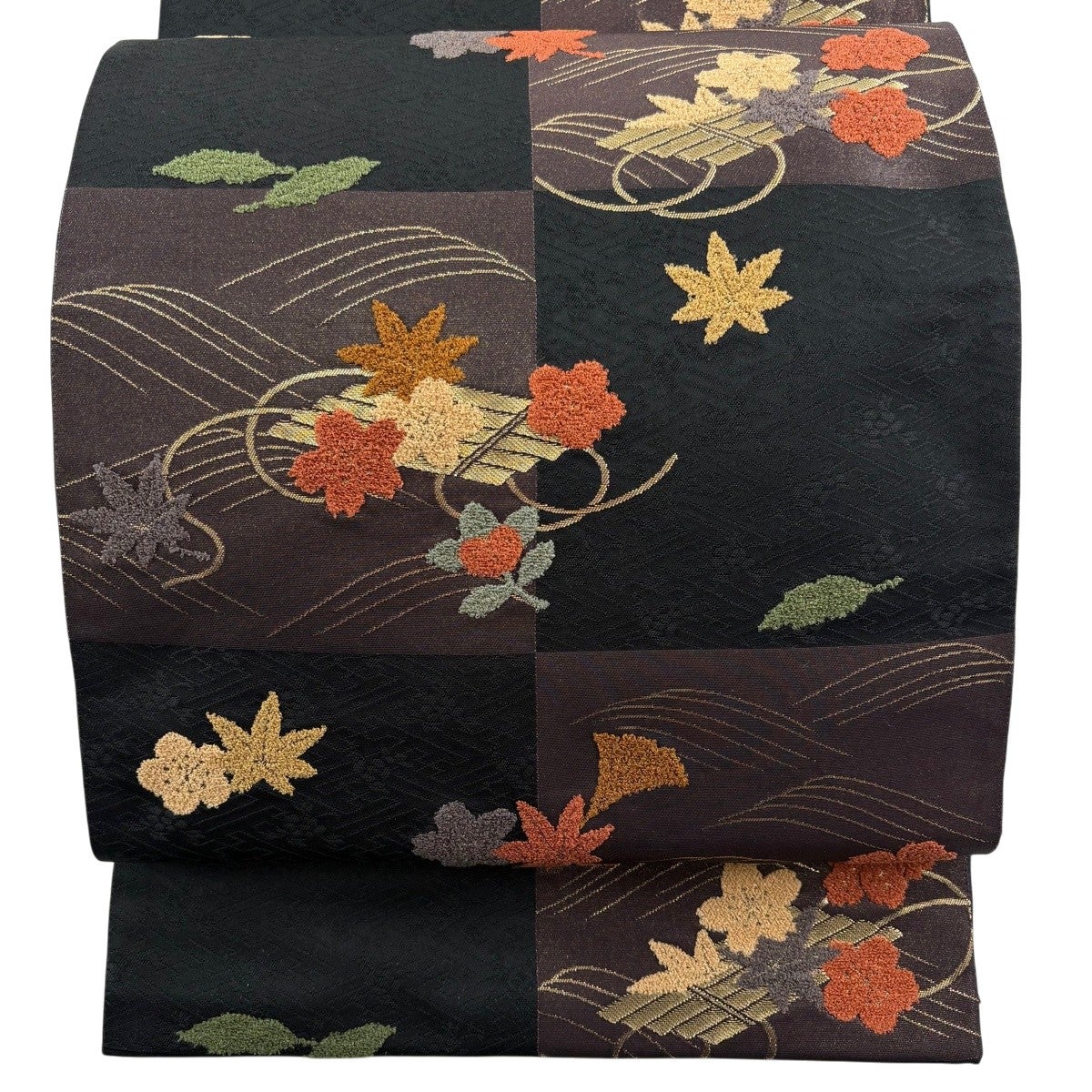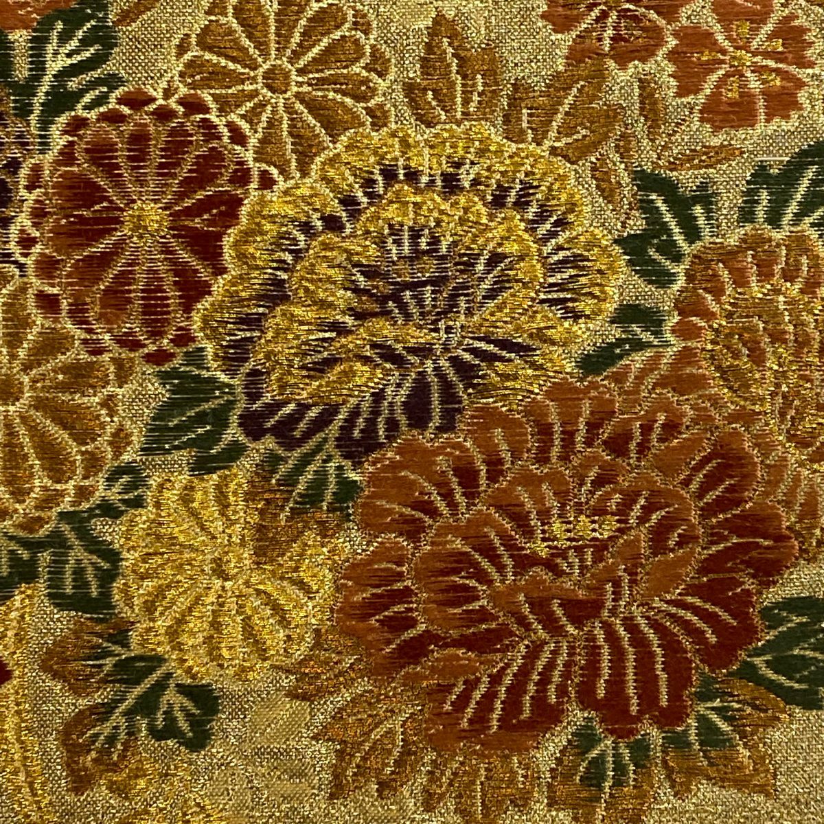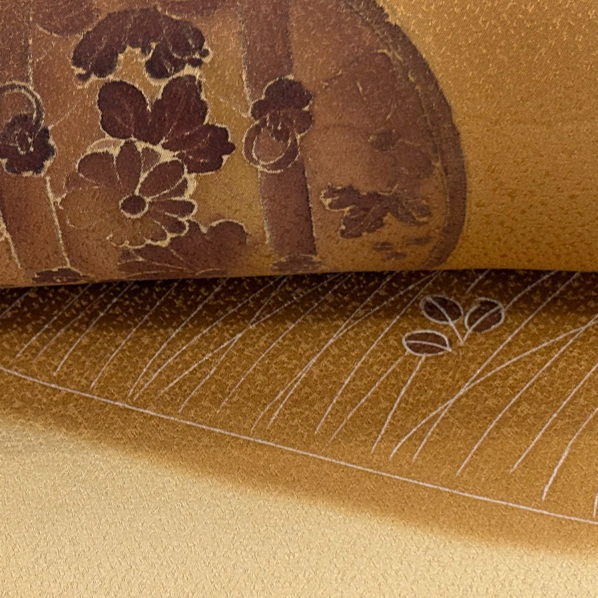 【美品】 袋帯 秀品 菊 草花 唐織 箔 茶色 六通 正絹