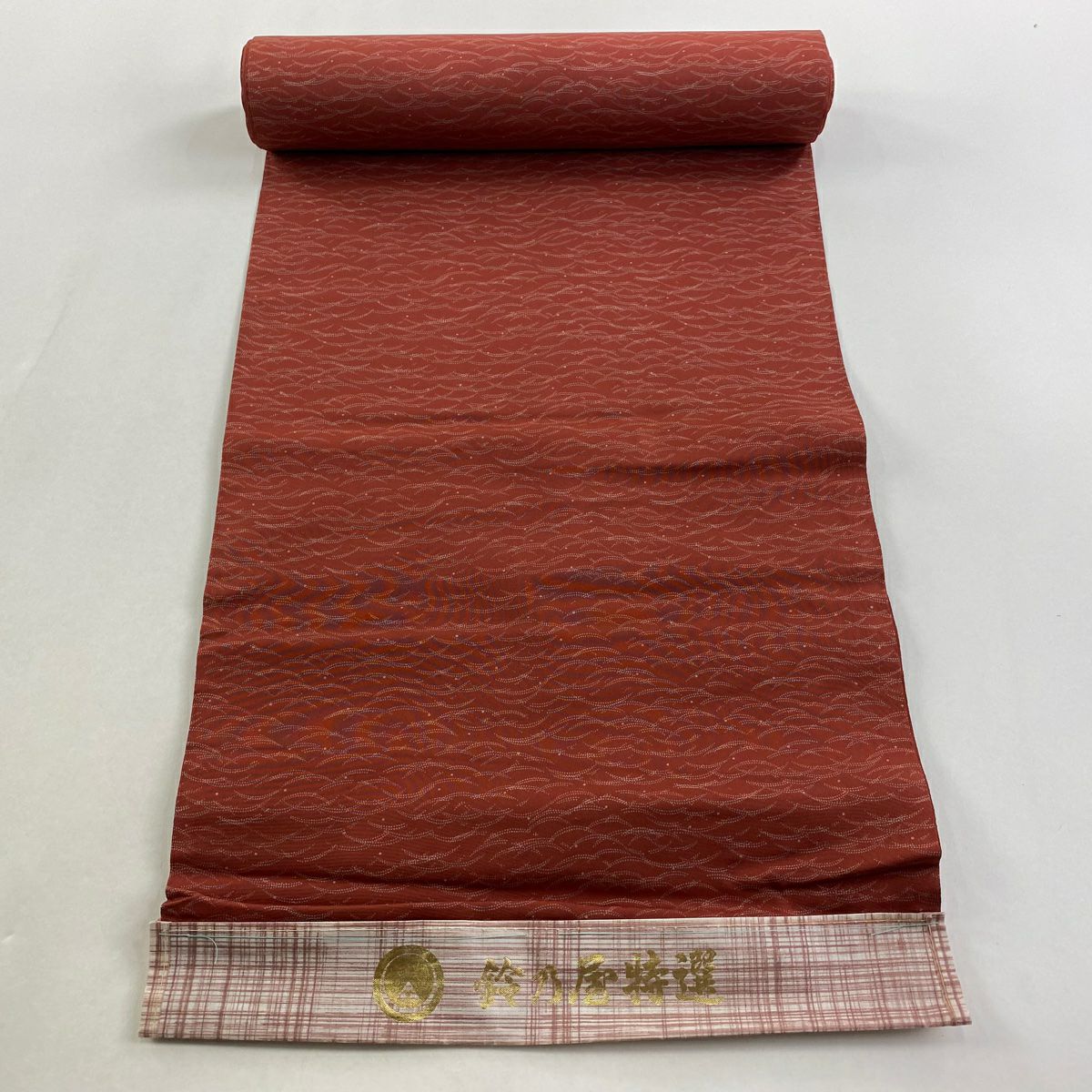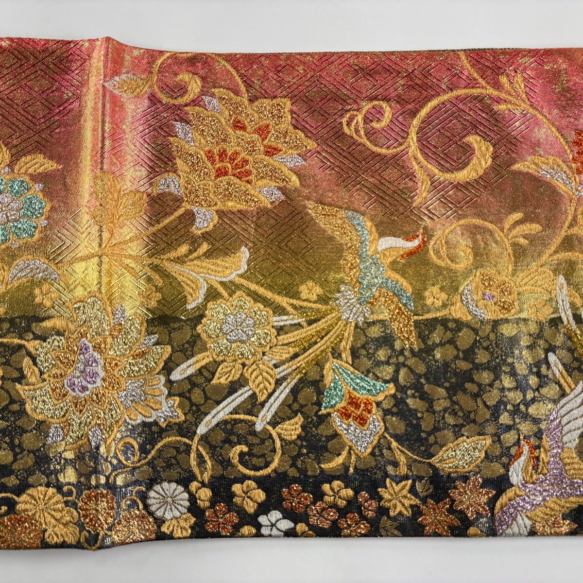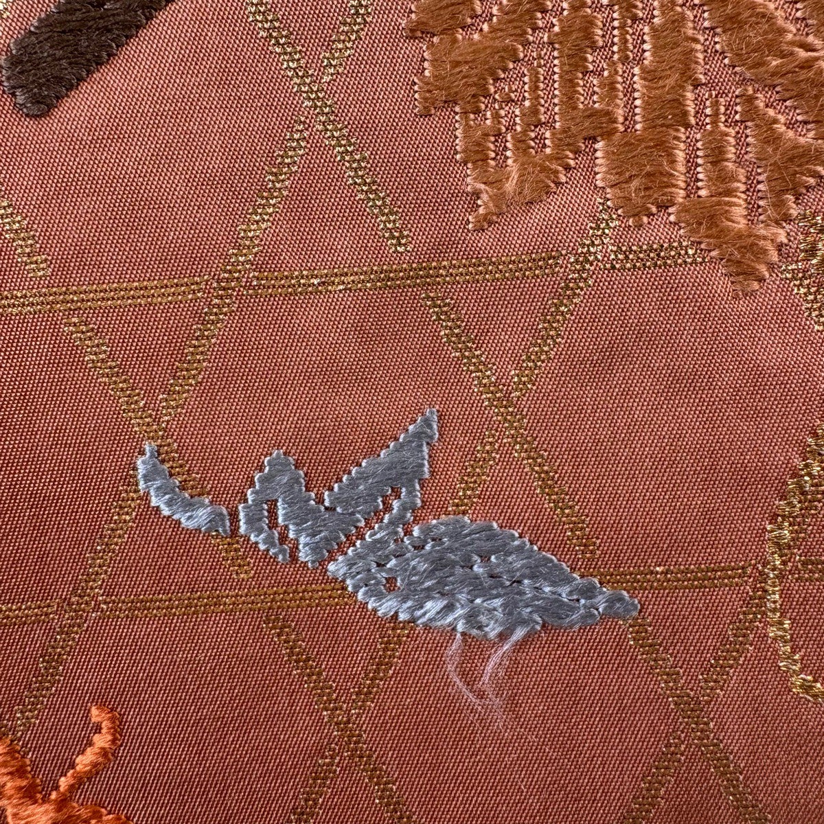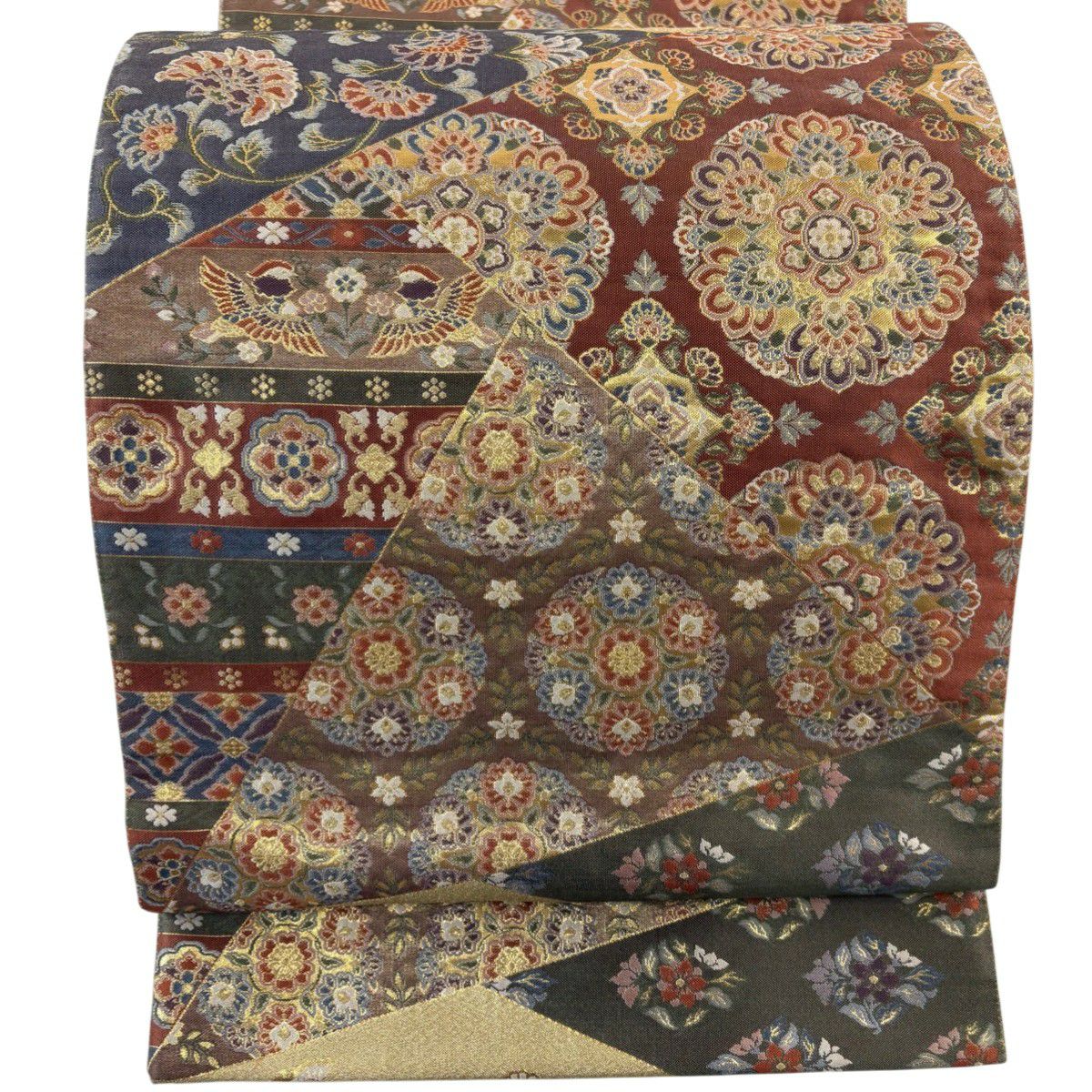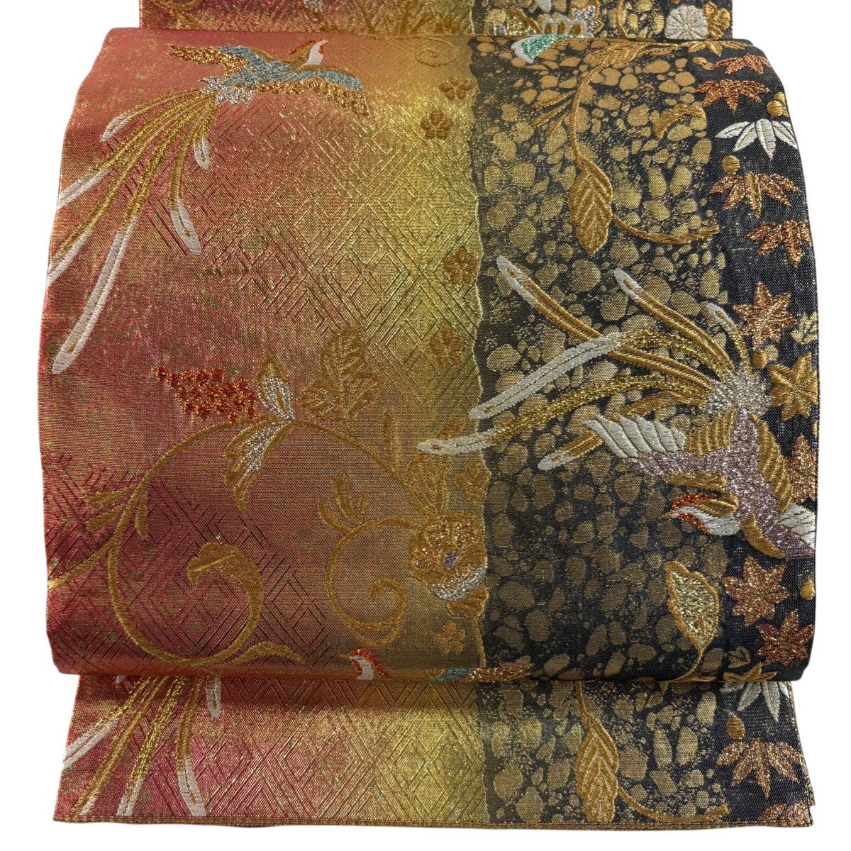 【美品】 袋帯 秀品 華文 向かい鳥 箔 赤茶 六通 正絹
