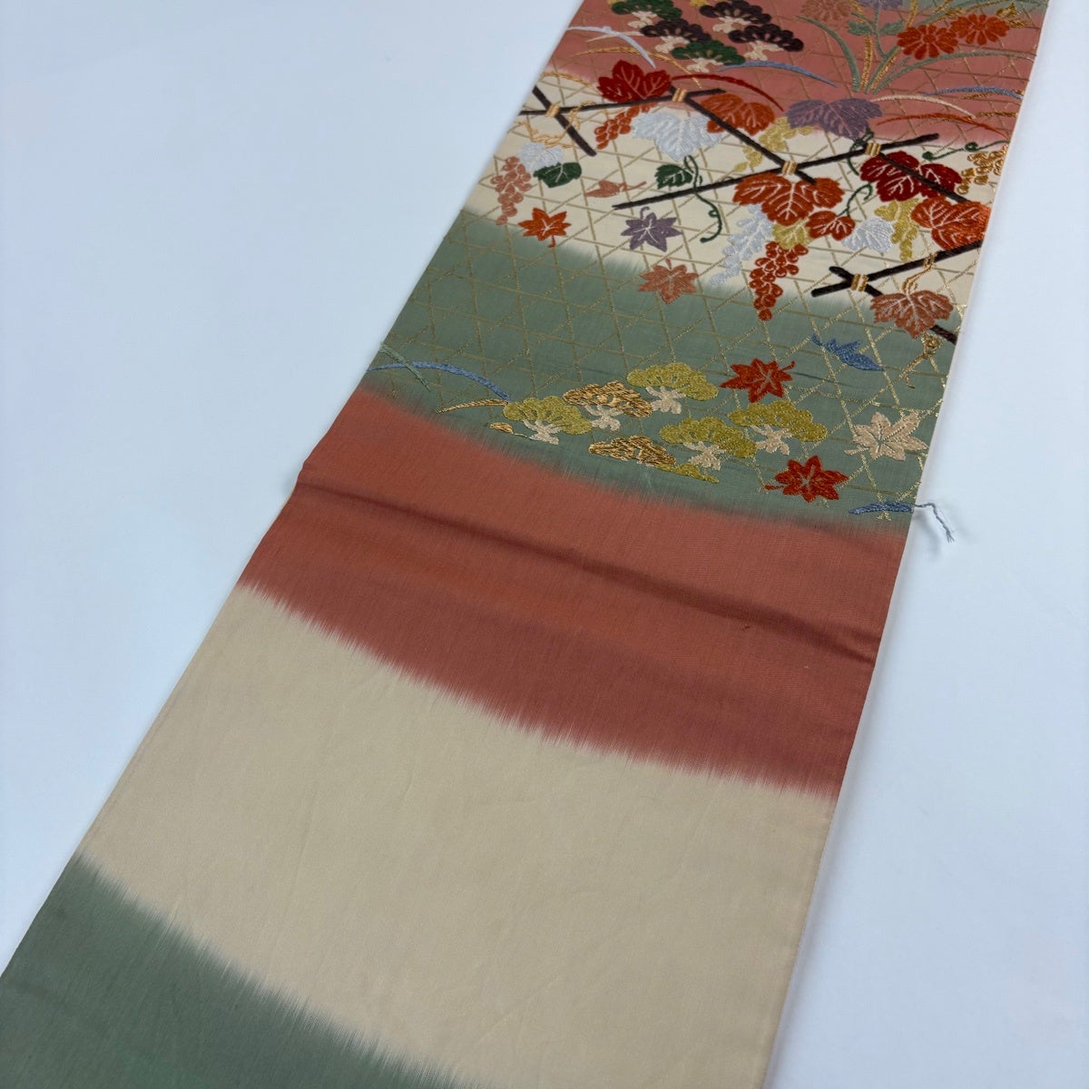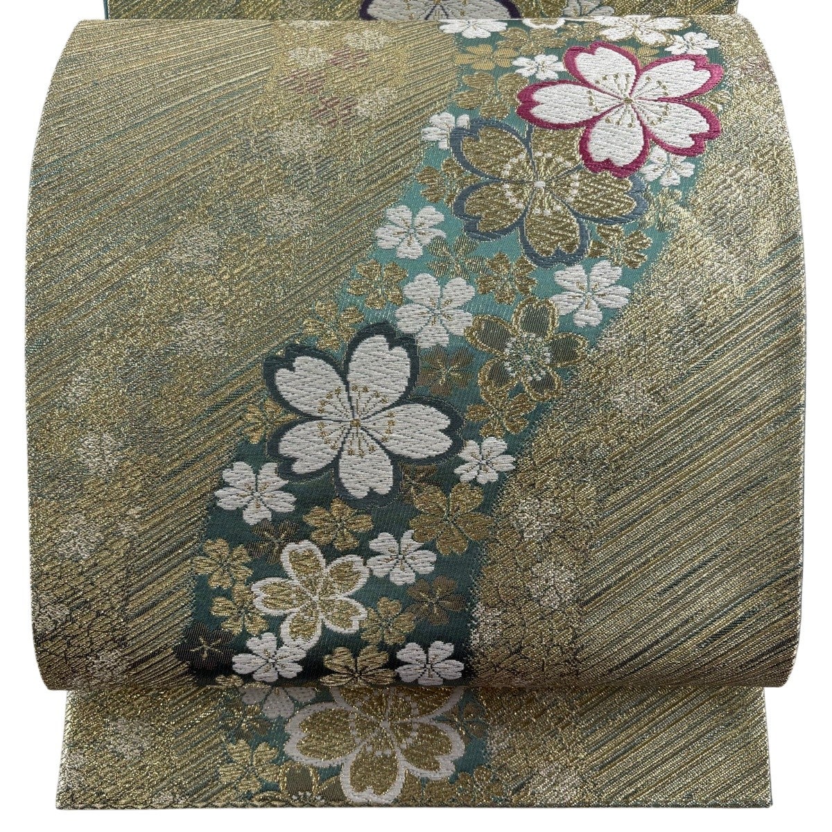 袋帯 秀品 振袖向き 桜 斜縞 金糸 箔 薄緑 六通 正絹