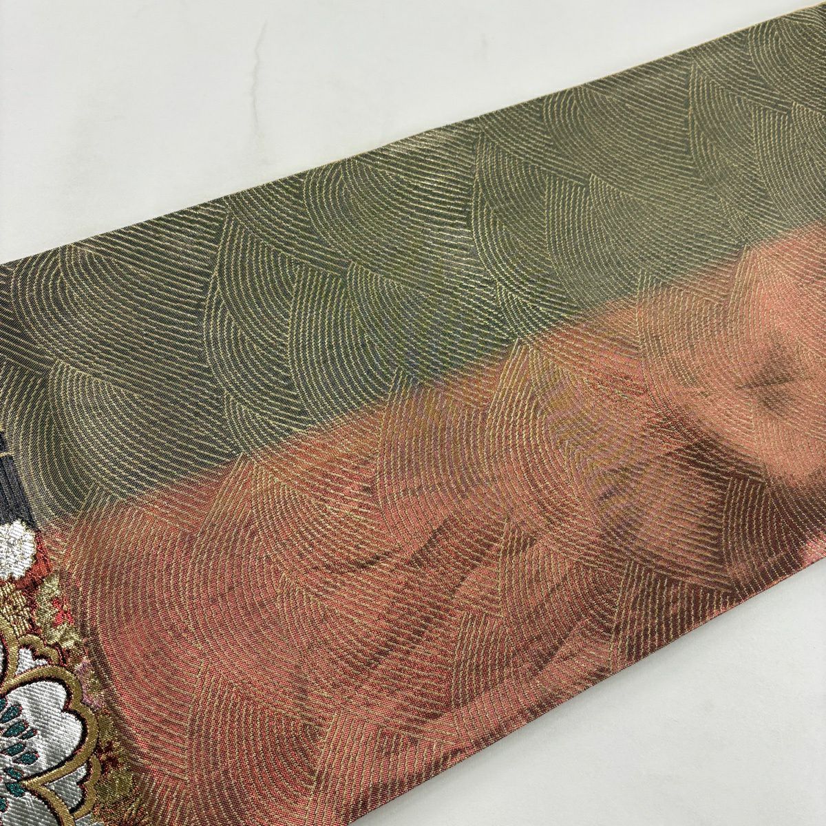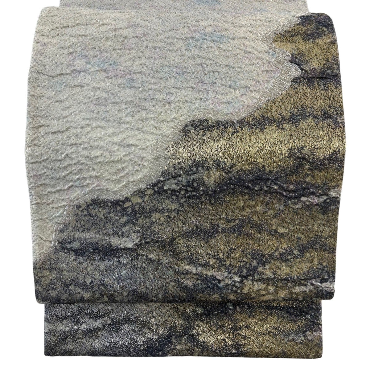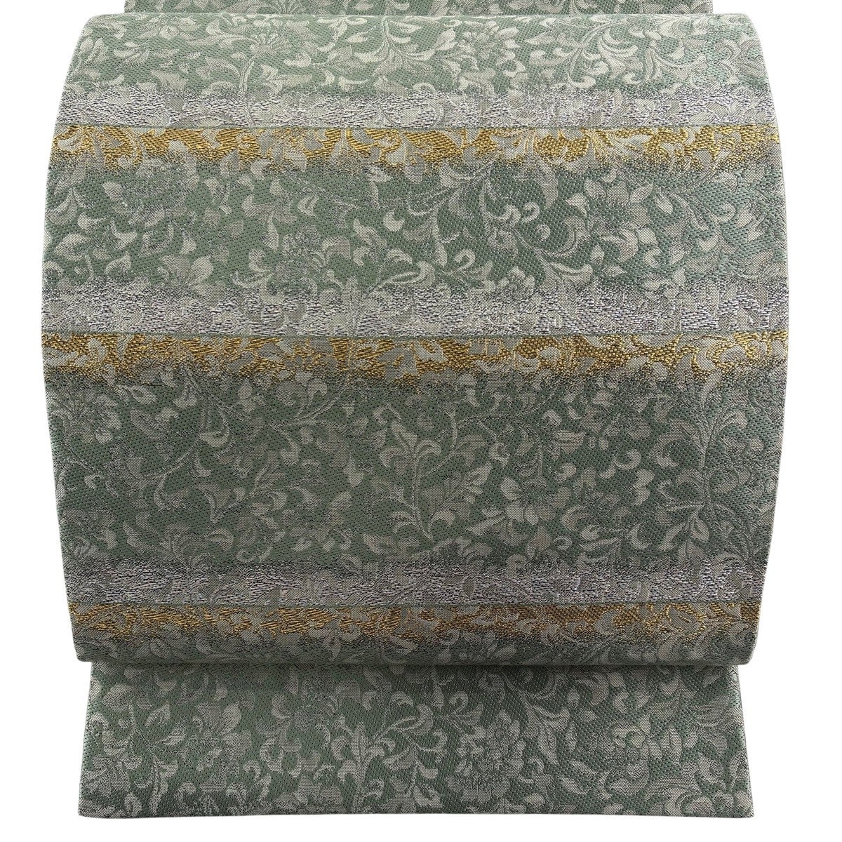 【美品】 袋帯 秀品 霞 金銀糸 箔 灰緑 お太鼓柄 正絹