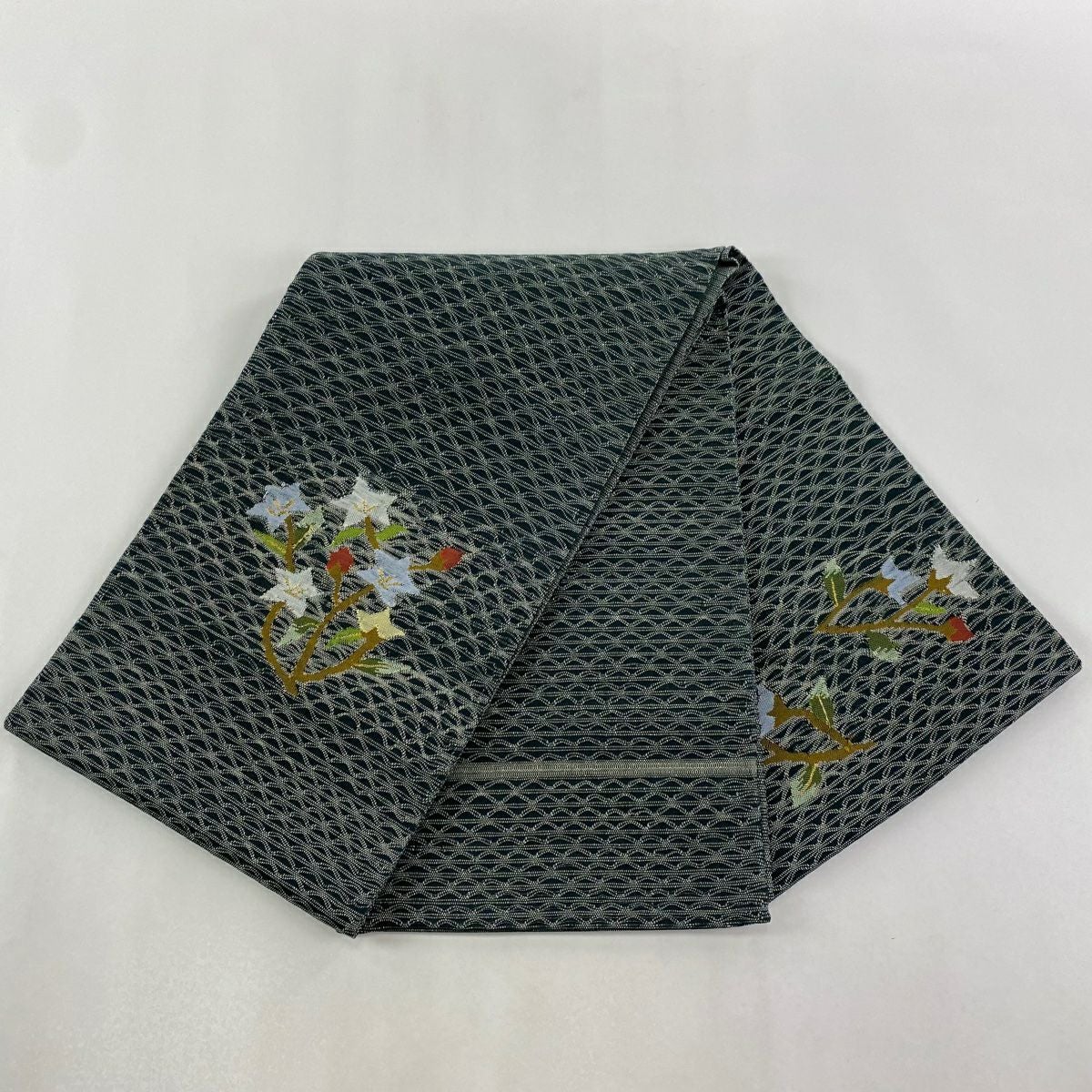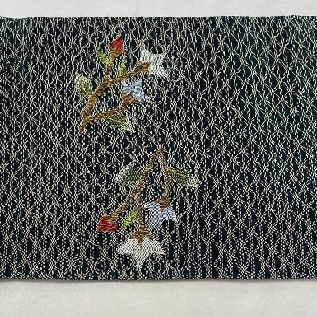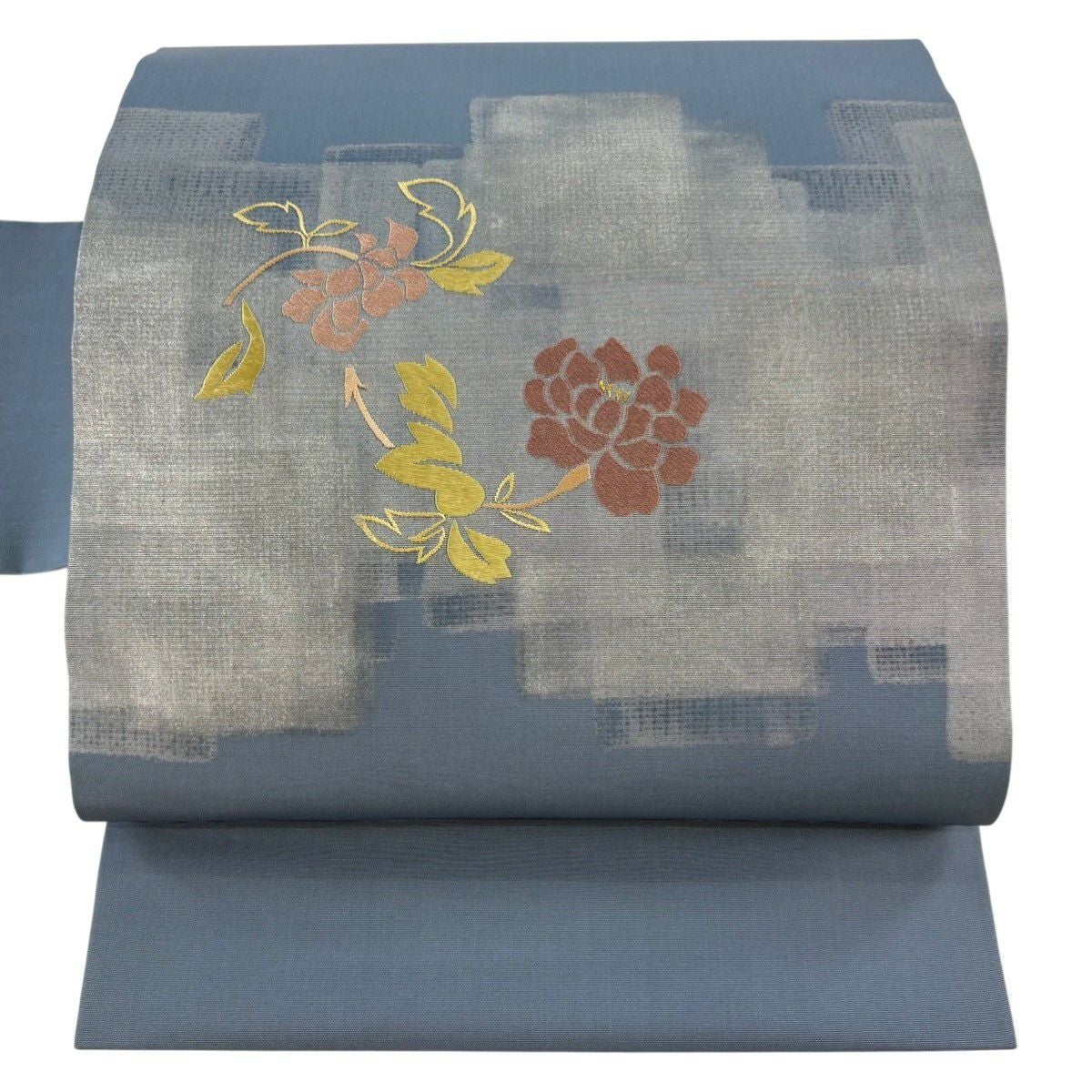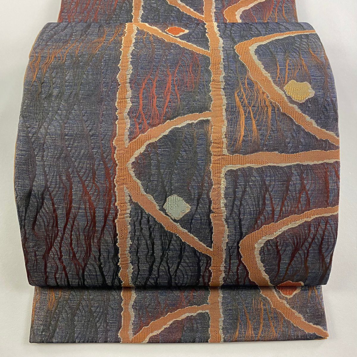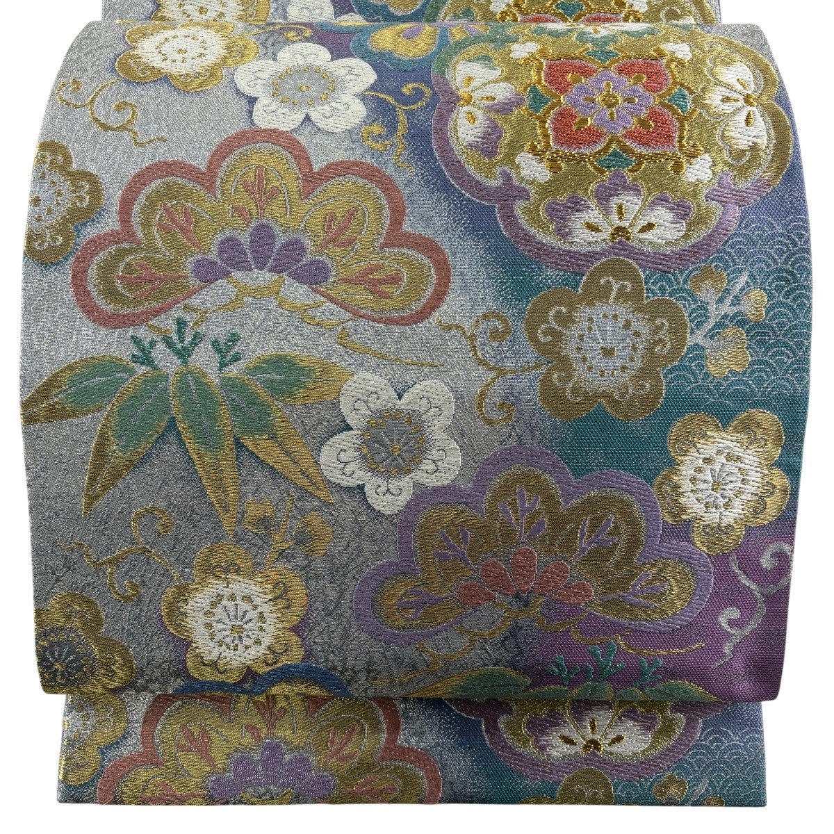 名古屋帯 秀品 枝花 幾何学模様 銀彩 金糸 青灰色 正絹