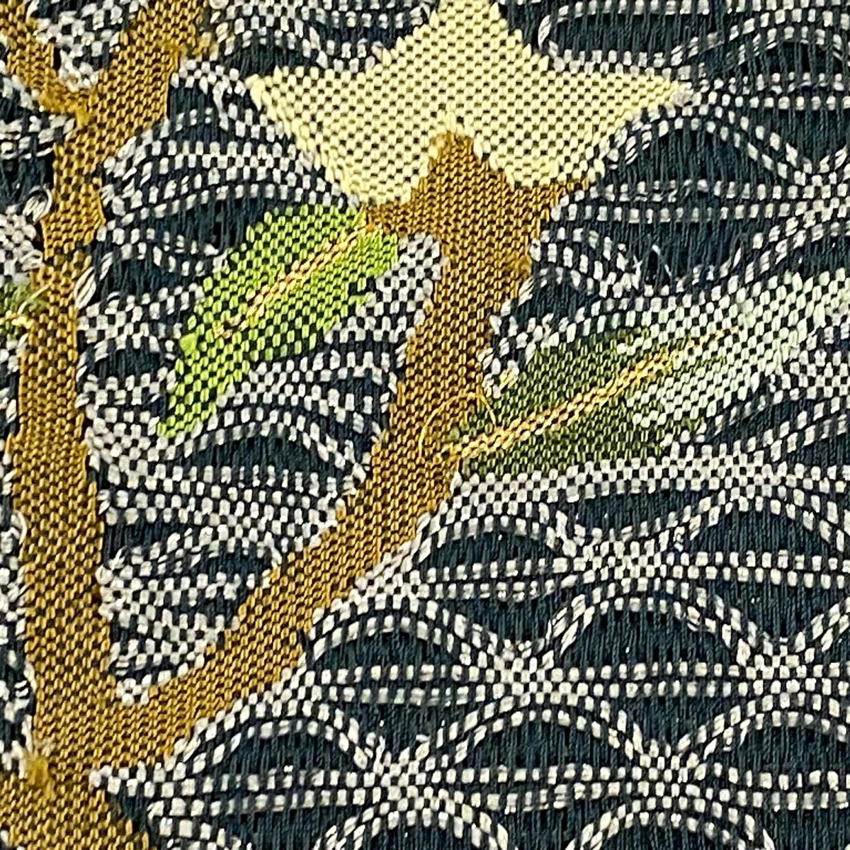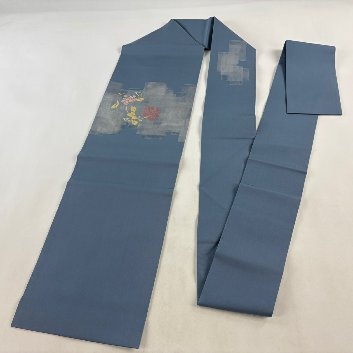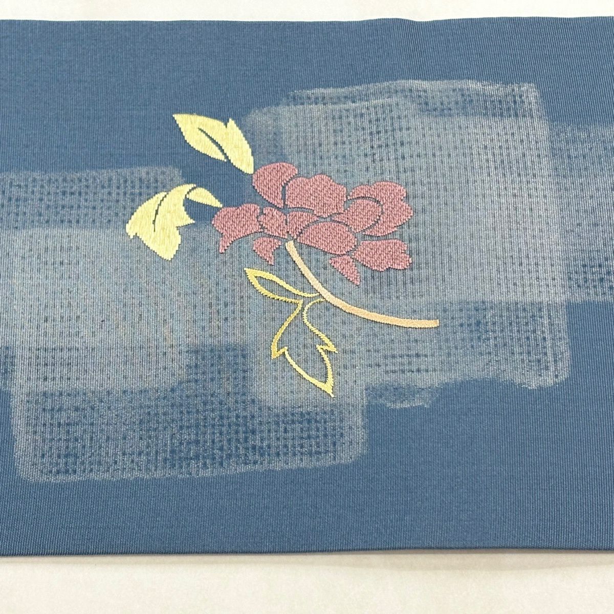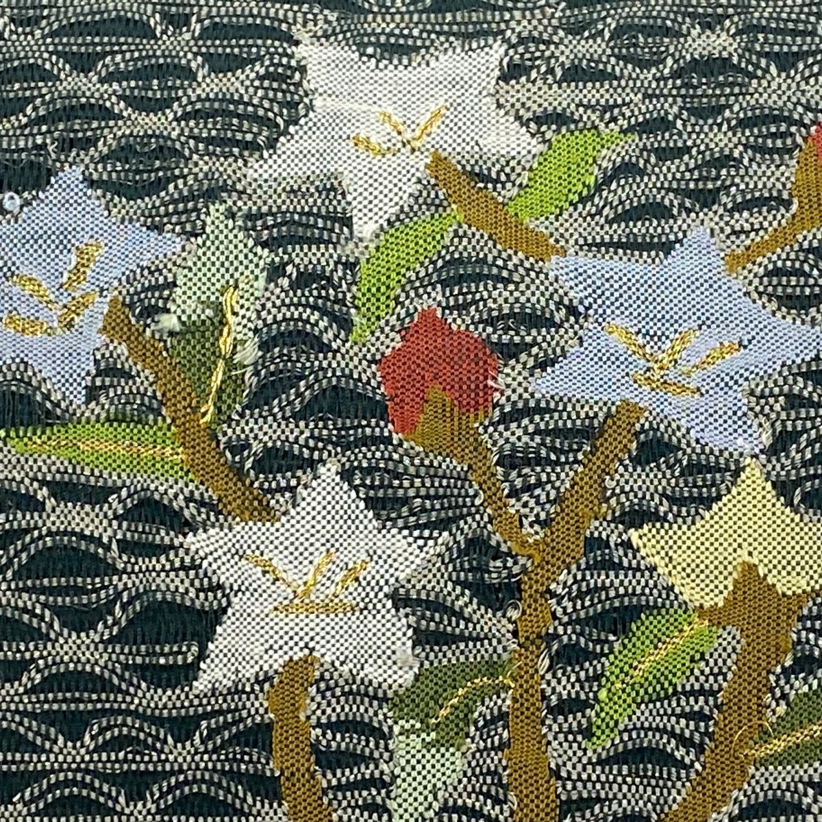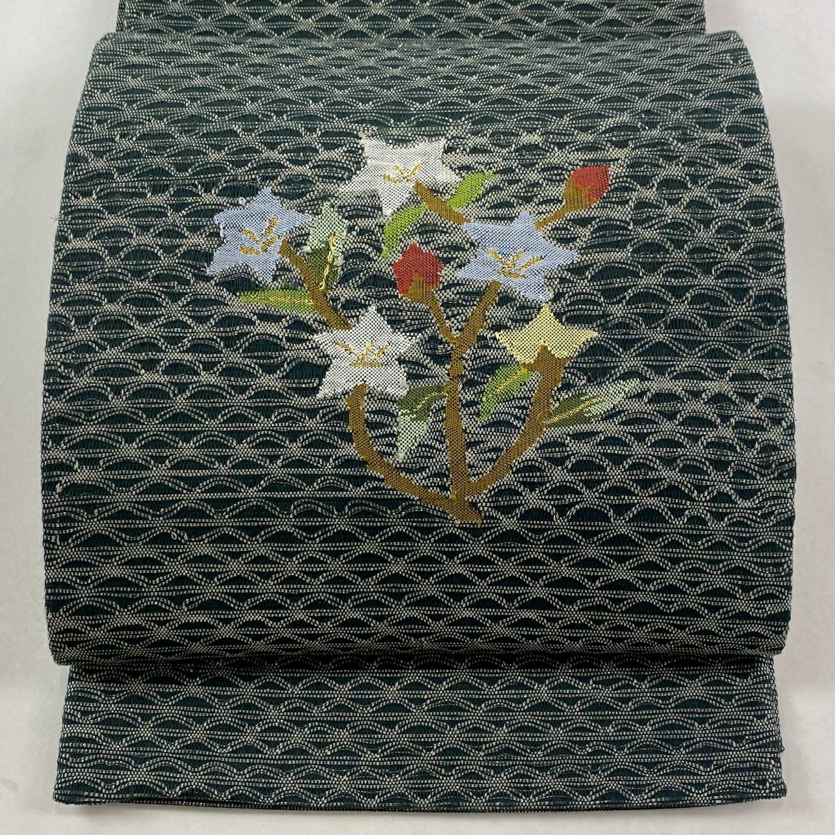 名古屋帯 秀品 枝花 幾何学模様 銀彩 金糸 青灰色 正絹