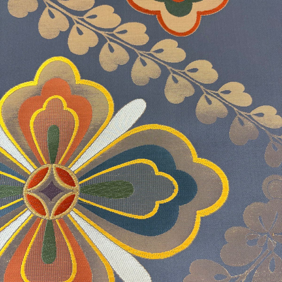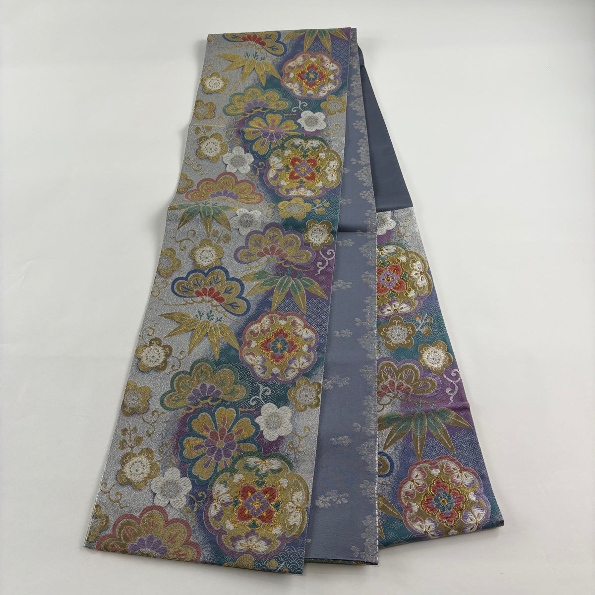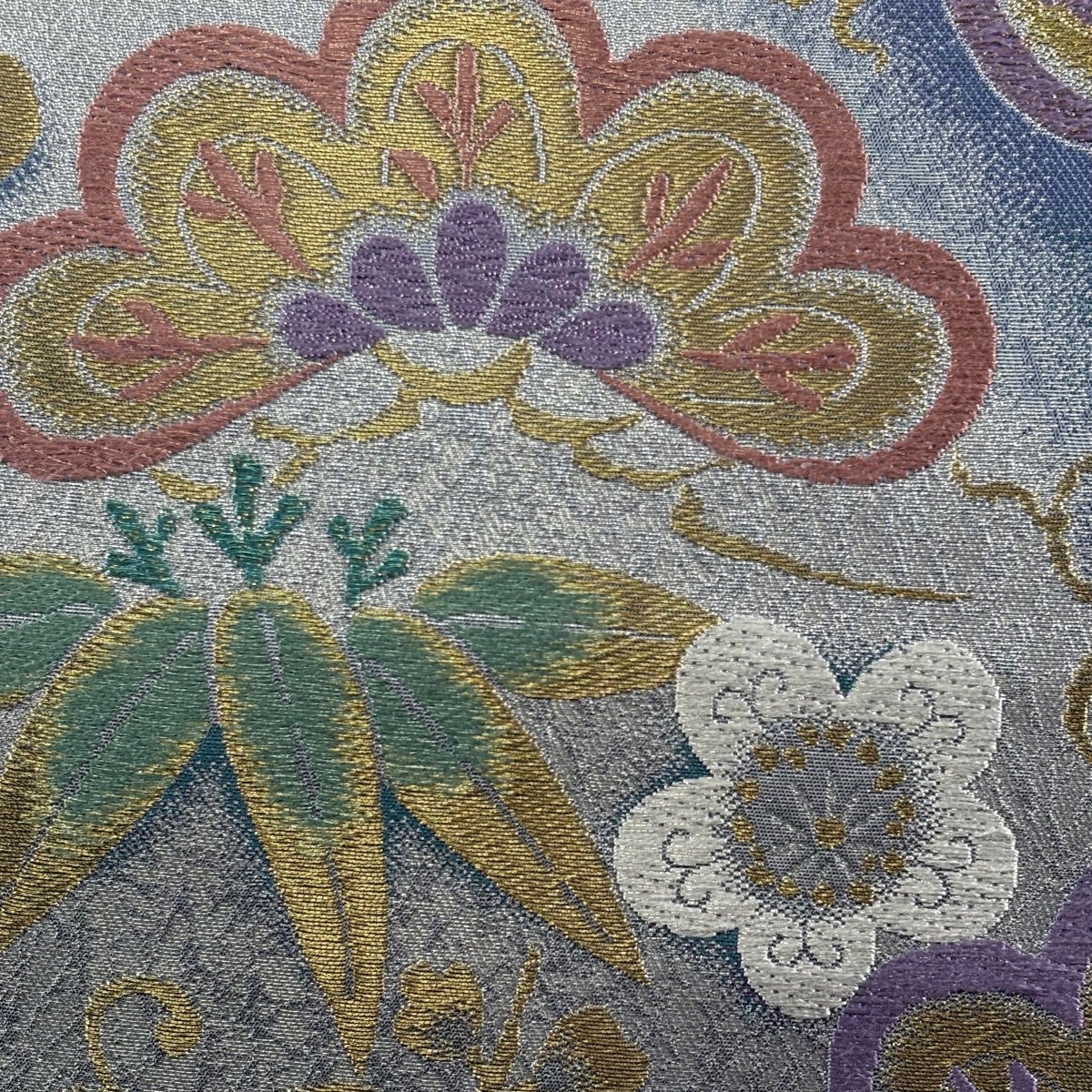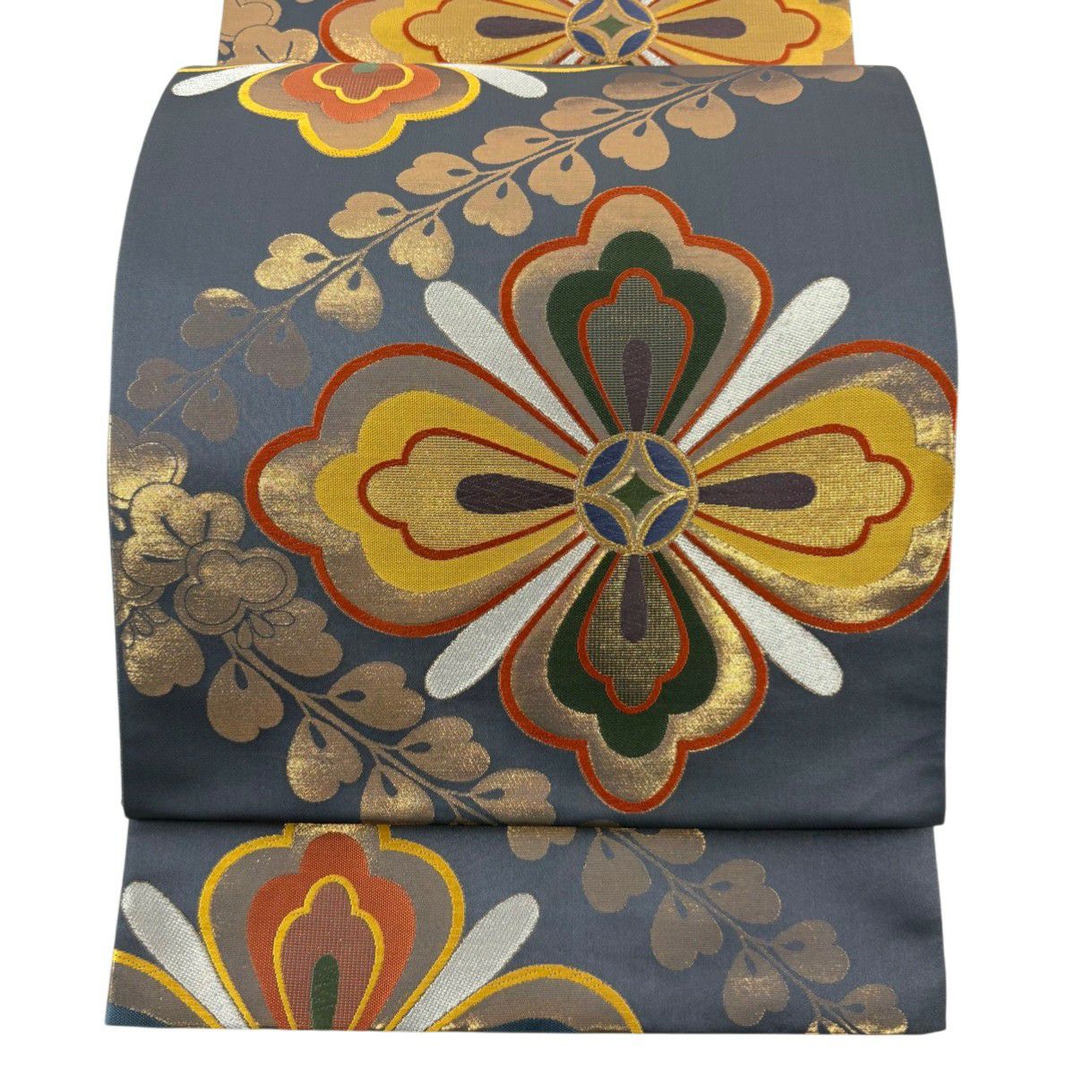 【美品】 袋帯 秀品 花菱 金糸 唐織 青灰色 六通 正絹