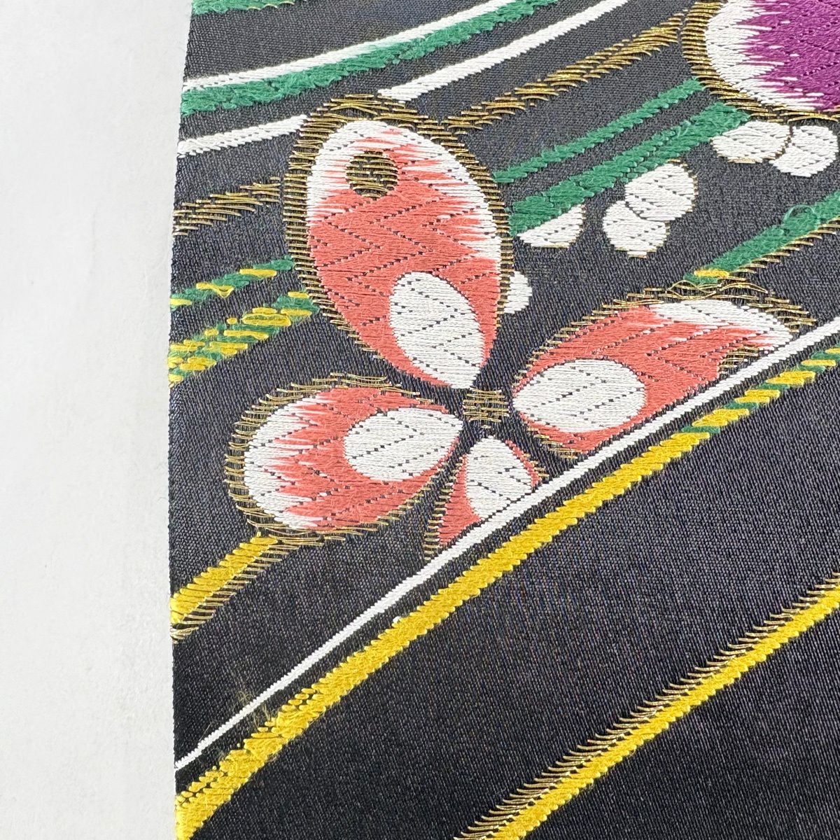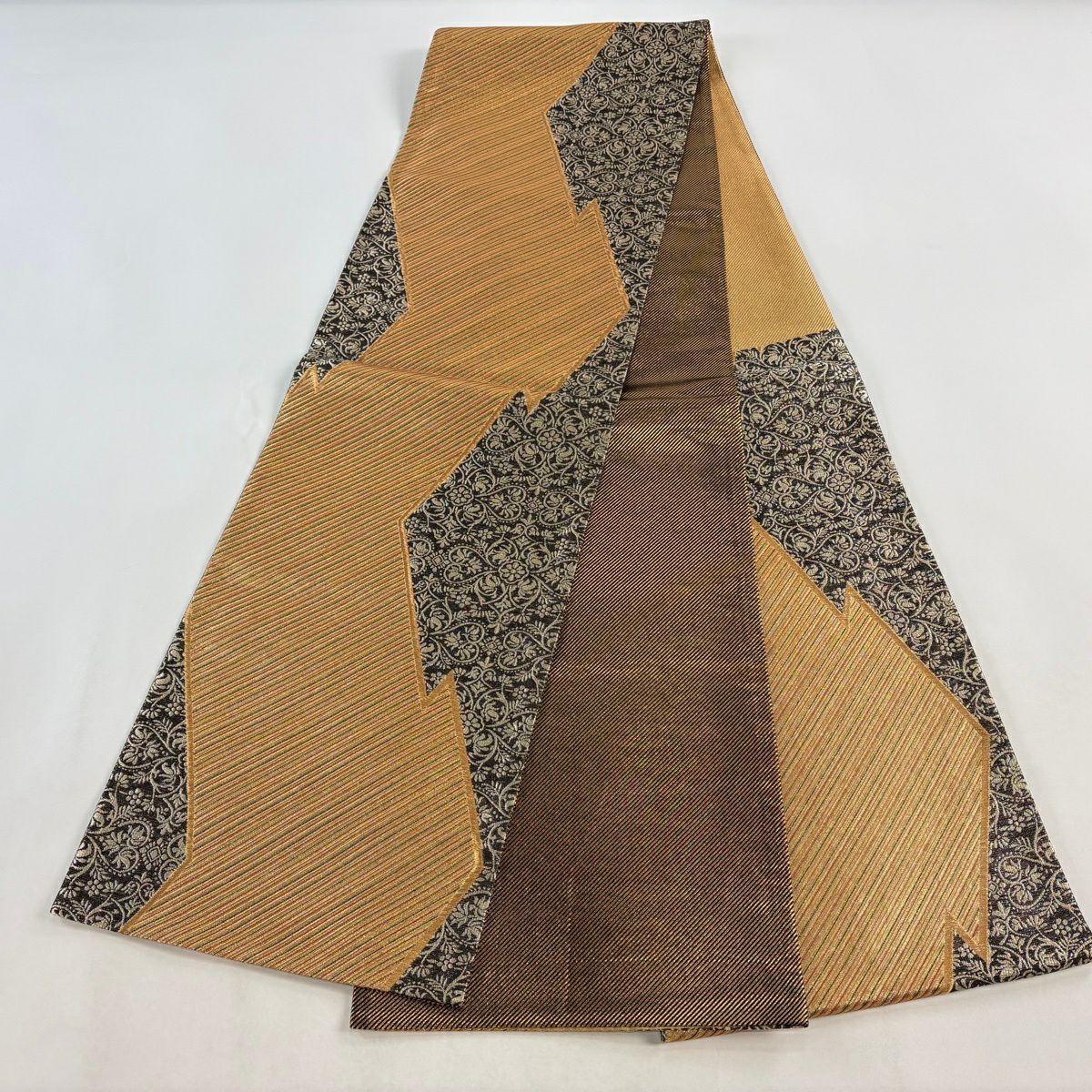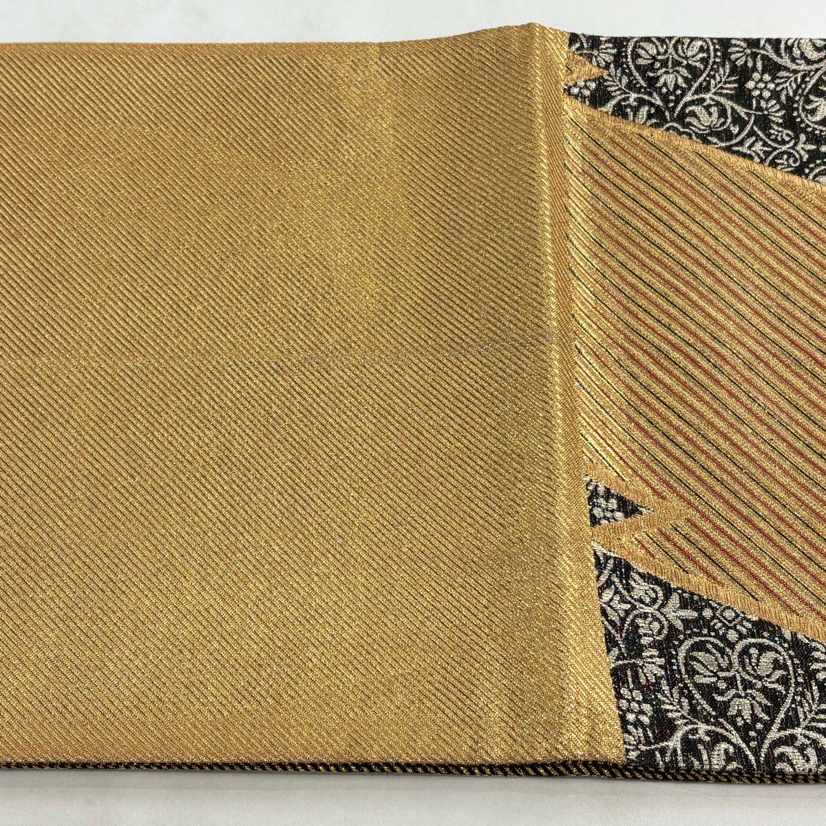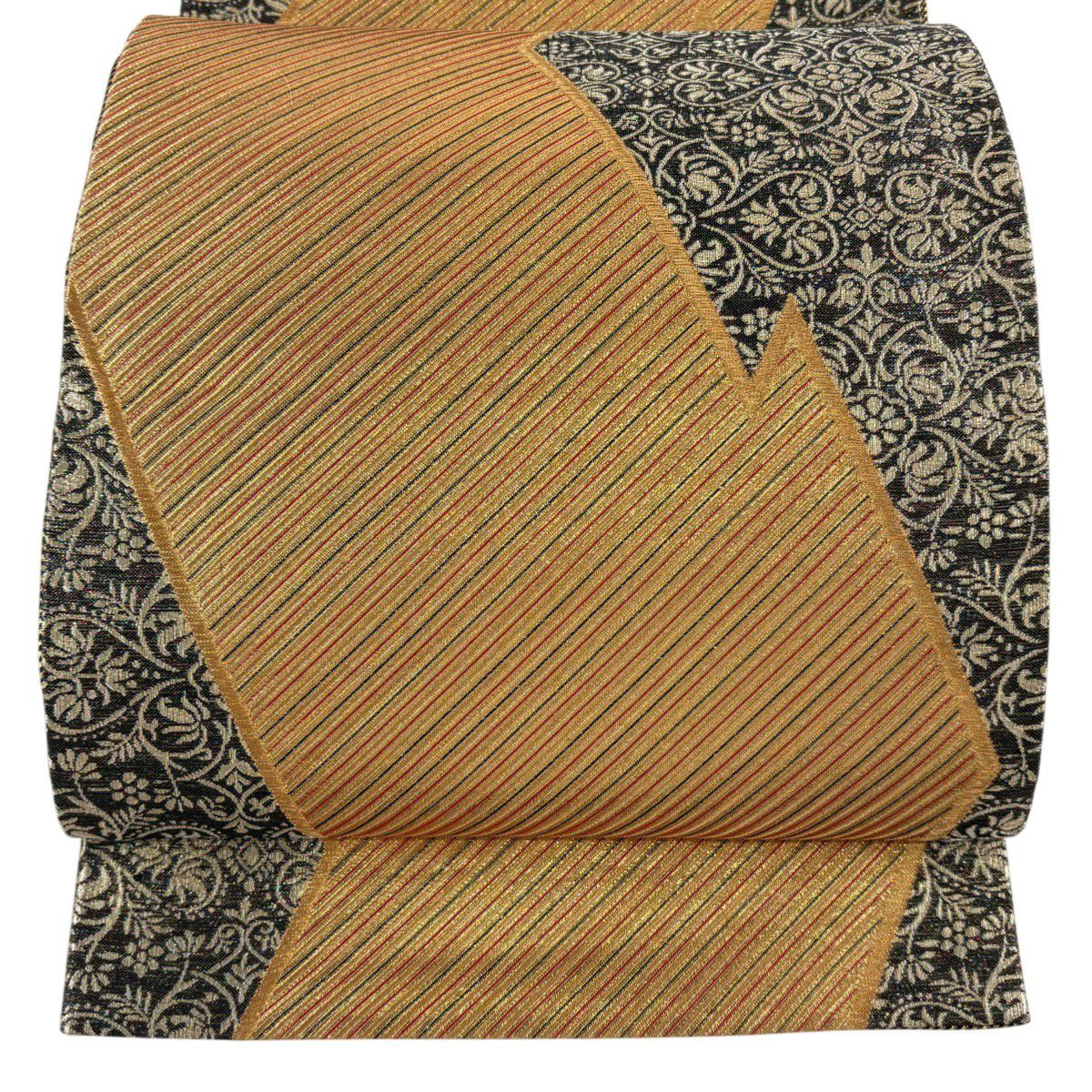 【美品】 袋帯 秀品 草花 斜縞 金糸 箔 金色 六通 正絹