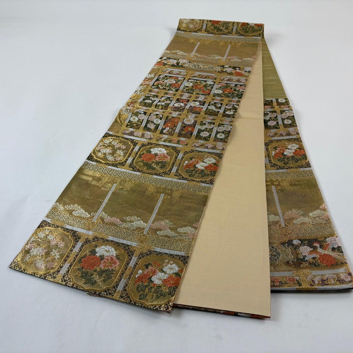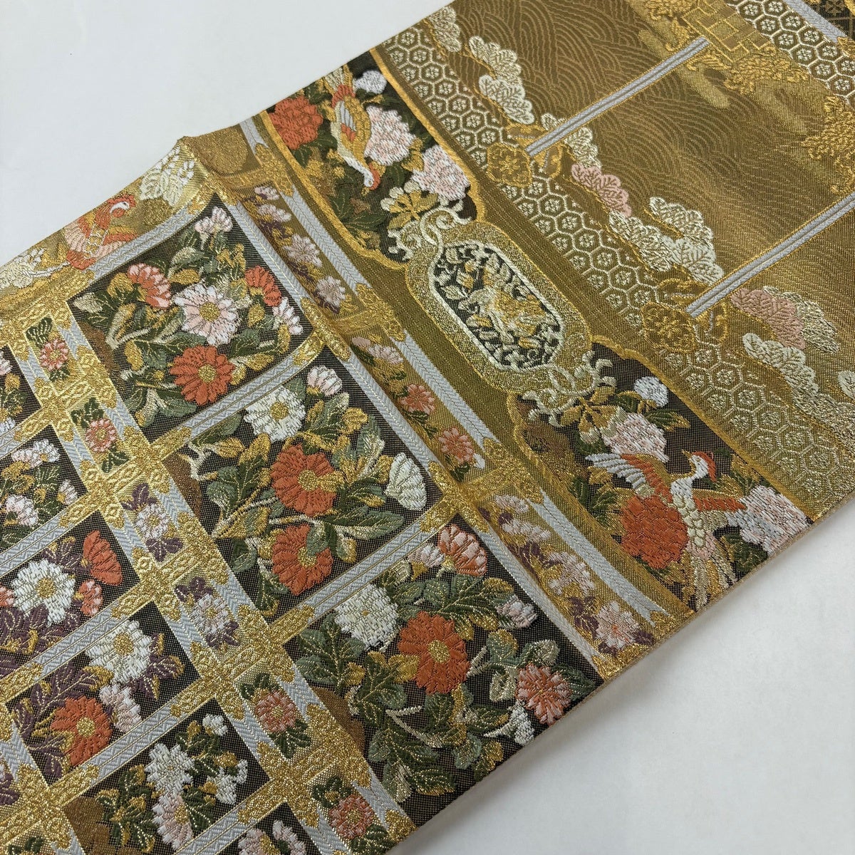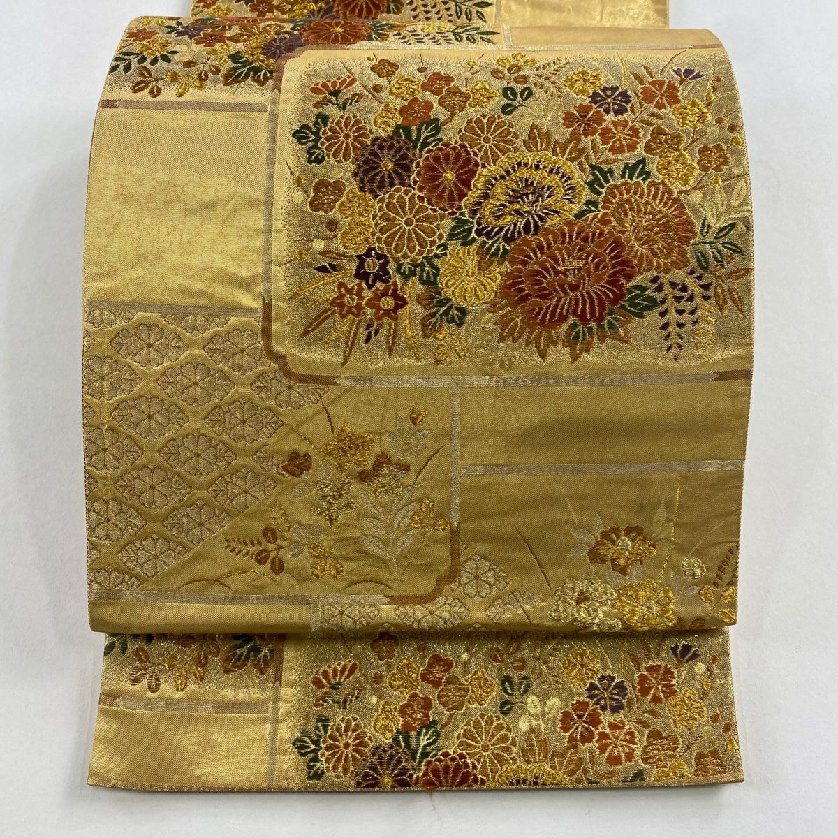 【美品】 袋帯 秀品 格天井 菊 箔 金糸 金色 六通 正絹