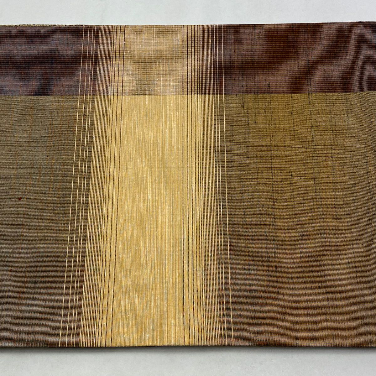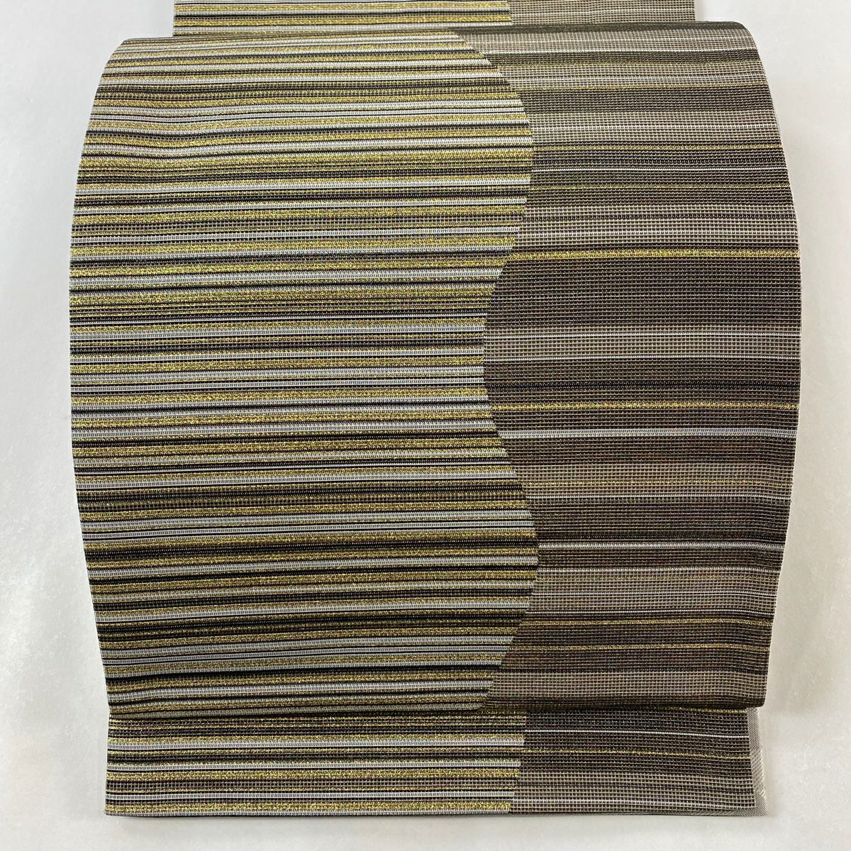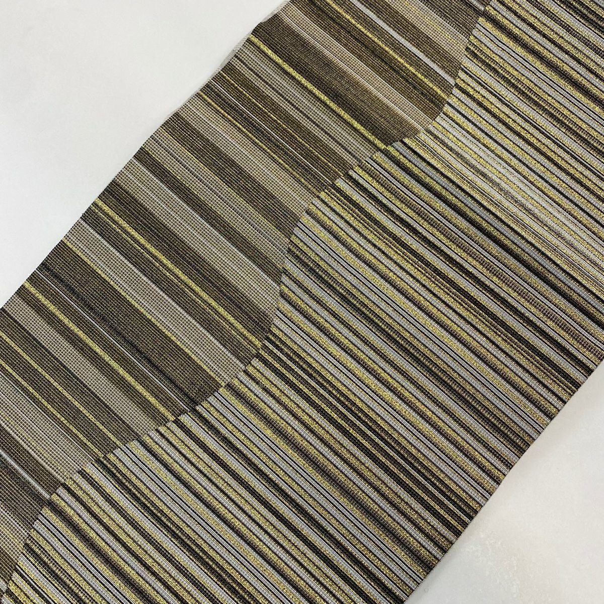 【在庫一掃】 袋帯 美品 秀品 縞 箔 灰茶 全通 正絹