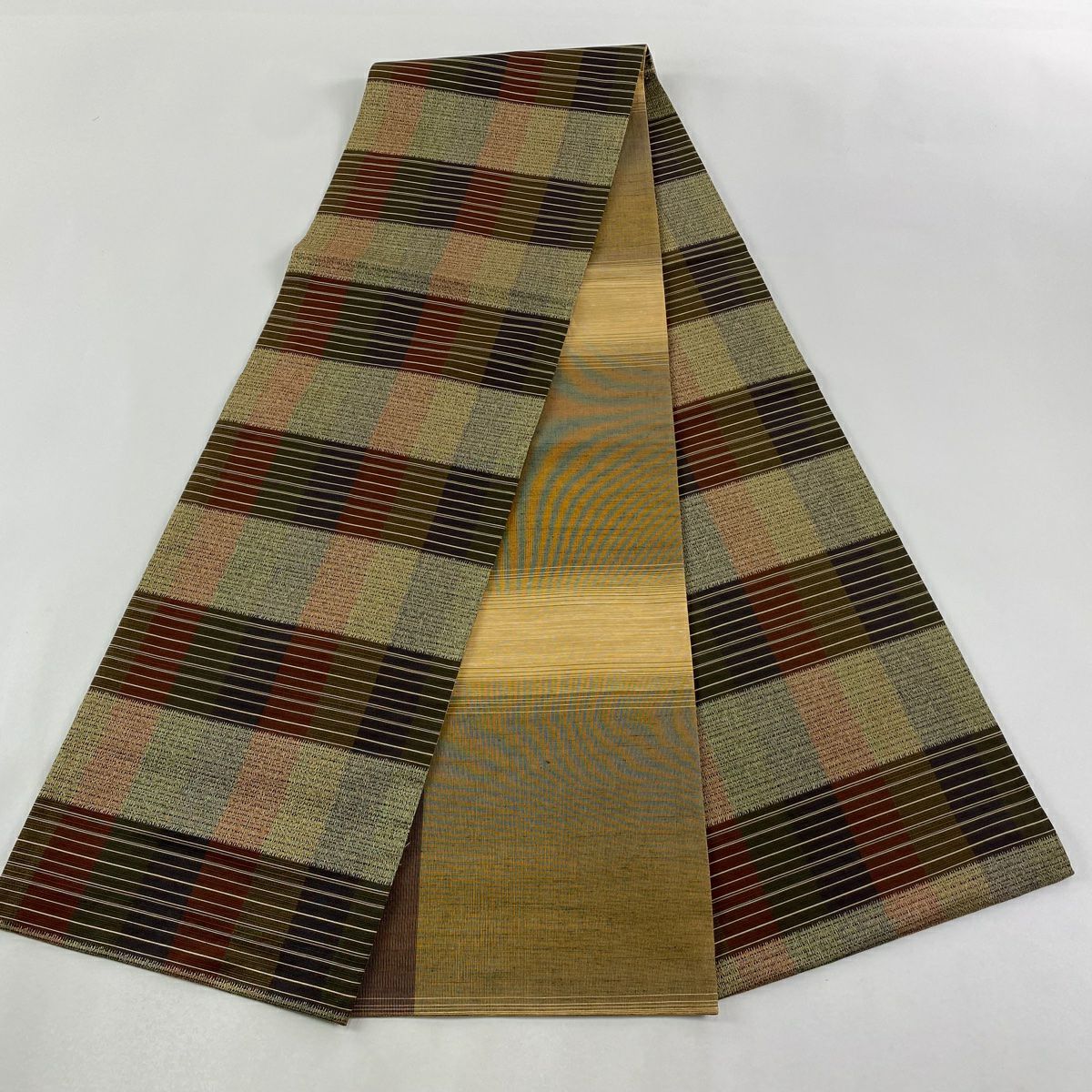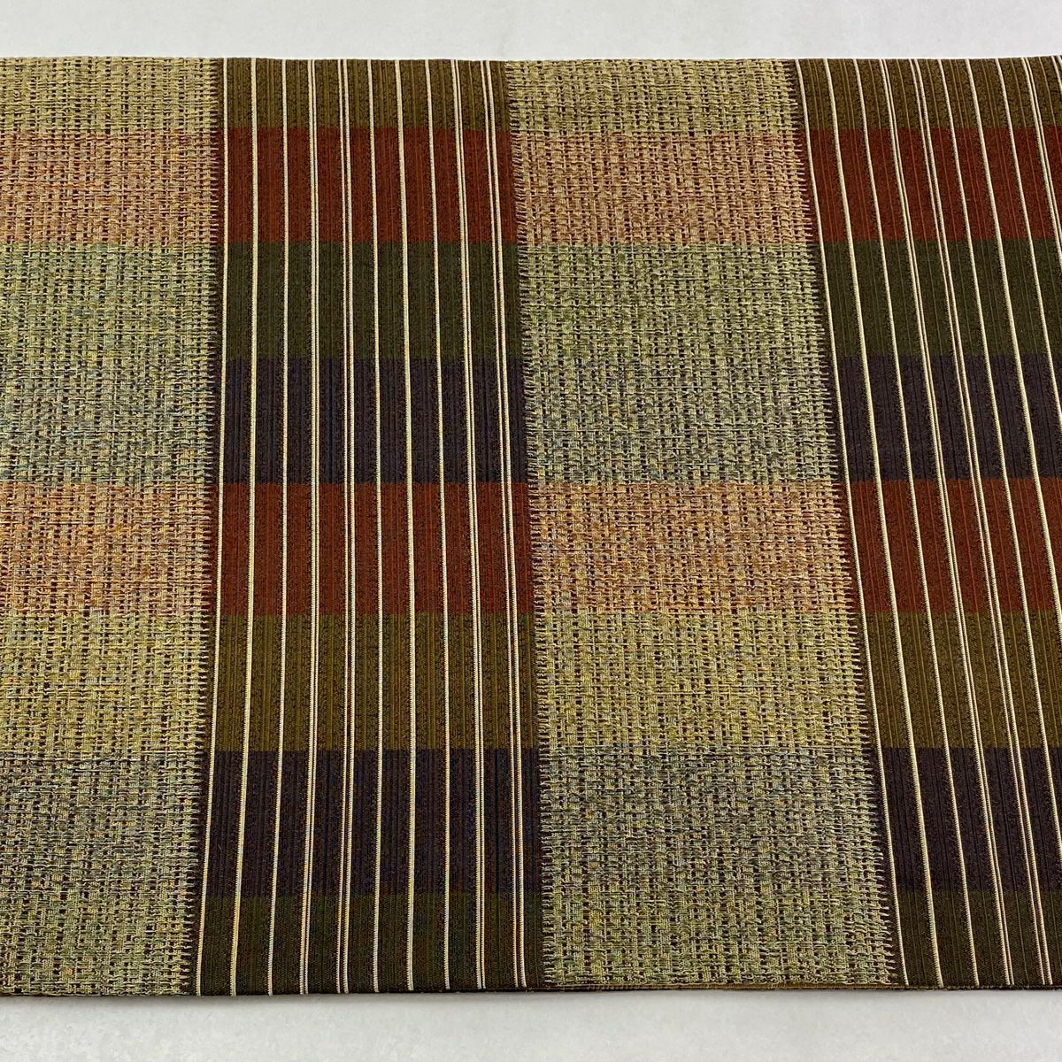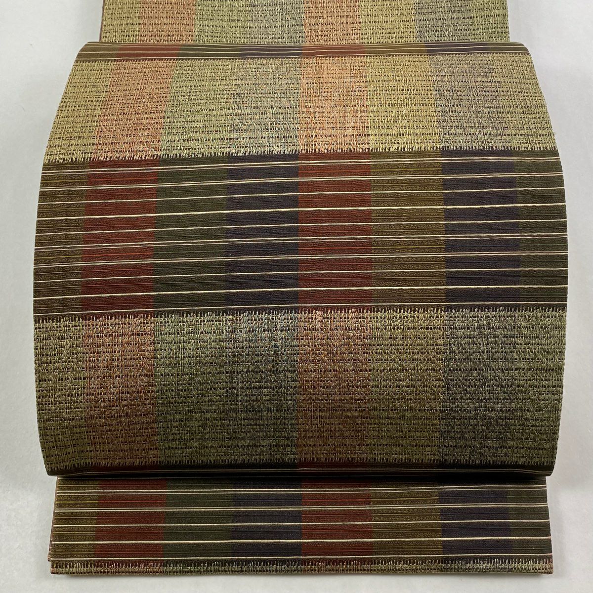 【在庫一掃】 袋帯 美品 秀品 縞 箔 灰茶 全通 正絹