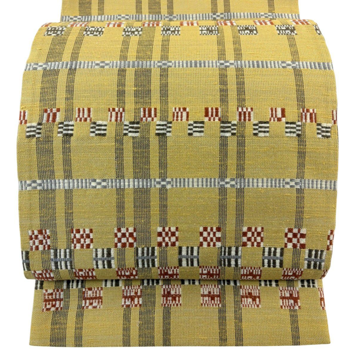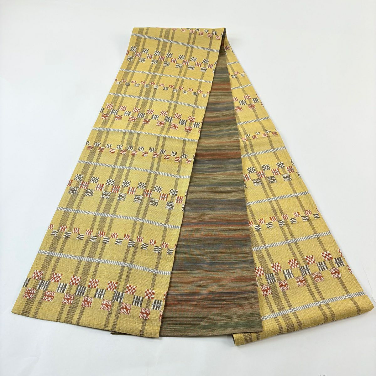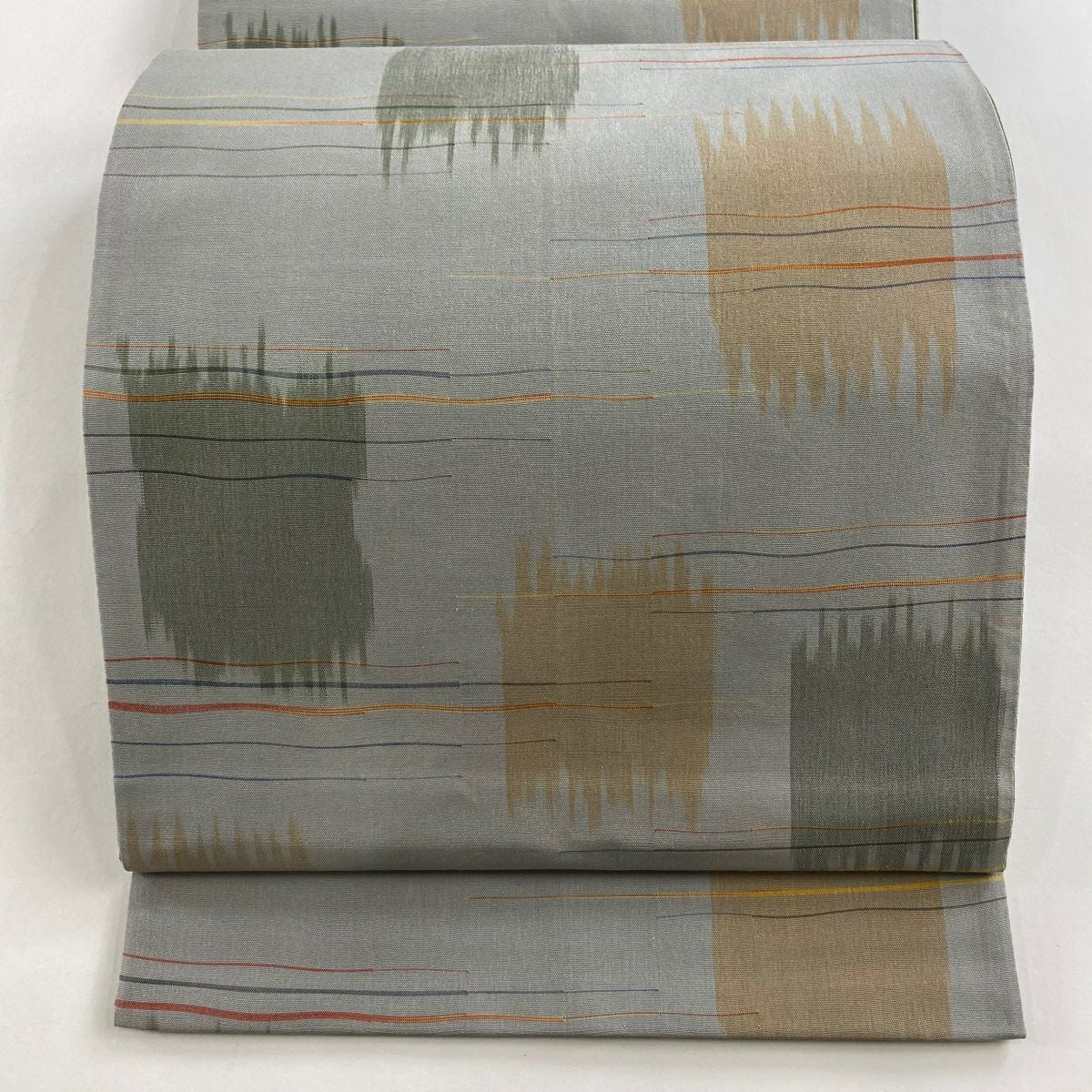 【美品】 袋帯 秀品 縞 幾何学模様 薄黄土色 全通 正絹