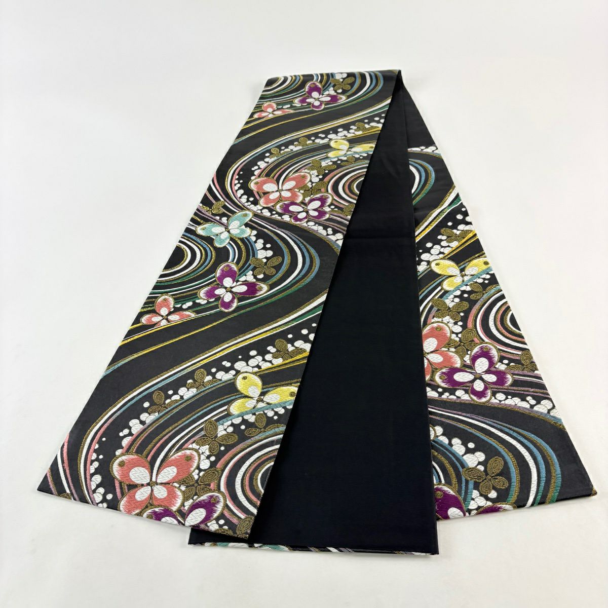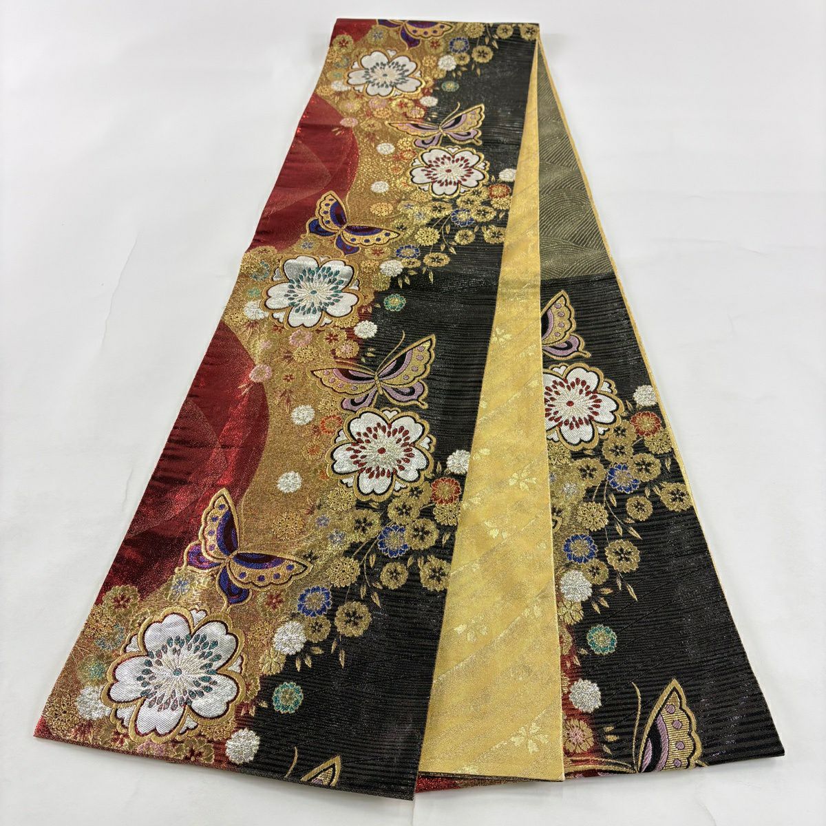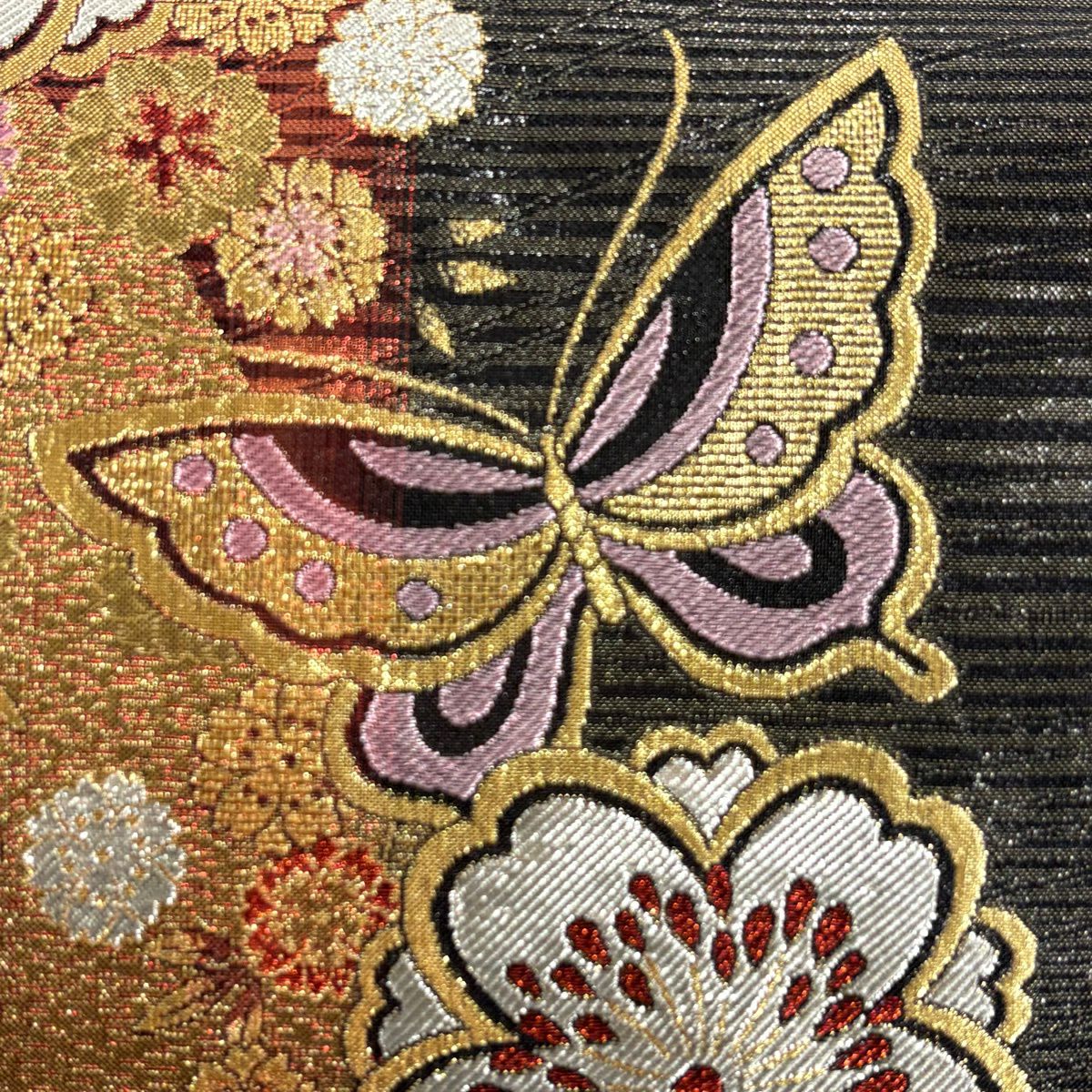 袋帯 秀品 振袖向き 蝶 流水 金糸 刺繍 黒 六通 正絹