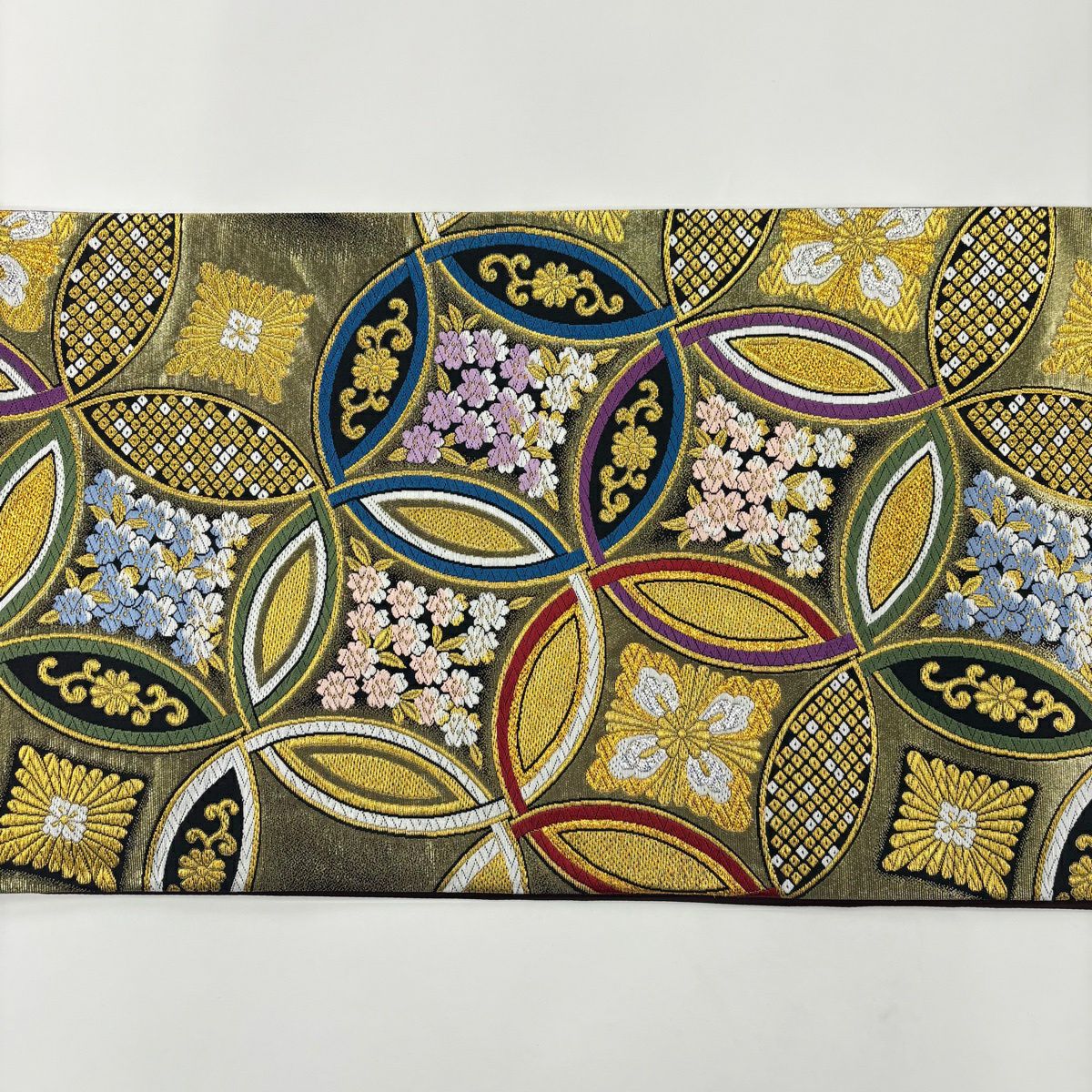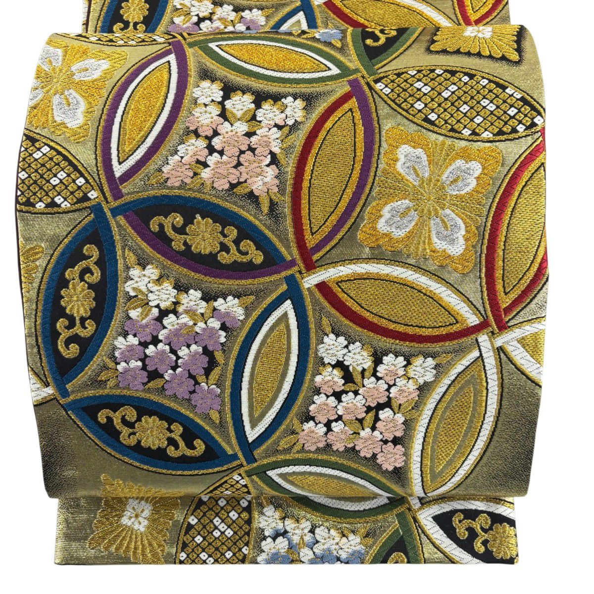 【美品】 袋帯 秀品 七宝 桜 金糸 刺繍 金色 全通 正絹