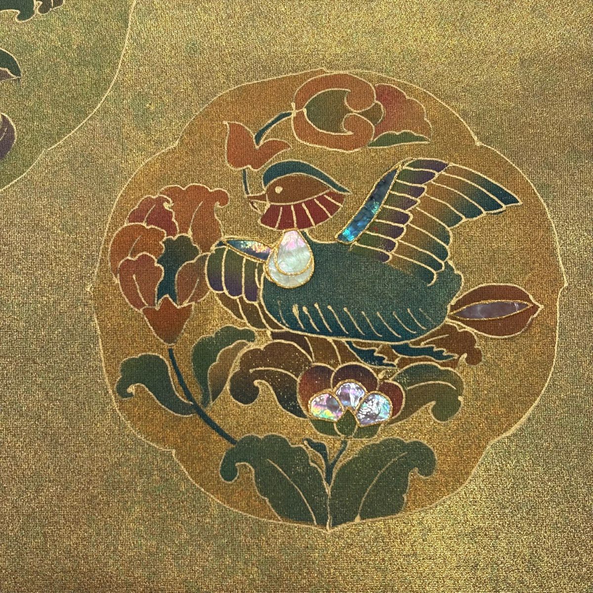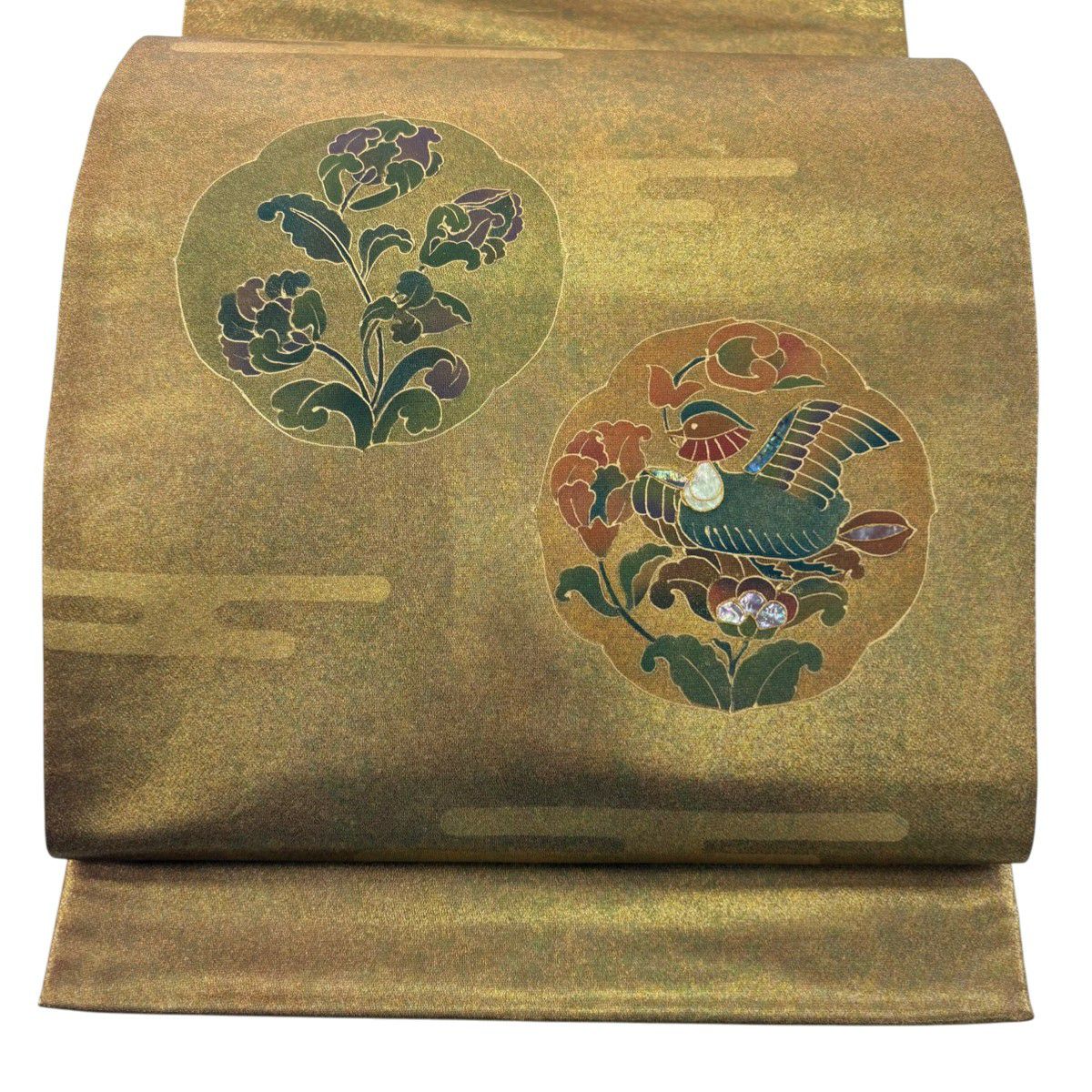 袋帯 秀品 花喰い鳥 草花 螺鈿 金彩 金色 お太鼓柄 正絹