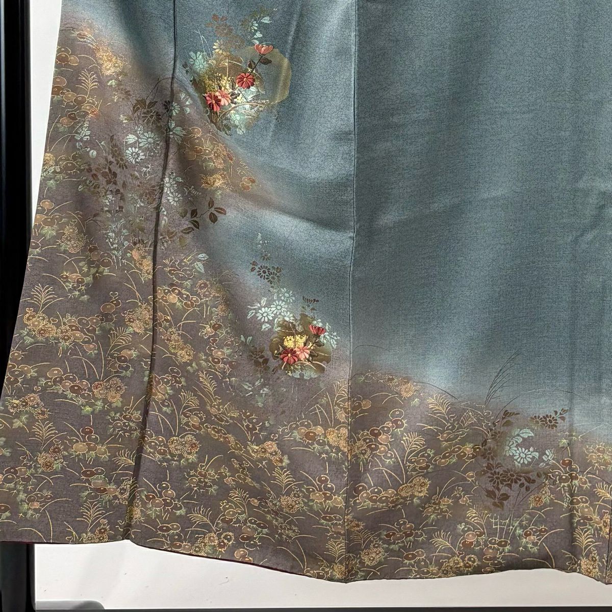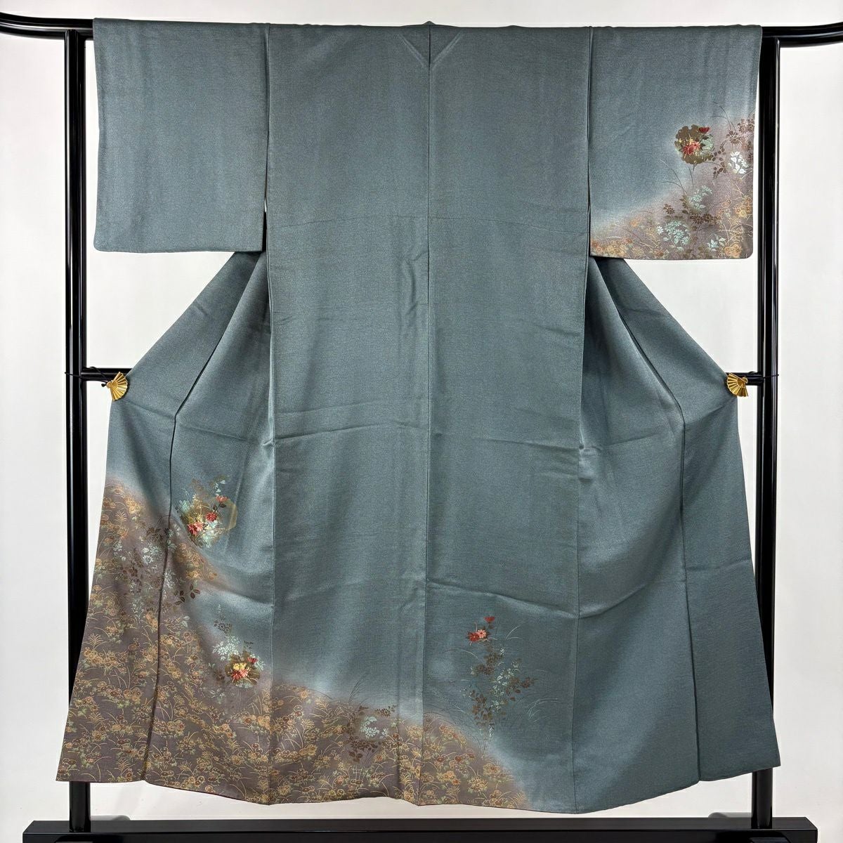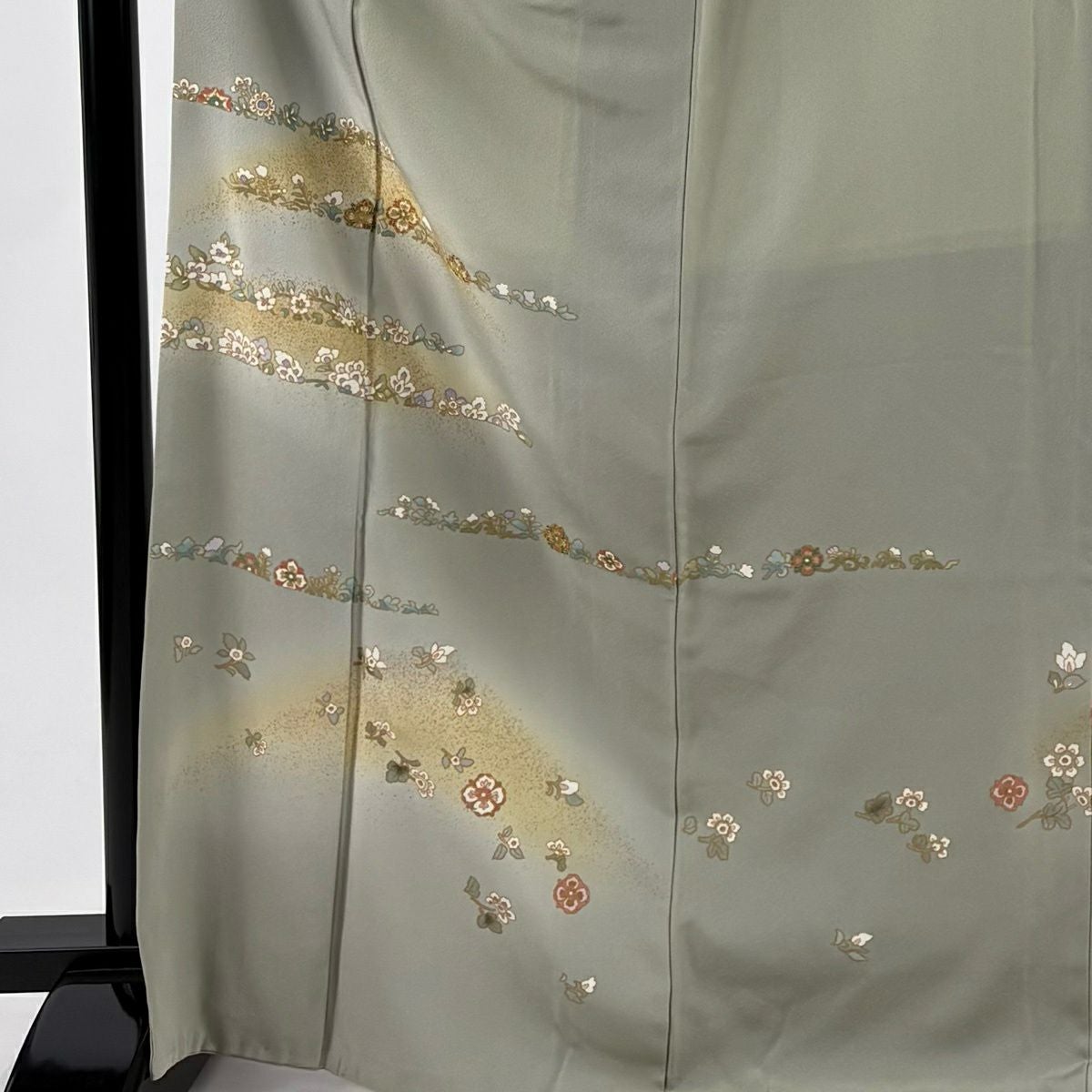 50%OFF 訪問着 身丈154cm 裄丈65cm M 袷 草花 染め分け ぼかし 灰緑 正絹 秀品 K50