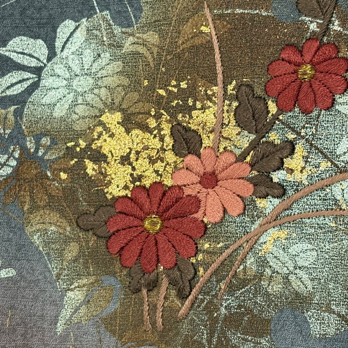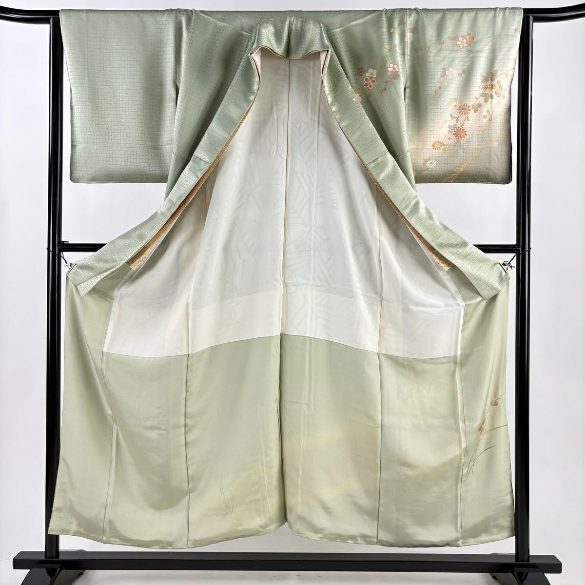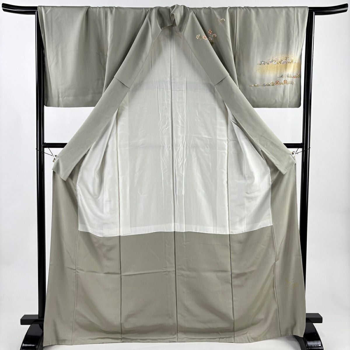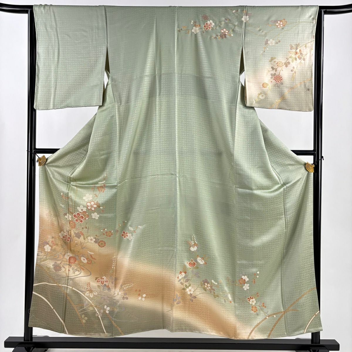 50%OFF 付下げ 身丈159cm 裄丈65cm M 袷 枝花 籠目 刺繍 金彩 灰緑 正絹 秀品 K50