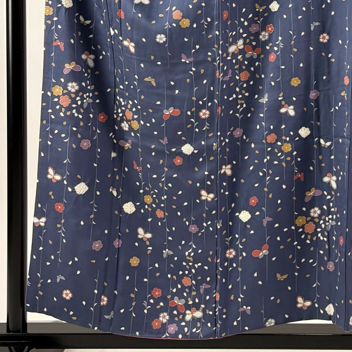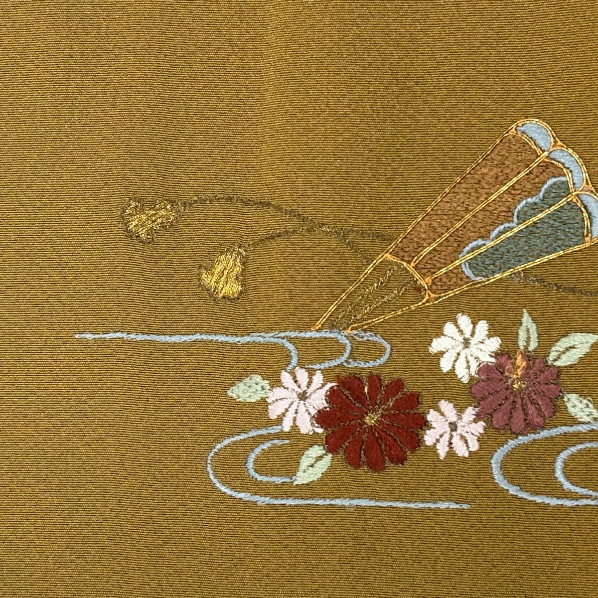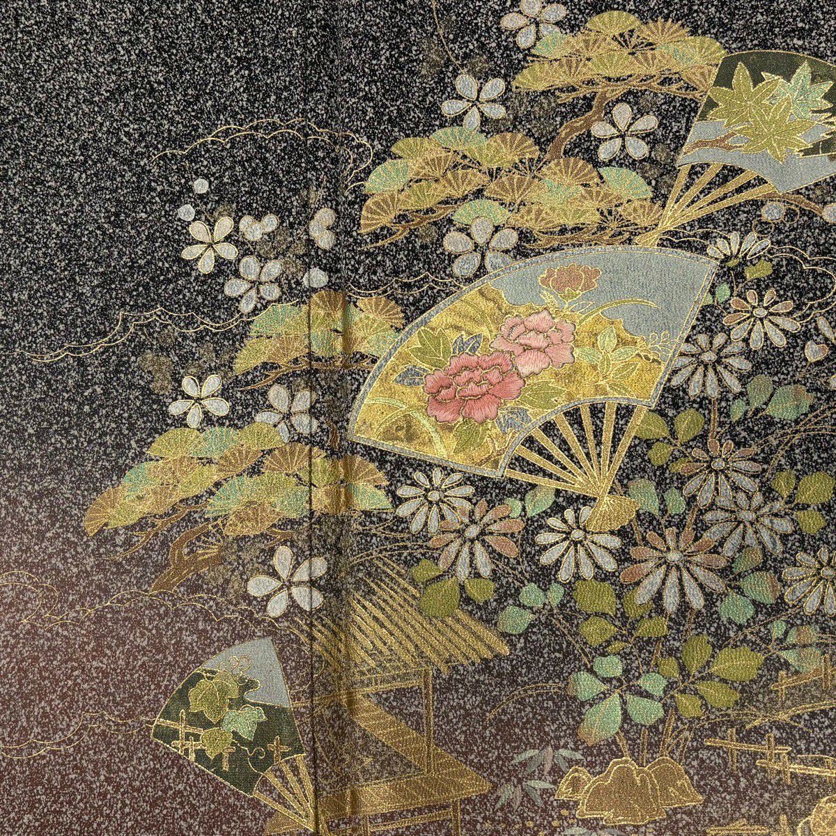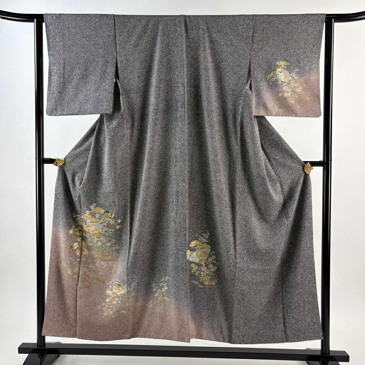 50%OFF 付下げ 身丈152.5cm 裄丈62.5cm S 袷 扇 草花 刺繍 金彩 黒灰 正絹 秀品 K50