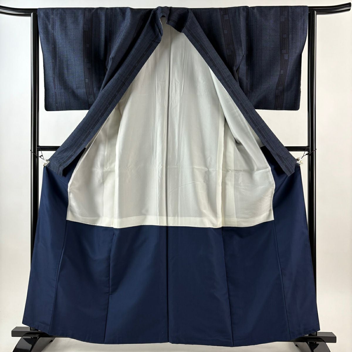 50%OFF 【美品】 紬 身丈161cm 裄丈62cm S 袷 縦縞 幾何学模様 紺色 正絹 秀品 K50
