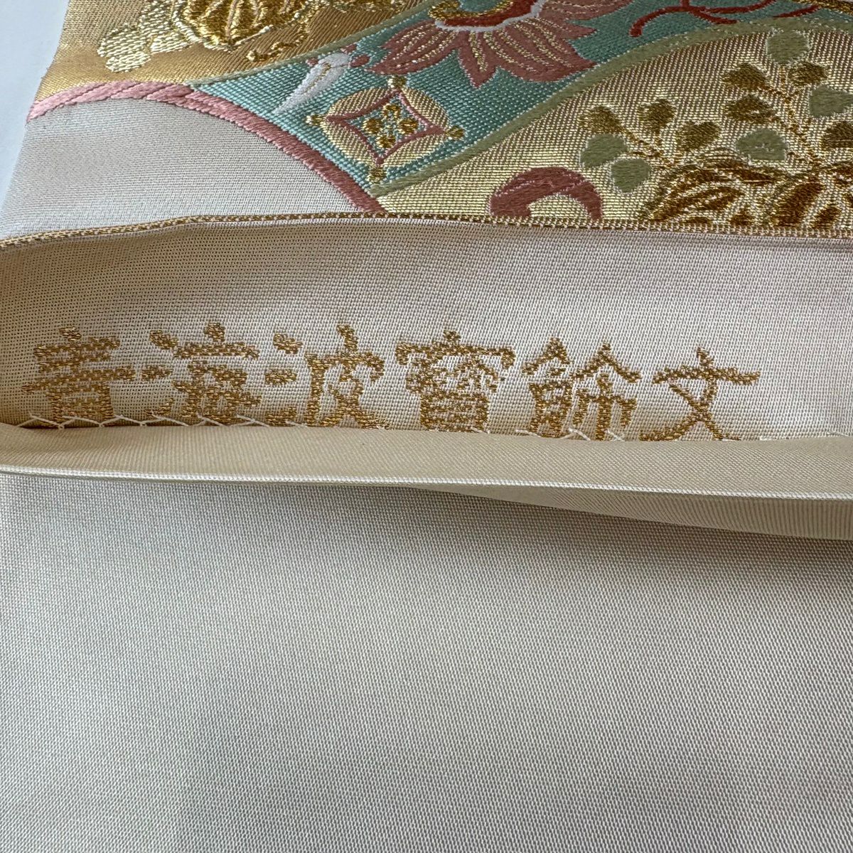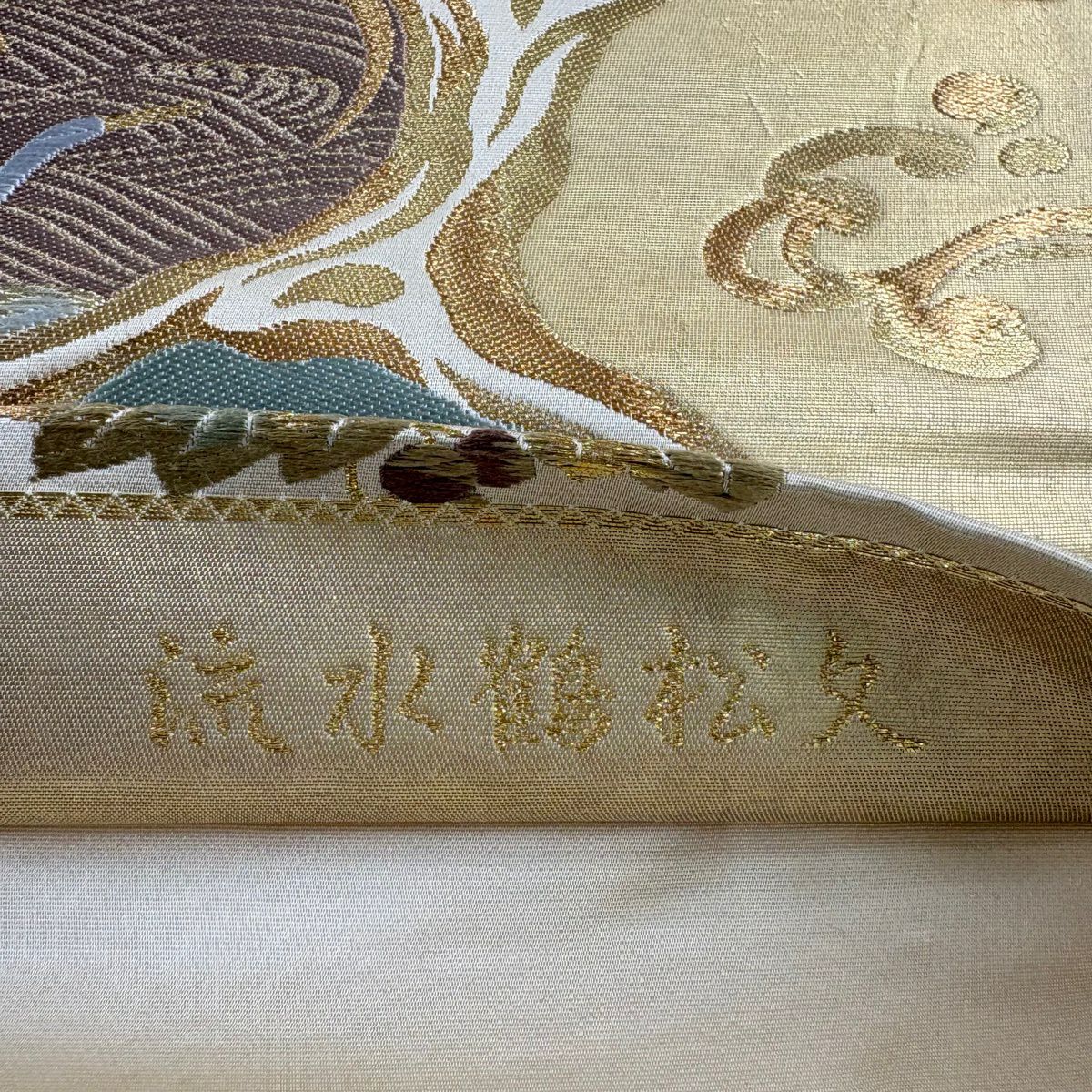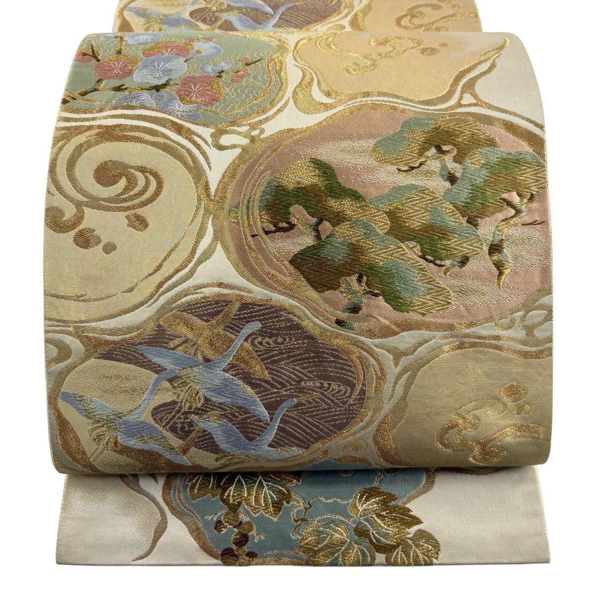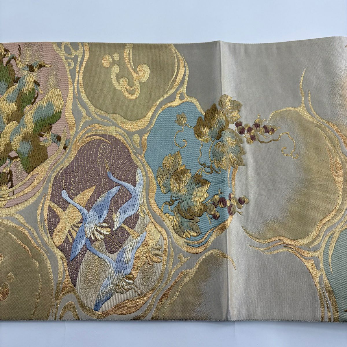50%OFF 【美品】 袋帯 秀品 本金箔 流水鶴松文 葡萄 唐織 金糸 ベージュ 六通 正絹 K50