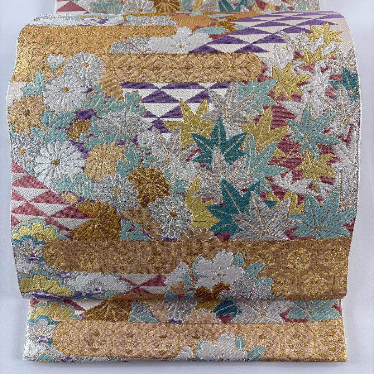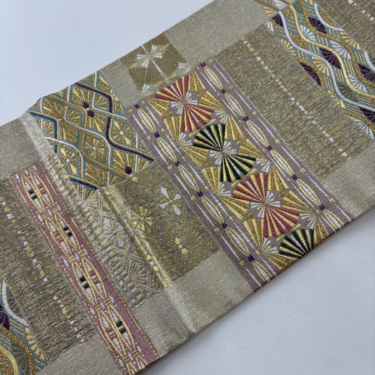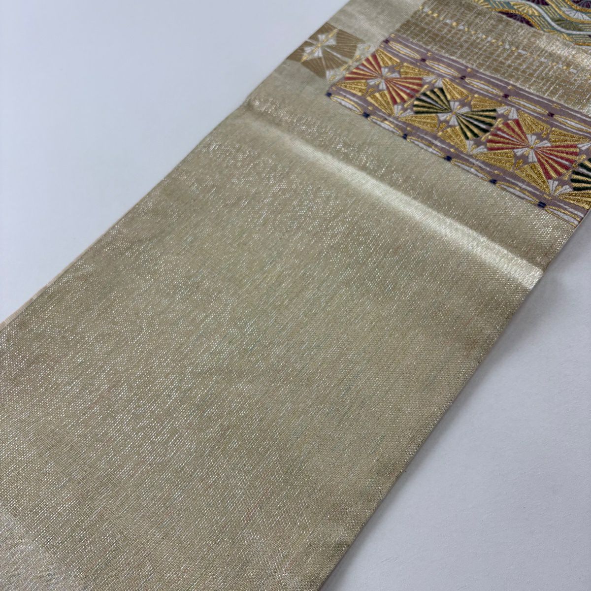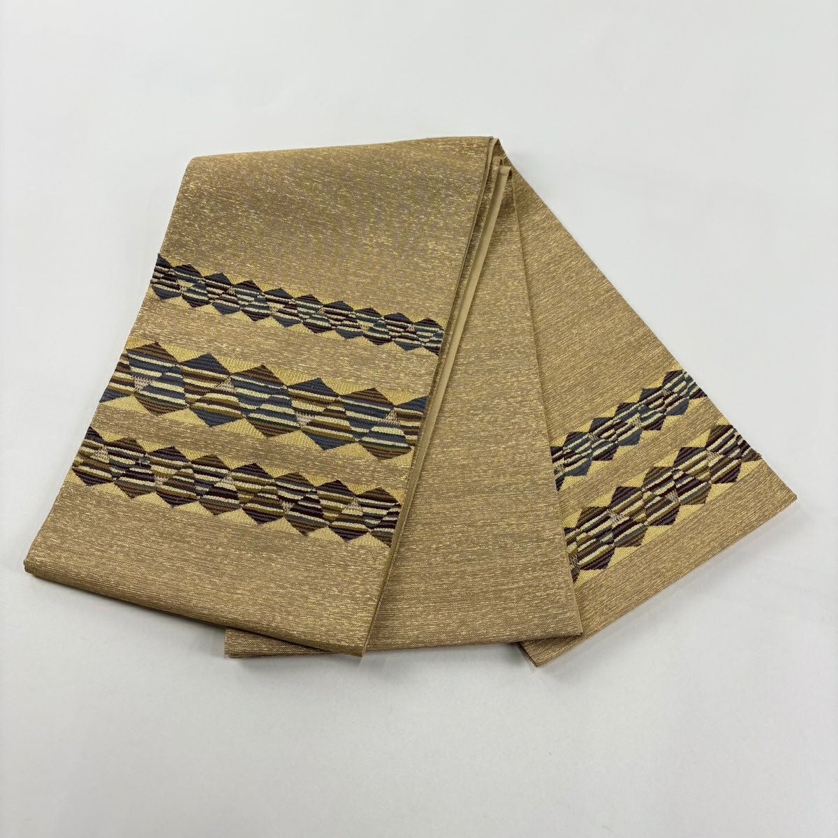 【最終値引き】 77%OFF 【美品】 袋帯 秀品 若松 幾何学模様 金銀糸 箔 薄茶色 六通 正絹 K70