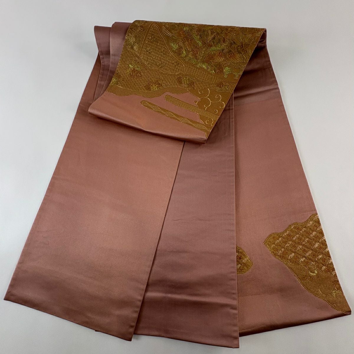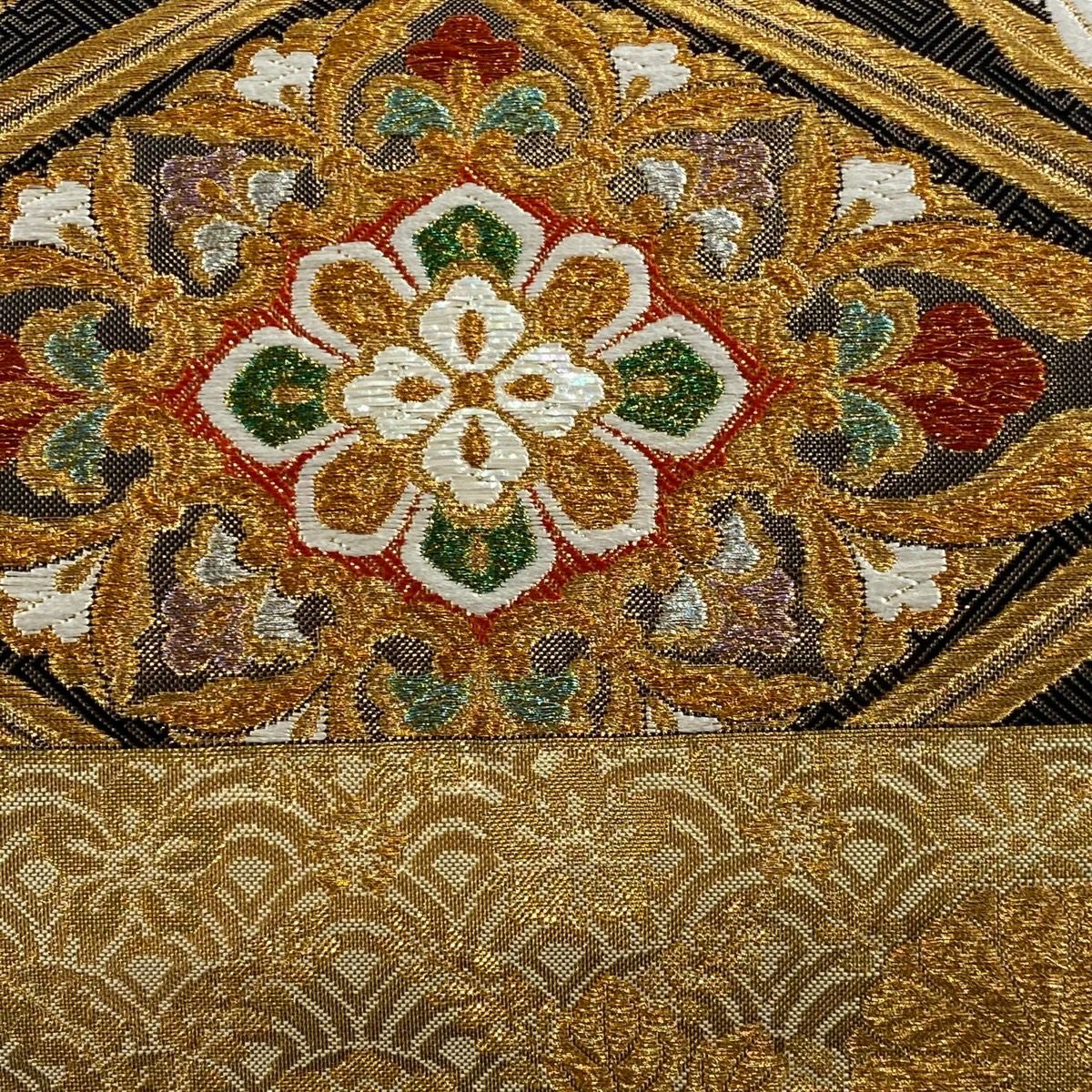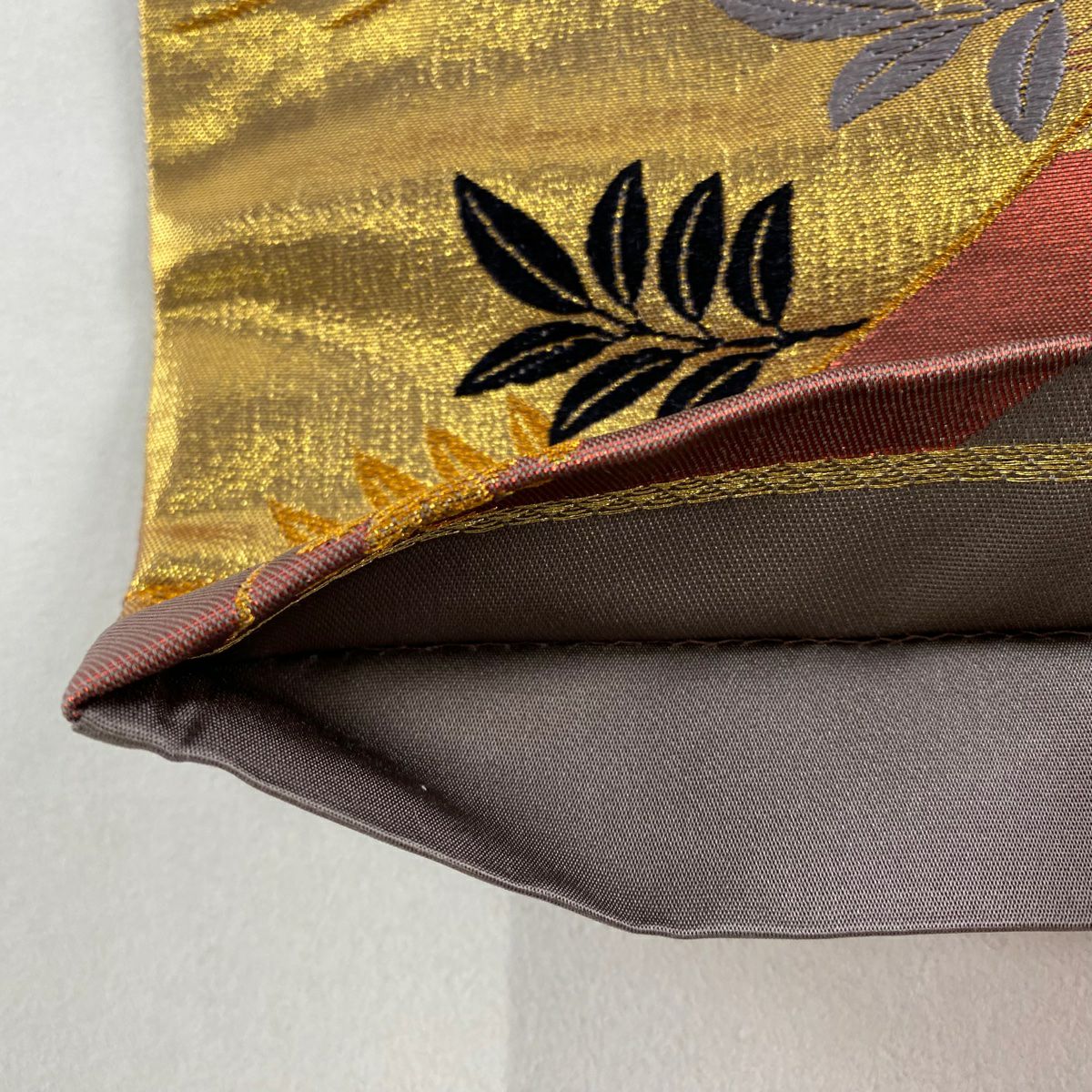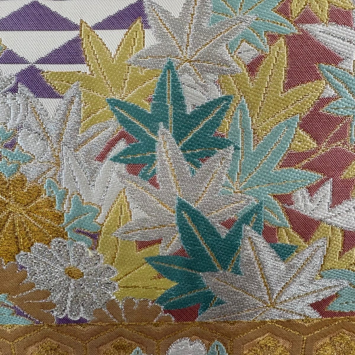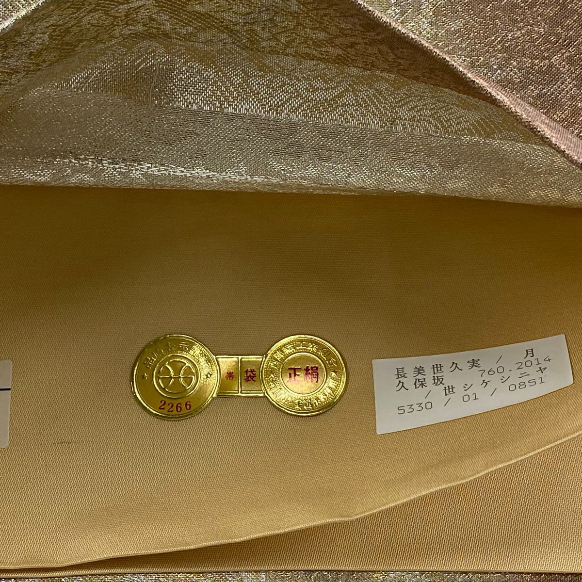 【最終値引き】 77%OFF 【美品】 袋帯 秀品 若松 幾何学模様 金銀糸 箔 薄茶色 六通 正絹 K70