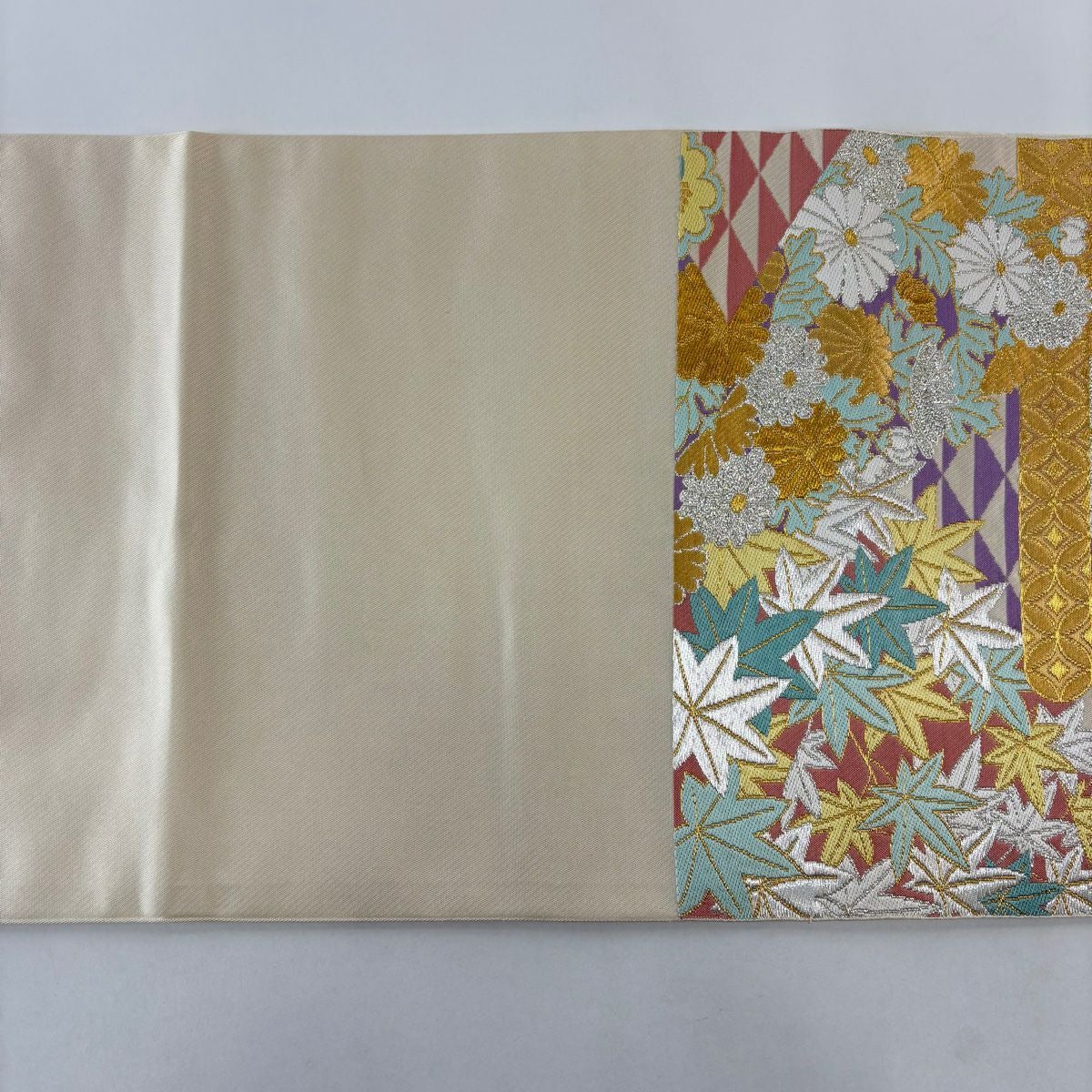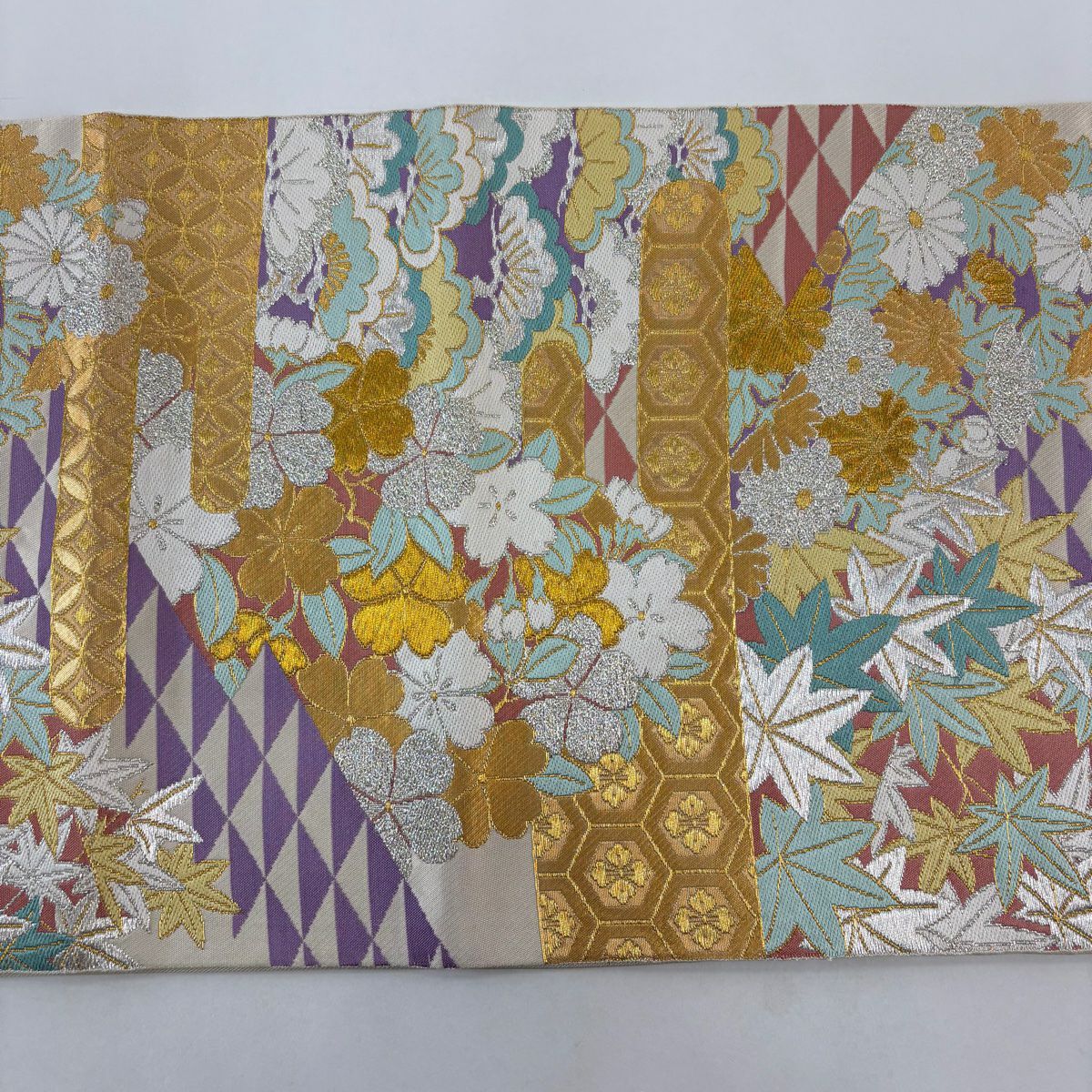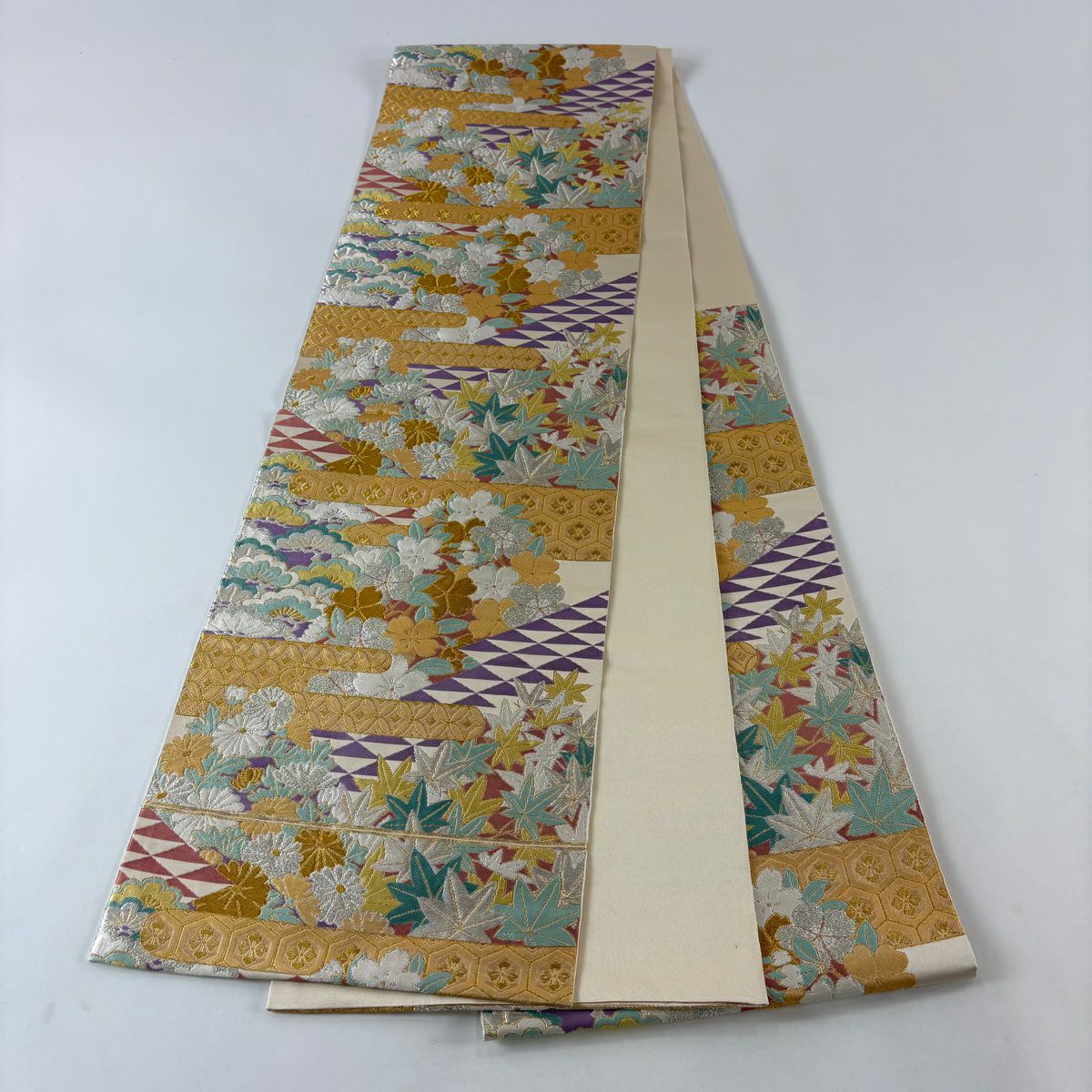 【最終値引き】 77%OFF 【美品】 袋帯 秀品 草花 ヱ霞 金銀糸 箔 ベージュ 六通 正絹 K70