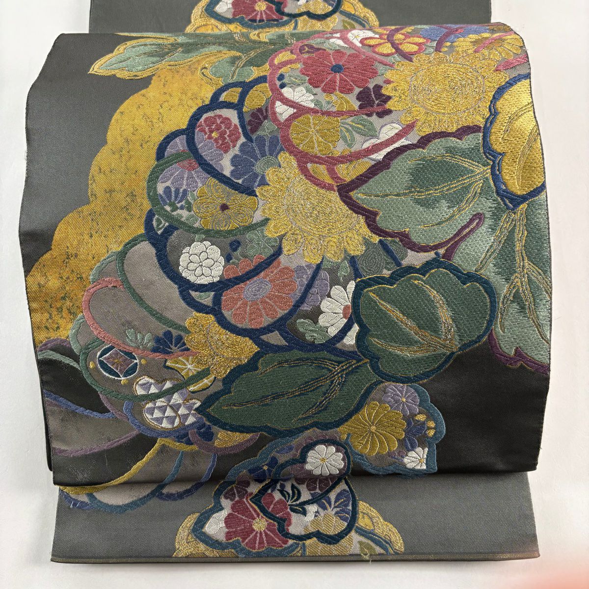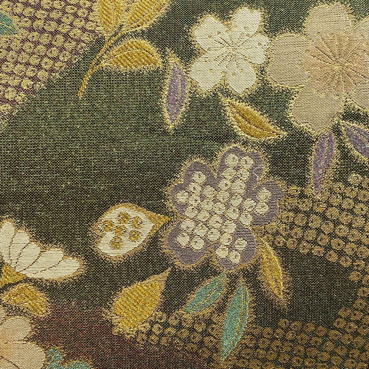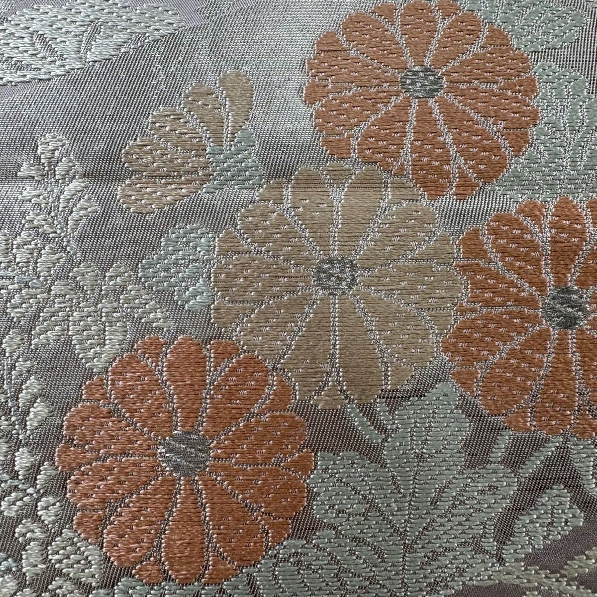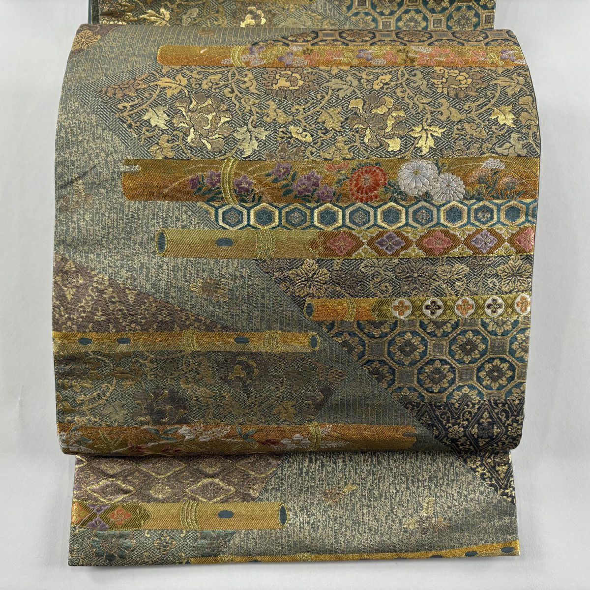【最終値引き】 70%OFF 袋帯 秀品 国風錦 関西仕立て 菊 草花 唐織 箔 灰緑 六通 正絹 K70