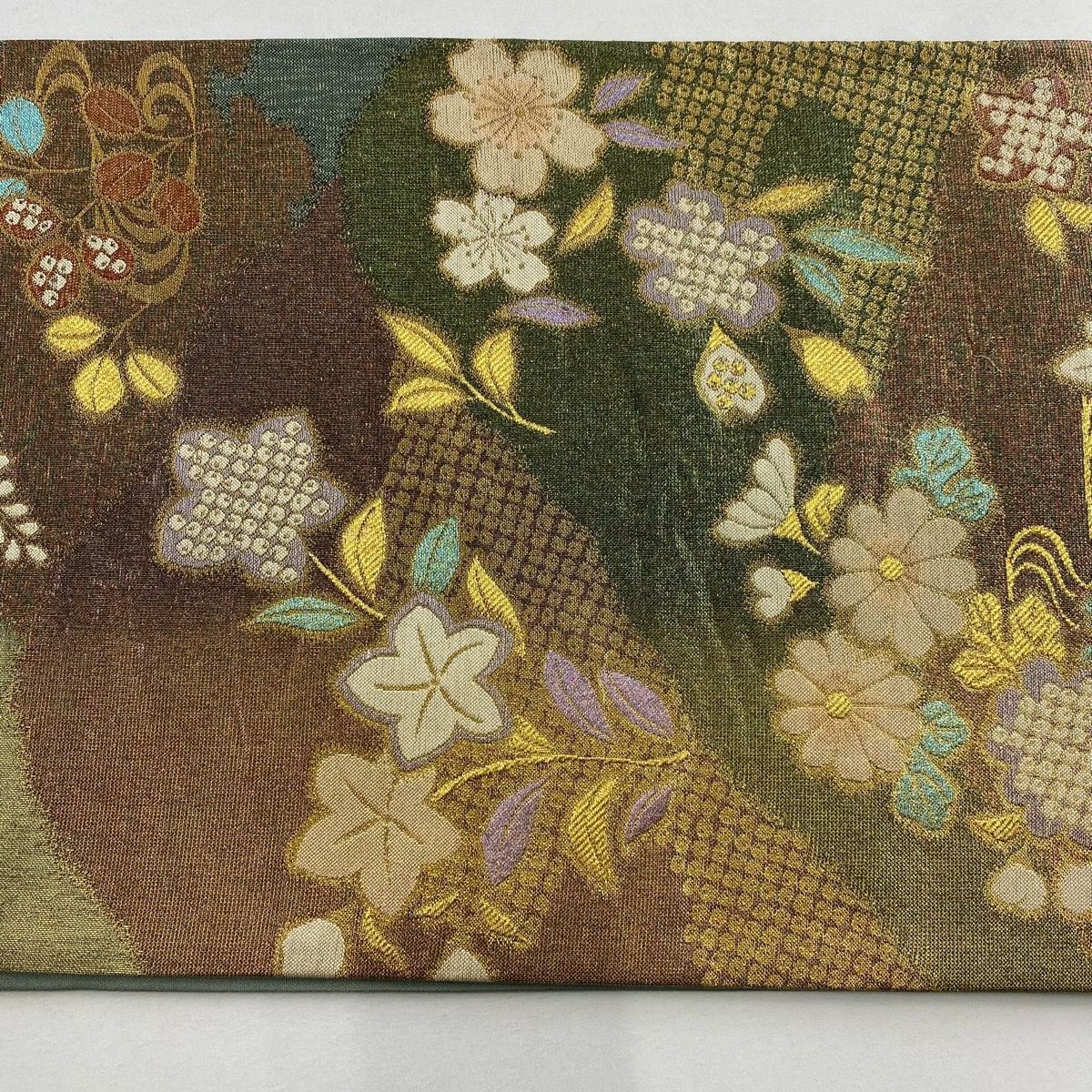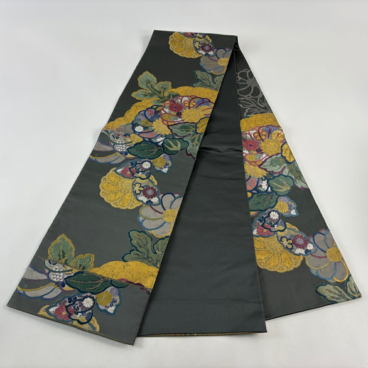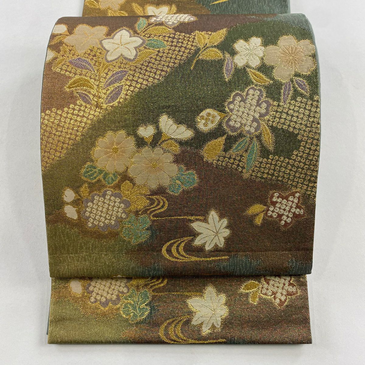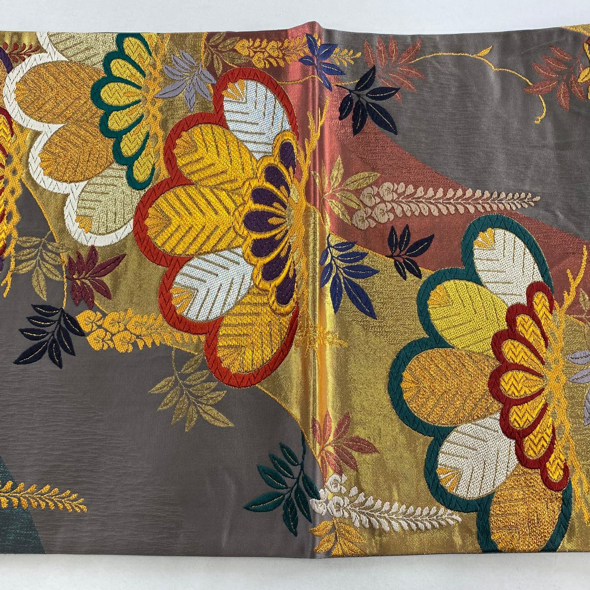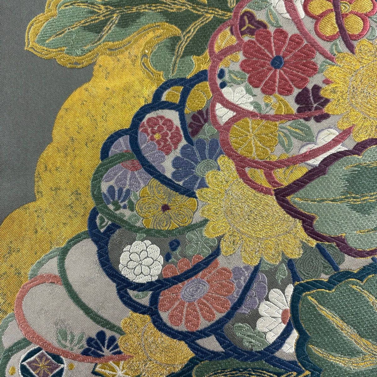 【最終値引き】 70%OFF 袋帯 秀品 国風錦 関西仕立て 菊 草花 唐織 箔 灰緑 六通 正絹 K70