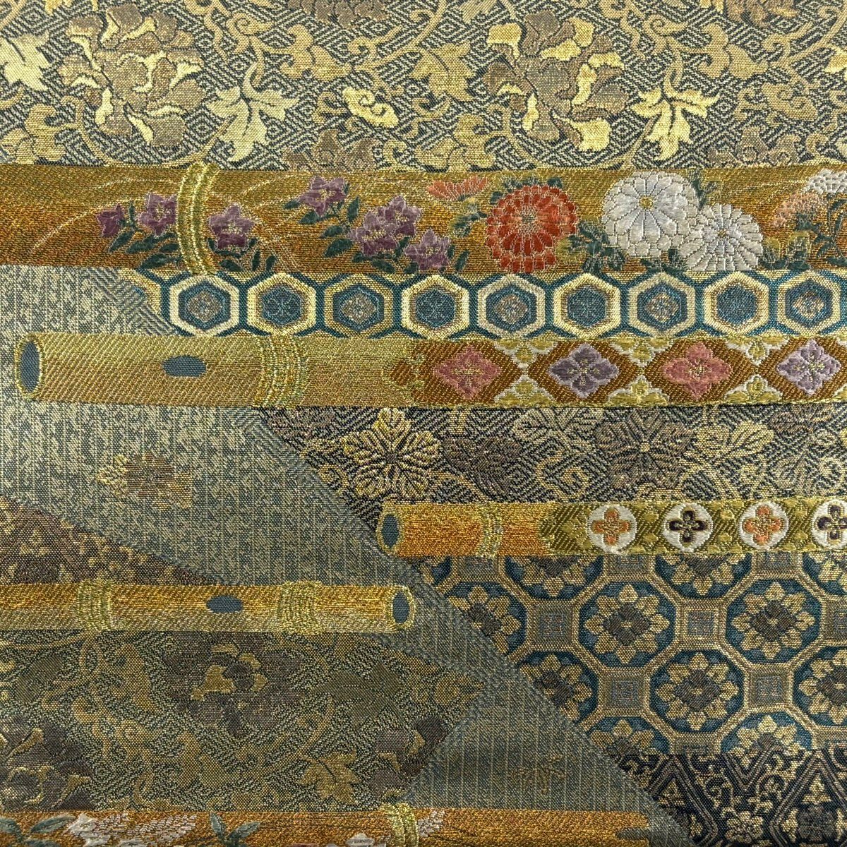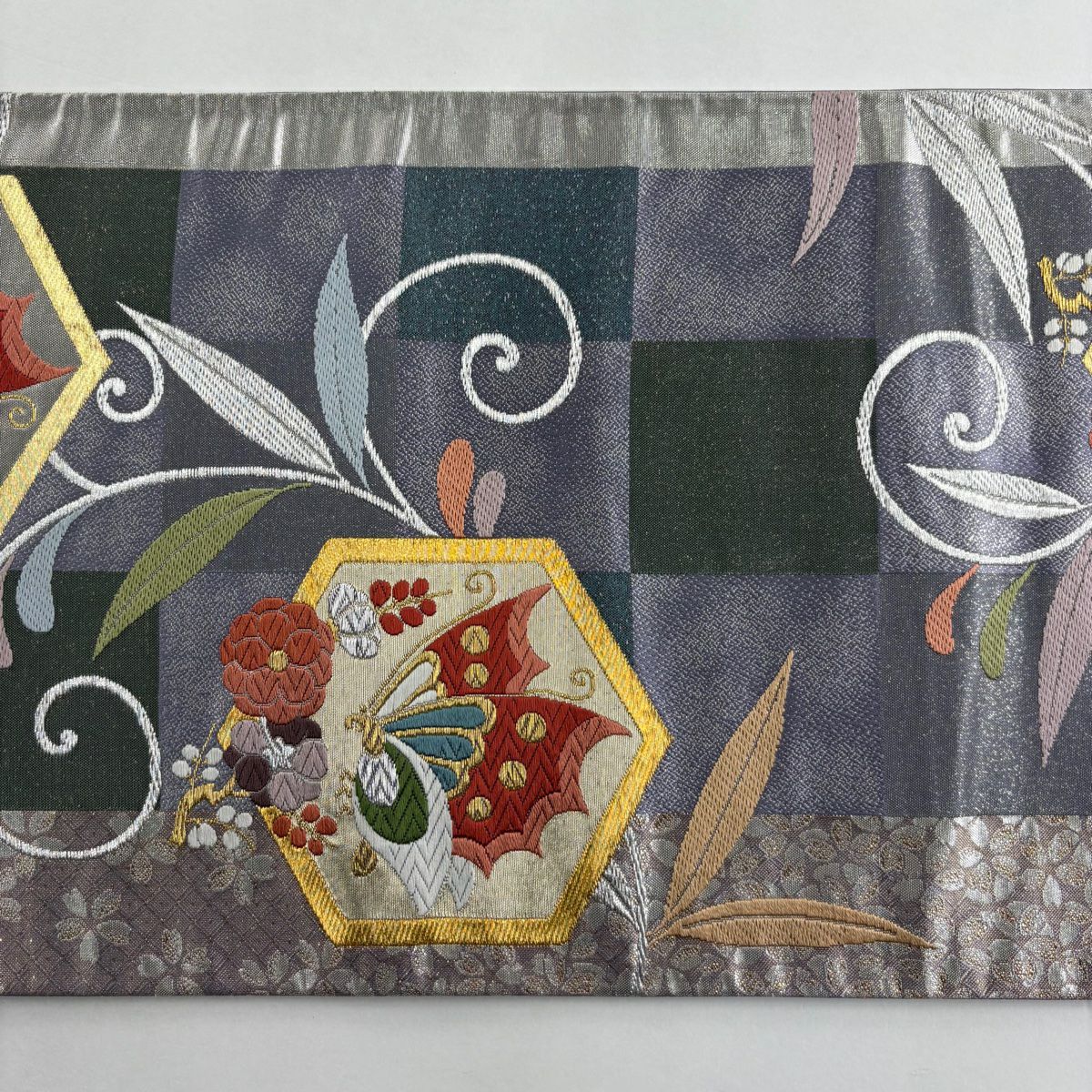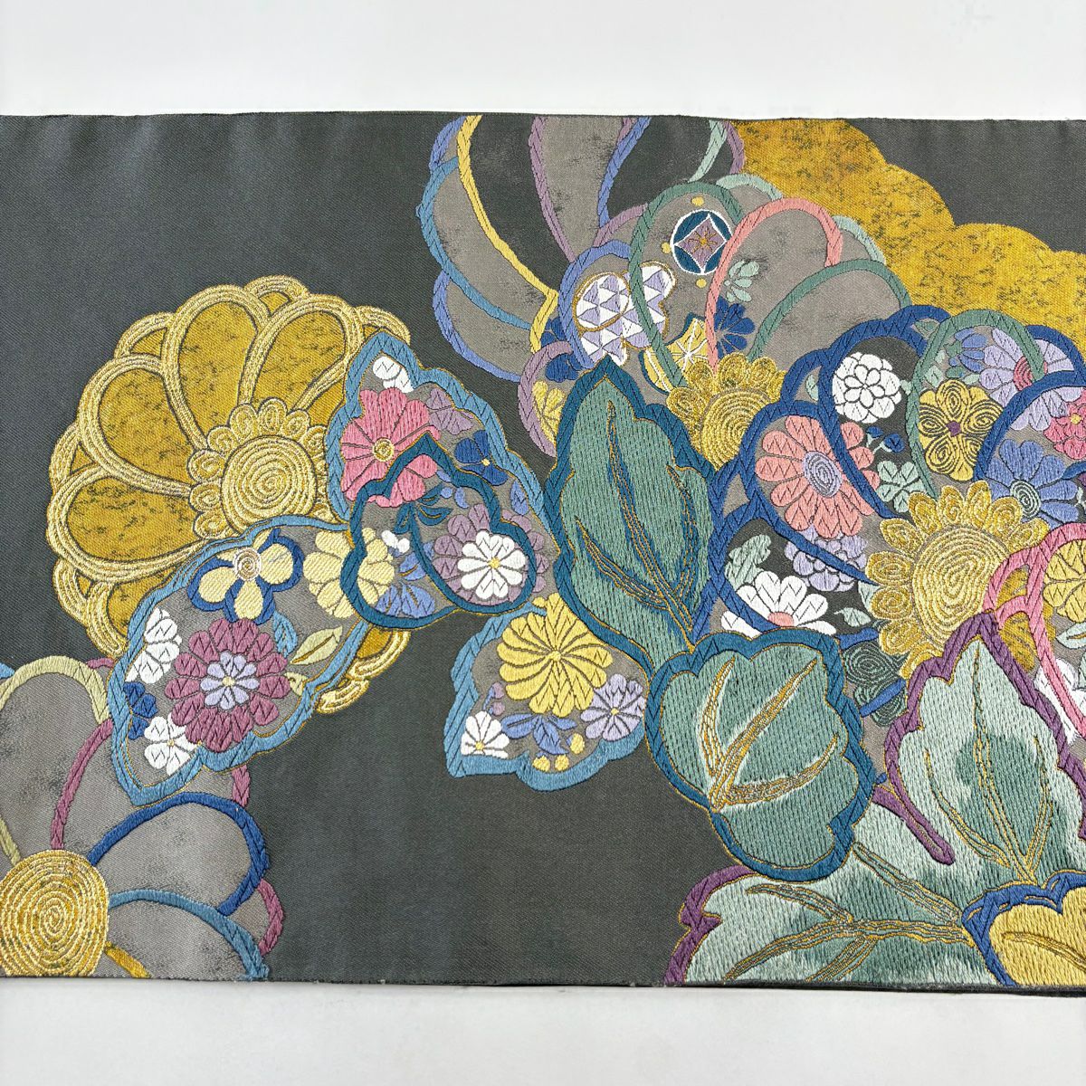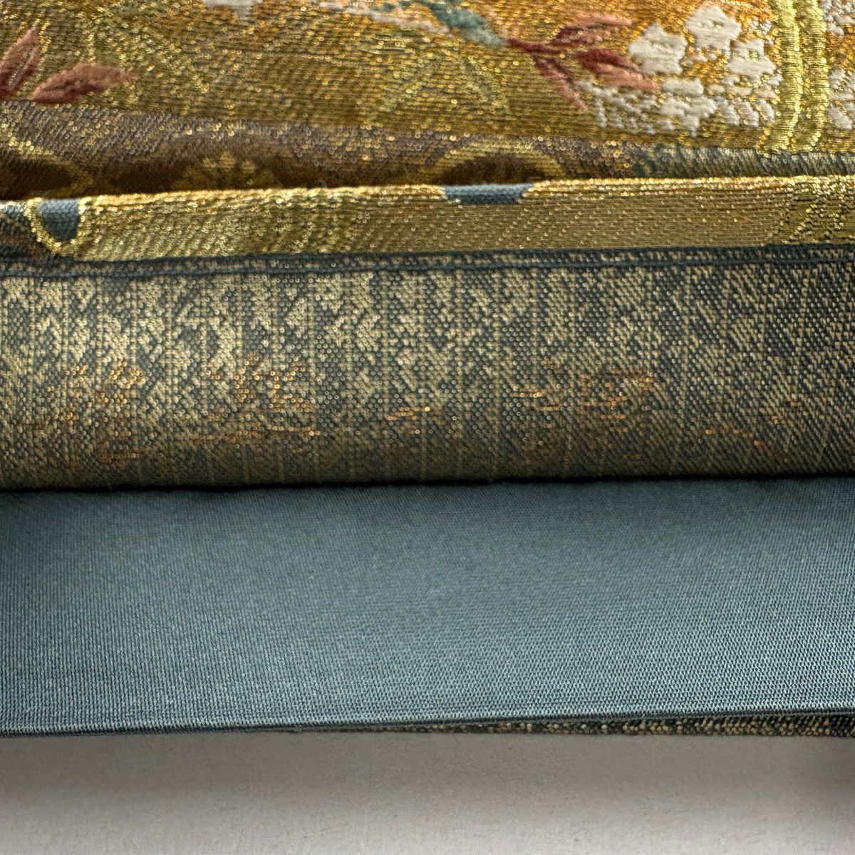 【最終値引き】 70%OFF 袋帯 秀品 国風錦 関西仕立て 菊 草花 唐織 箔 灰緑 六通 正絹 K70