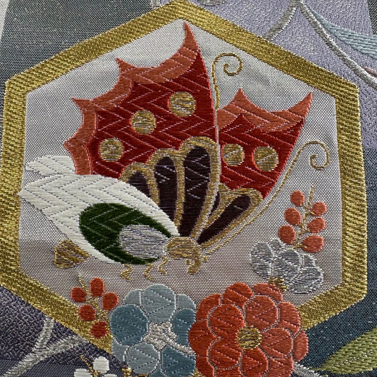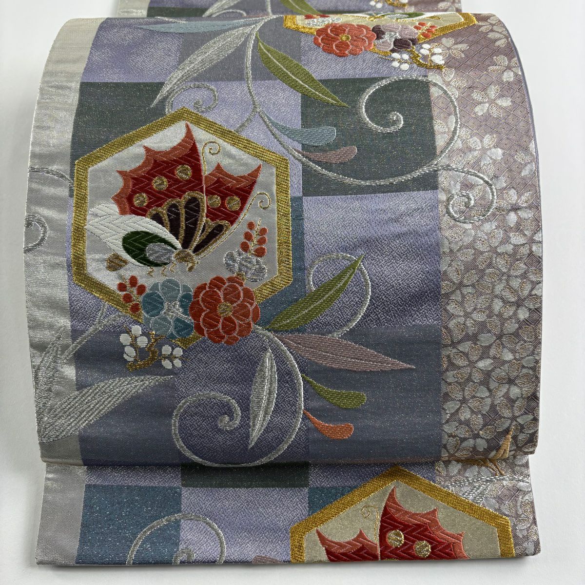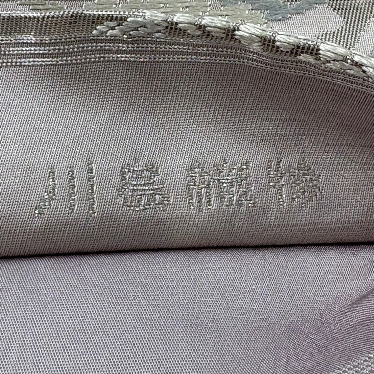 【最終値引き】 70%OFF 袋帯 秀品 川島織物 落款あり 菊 松 唐織 銀糸 灰紫 六通 正絹 K70
