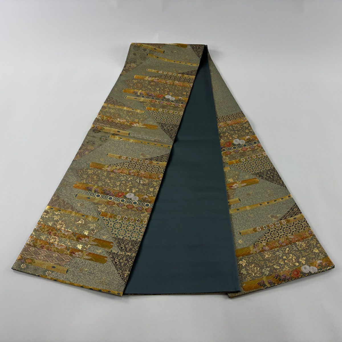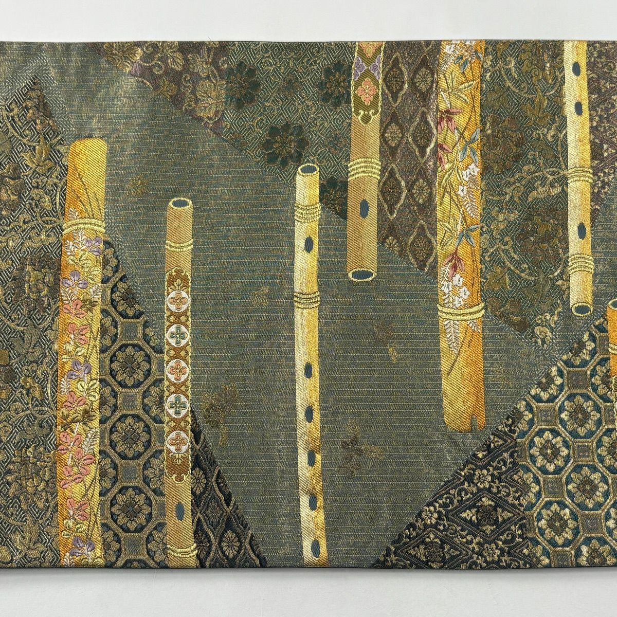 【最終値引き】 77%OFF 【美品】 袋帯 秀品 雅楽の調べ 笛 秋草 金糸 箔 灰緑 六通 正絹 K70