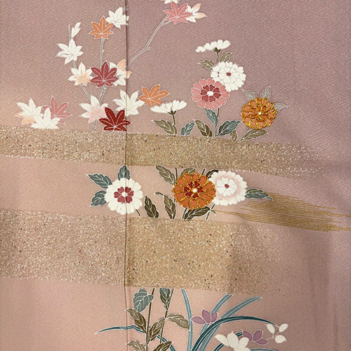 【在庫一掃】 訪問着 身丈161.5cm 裄丈64cm M 袷 御所車 秋草 金糸 金彩 ピンク 正絹 秀品