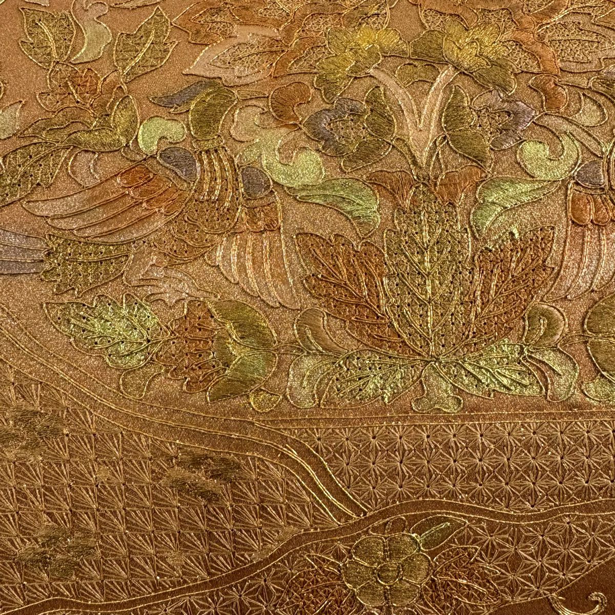 【最終値引き】 77%OFF 【美品】 袋帯 秀品 花鳥 華文 箔 金銀糸 ベージュ 六通 正絹 K70
